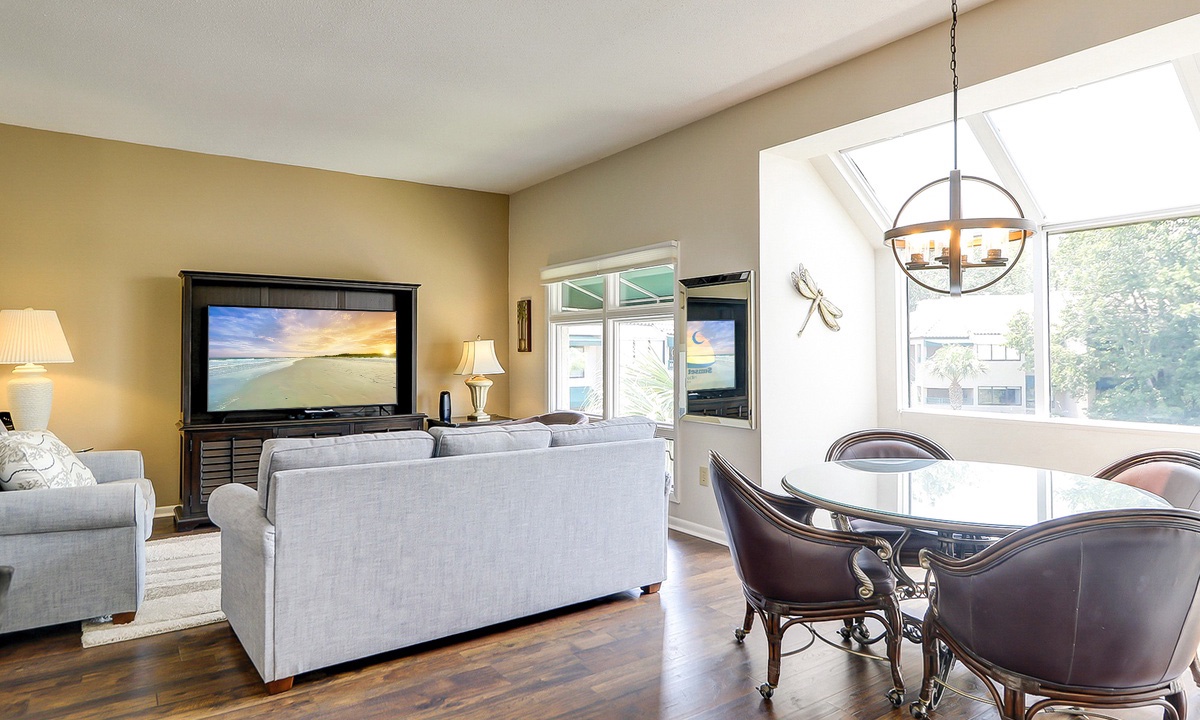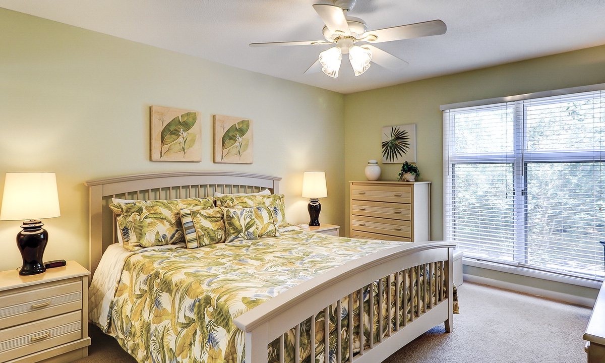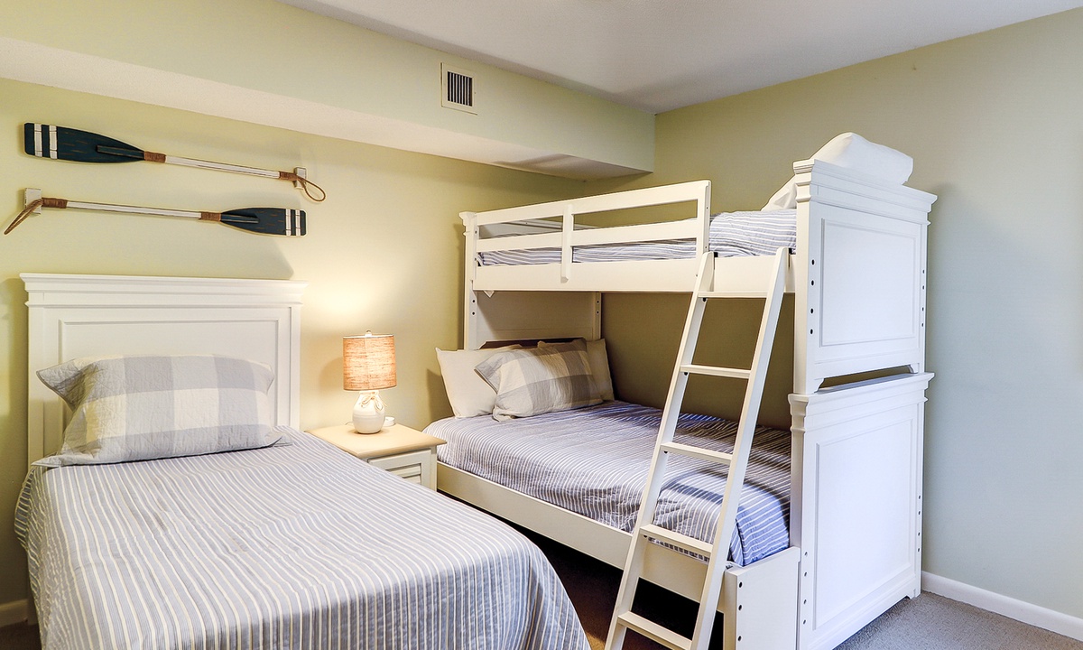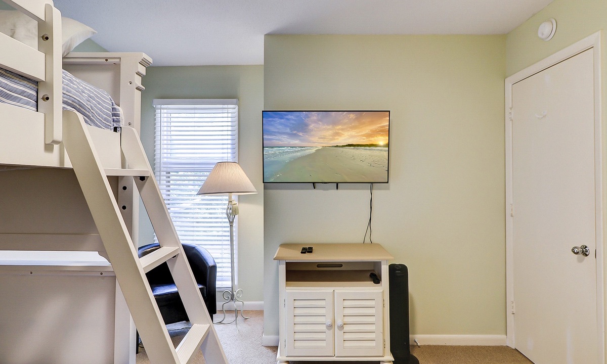 This Palmetto Dunes condo sleeps 6 guests in 2 comfortable bedrooms. The primary bedroom has a king bed, flat-screen TV and a private remodeled bathroom with a walk-in shower. The guest bedroom has a twin bed and a bunk bed with a full bed on the bottom and a twin on top This room has and access to a renovated hall bathroom with a walk-in shower.