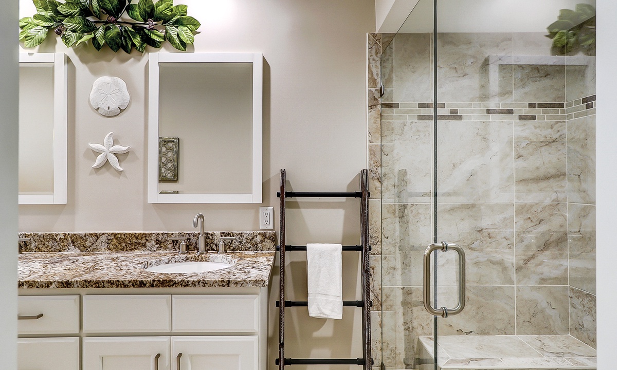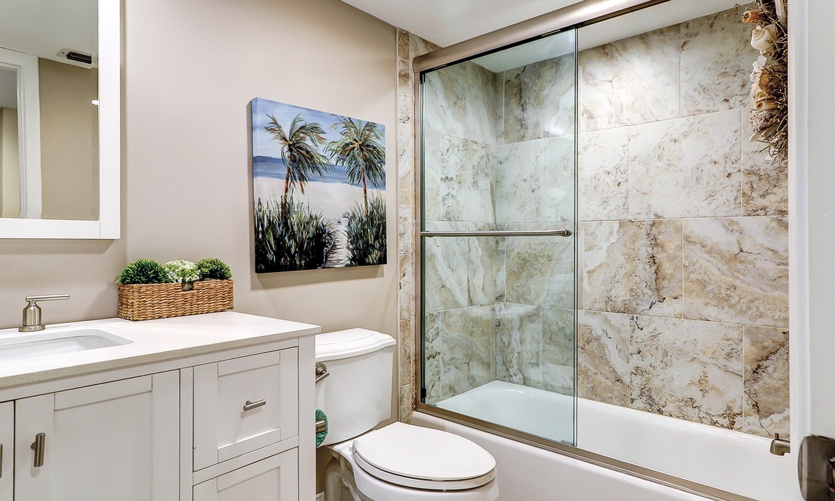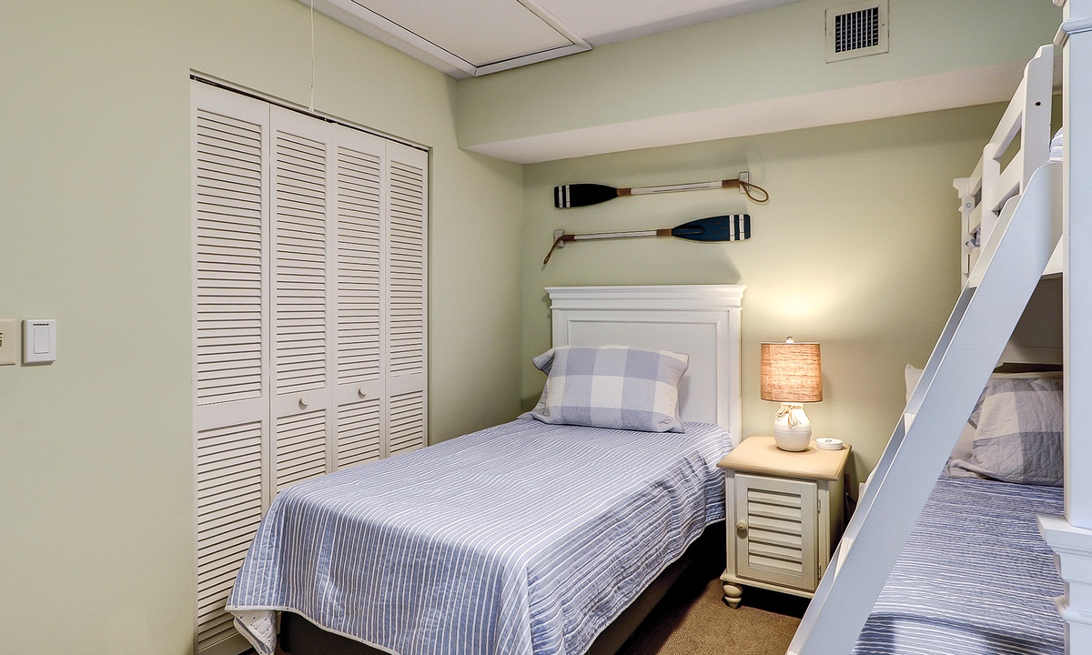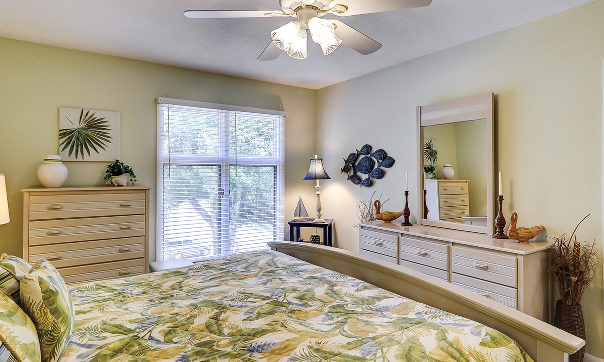 This Palmetto Dunes condo sleeps 6 guests in 2 comfortable bedrooms. The primary bedroom has a king bed, flat-screen TV and a private remodeled bathroom with a walk-in shower. The guest bedroom has a twin bed and a bunk bed with a full bed on the bottom and a twin on top This room has and access to a renovated hall bathroom with a walk-in shower.