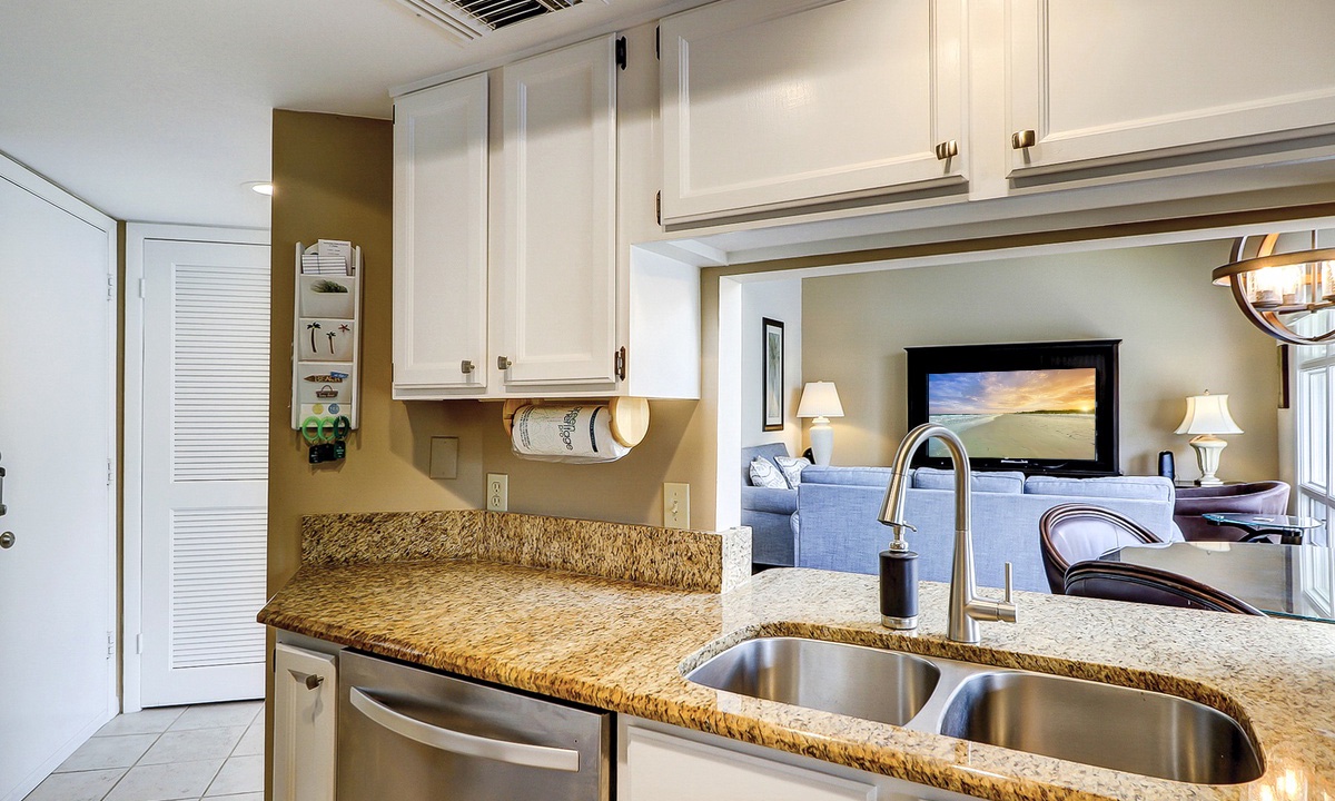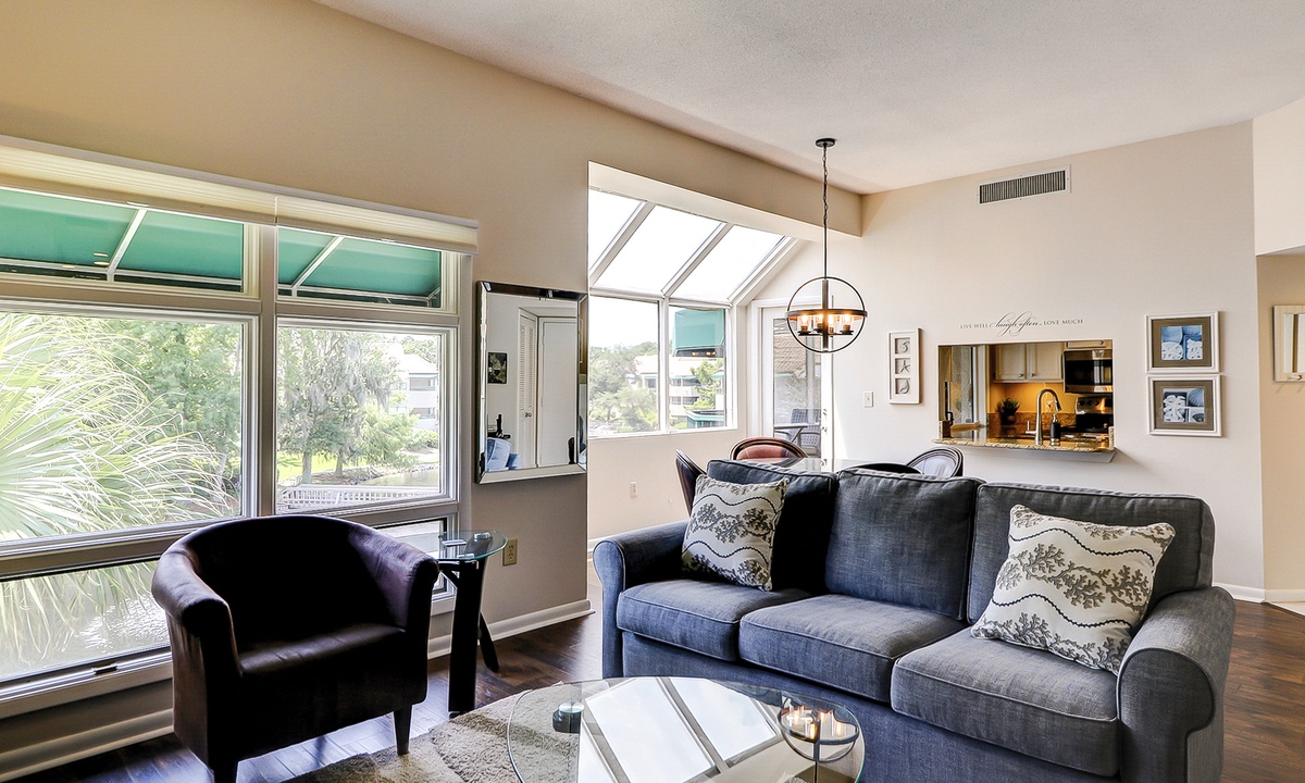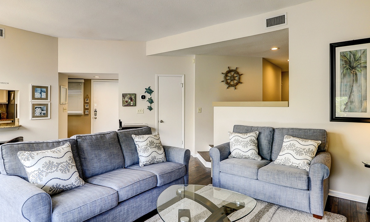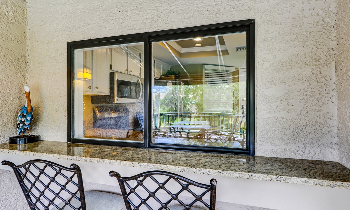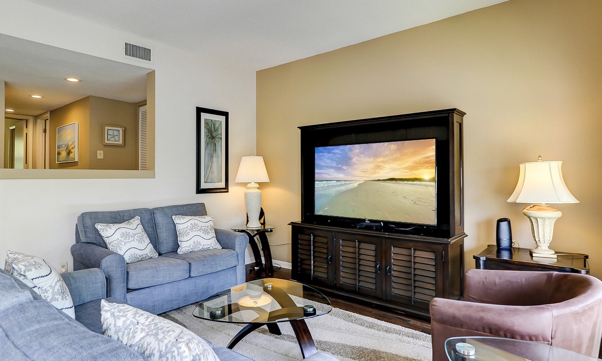 The living area has comfortable seating with a queen size pullout sofa bed, a flat-screen TV and is open to the dining area that has seating for four. The well-appointed kitchen has everything needed to cook meals for your guests, as well as a window that functions as a pass-thru to the balcony.