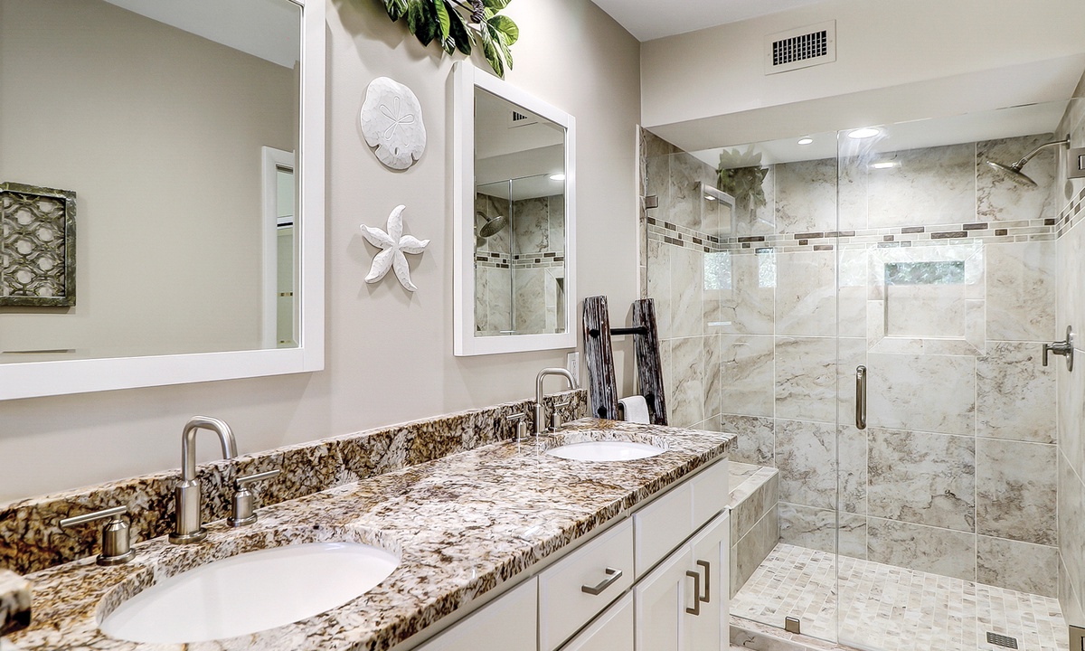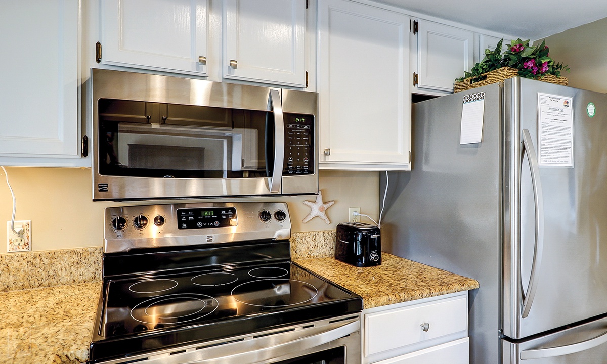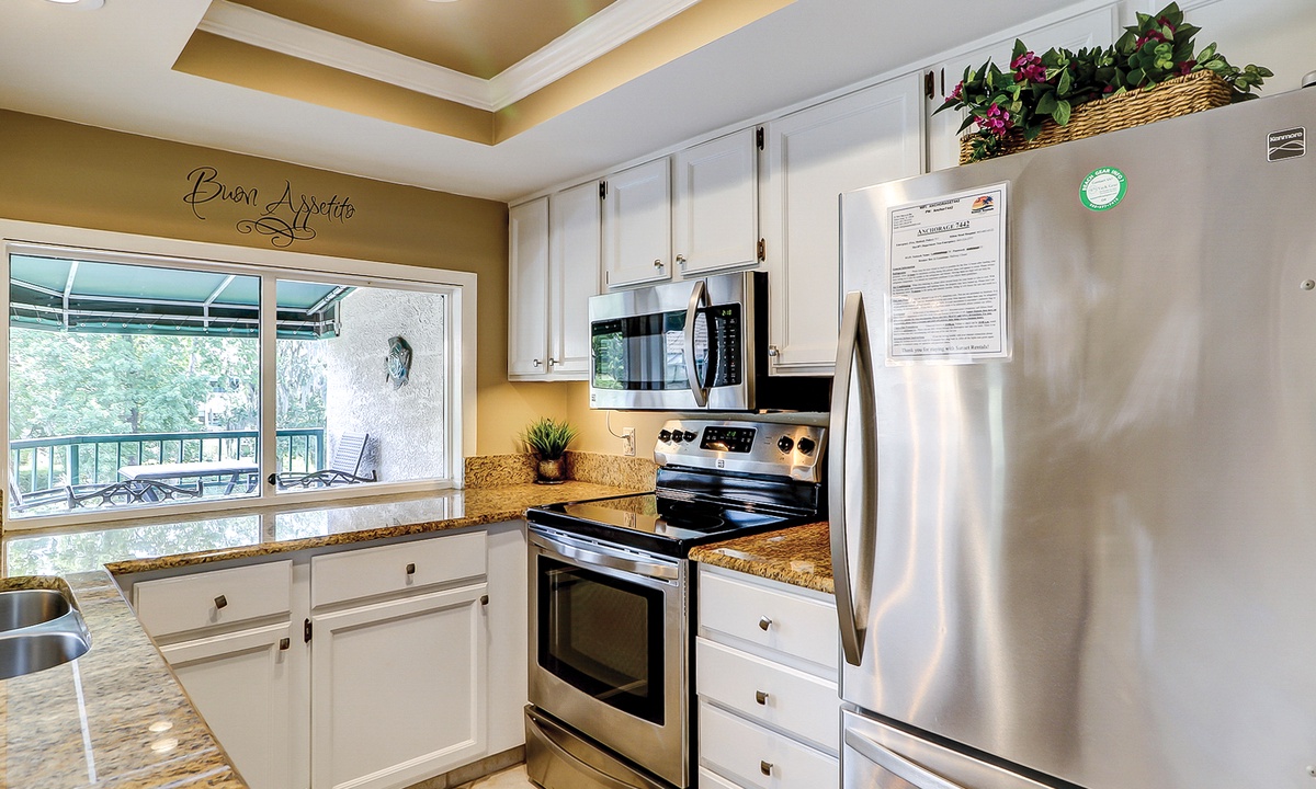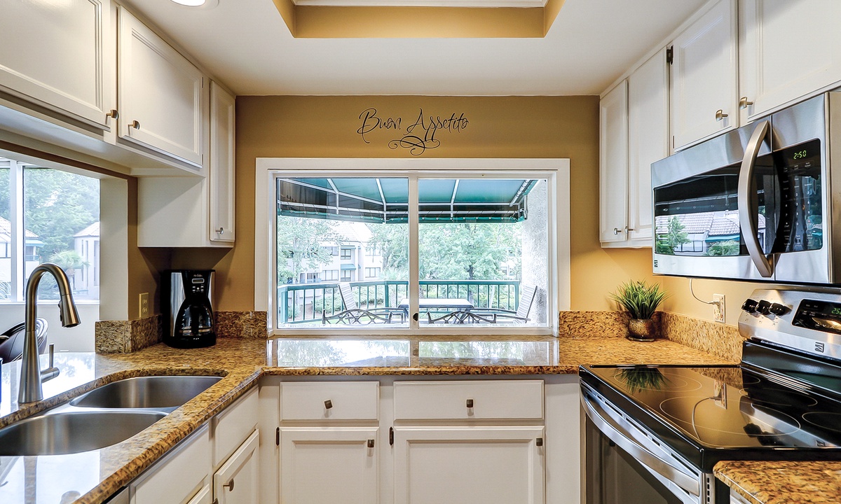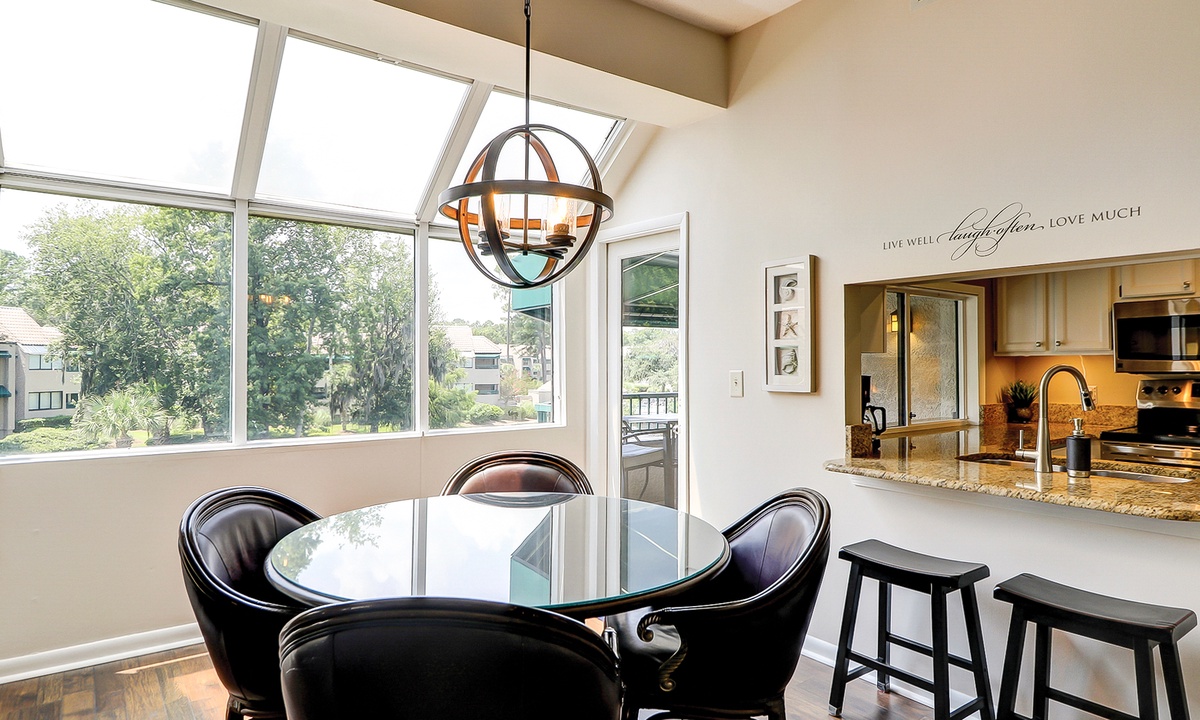 The living area has comfortable seating with a queen size pullout sofa bed, a flat-screen TV and is open to the dining area that has seating for four. The well-appointed kitchen has everything needed to cook meals for your guests, as well as a window that functions as a pass-thru to the balcony.
