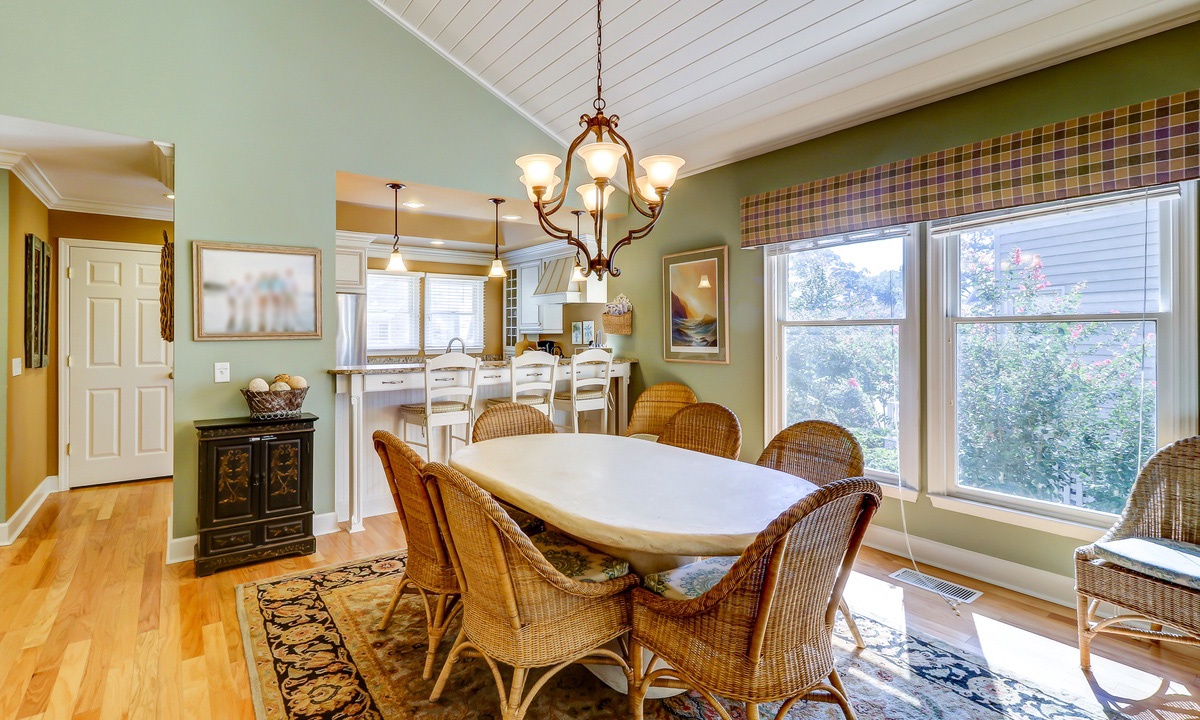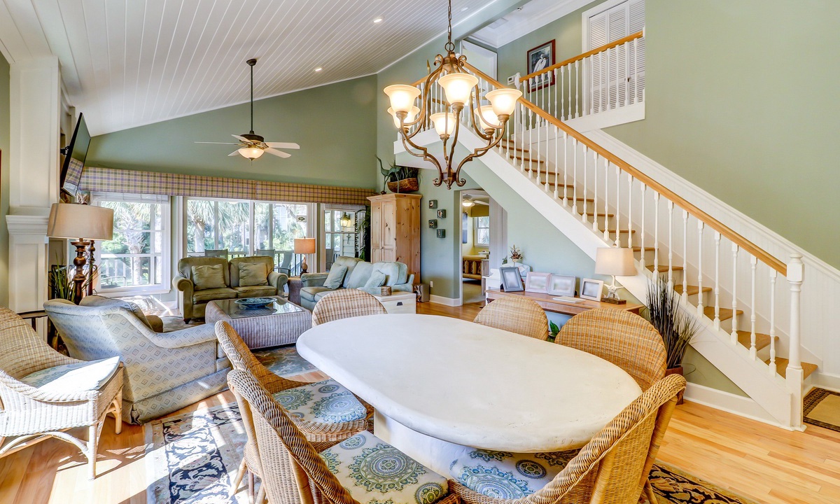 This elevated home has an open floor plan that’s perfect for vacationing with family or friends. The equipped kitchen includes stainless steel appliances, granite counters and custom cabinetry. The dining area has seating for 6 + 2 additional chairs, and 3 bar stools at the breakfast bar.