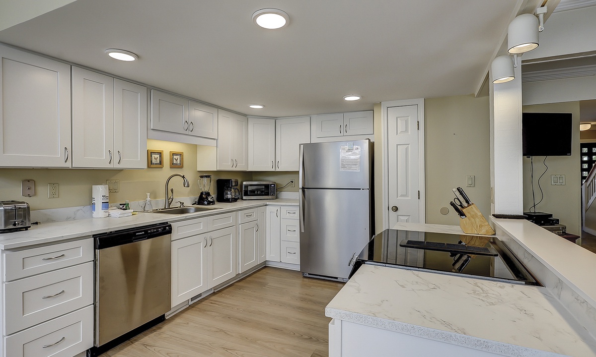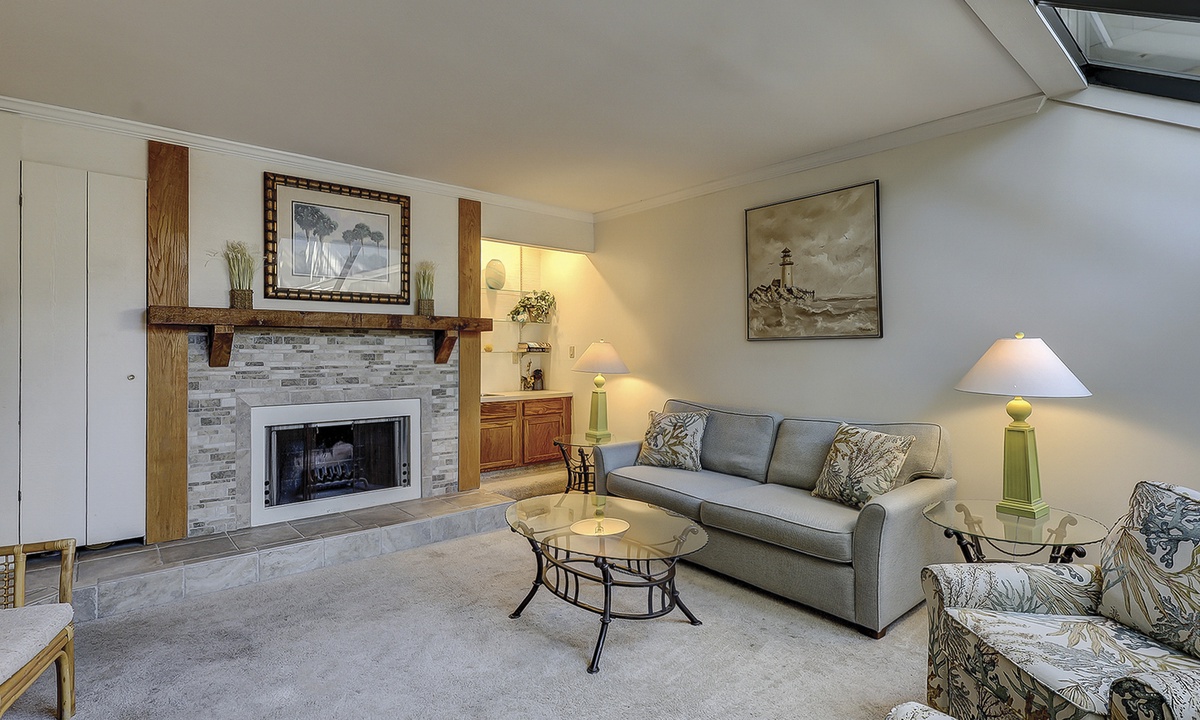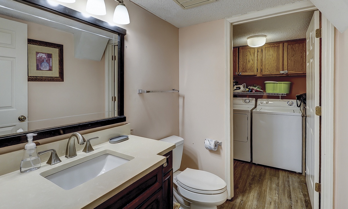 Upon entering the home, you'll find a cozy den to your left featuring a TV, wet bar, and queen sleeper sofa—perfect for additional guests or a quiet reading nook. (Please note: the fireplace is decorative only and not for guest use.) Continue down the hall to a convenient powder room with full-size washer and dryer.