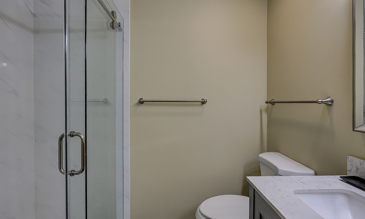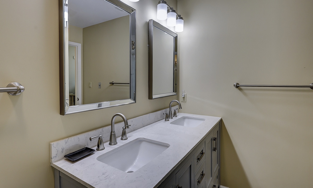 Upstairs, the home comfortably sleeps 8 guests across three bedrooms. The primary suite features a king bed, flat-screen TV, and en-suite bathroom with dual vanities. The second bedroom includes two twin beds and a flat-screen TV, with a full bathroom just outside in the hallway. The third bedroom offers a queen bed and private bath, providing everyone with their own space to unwind.