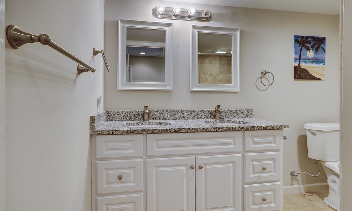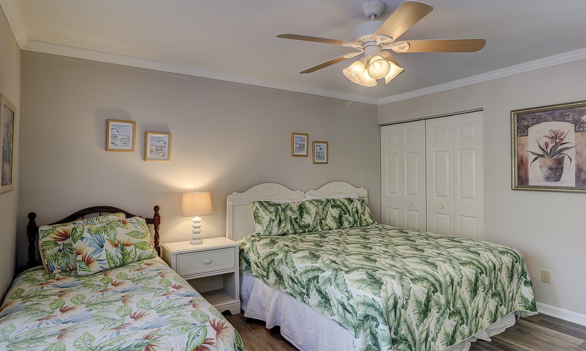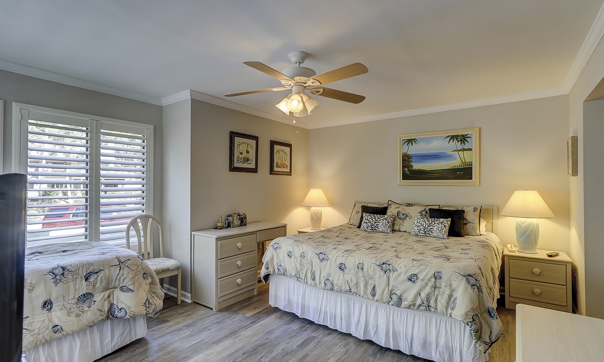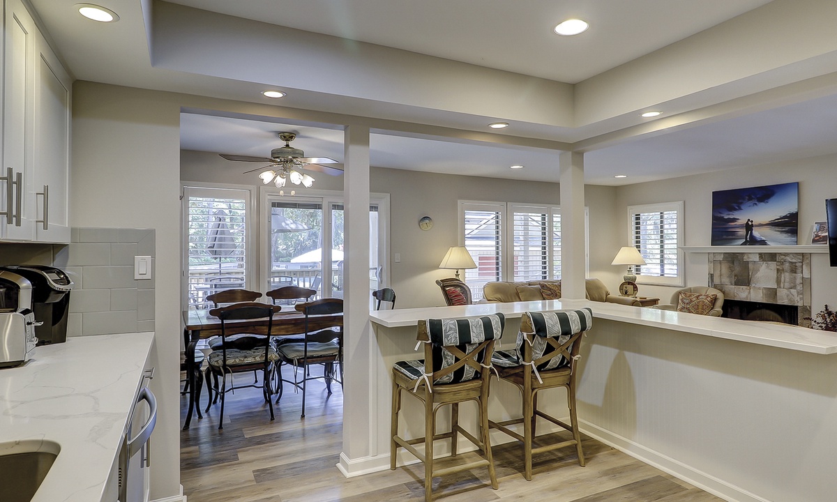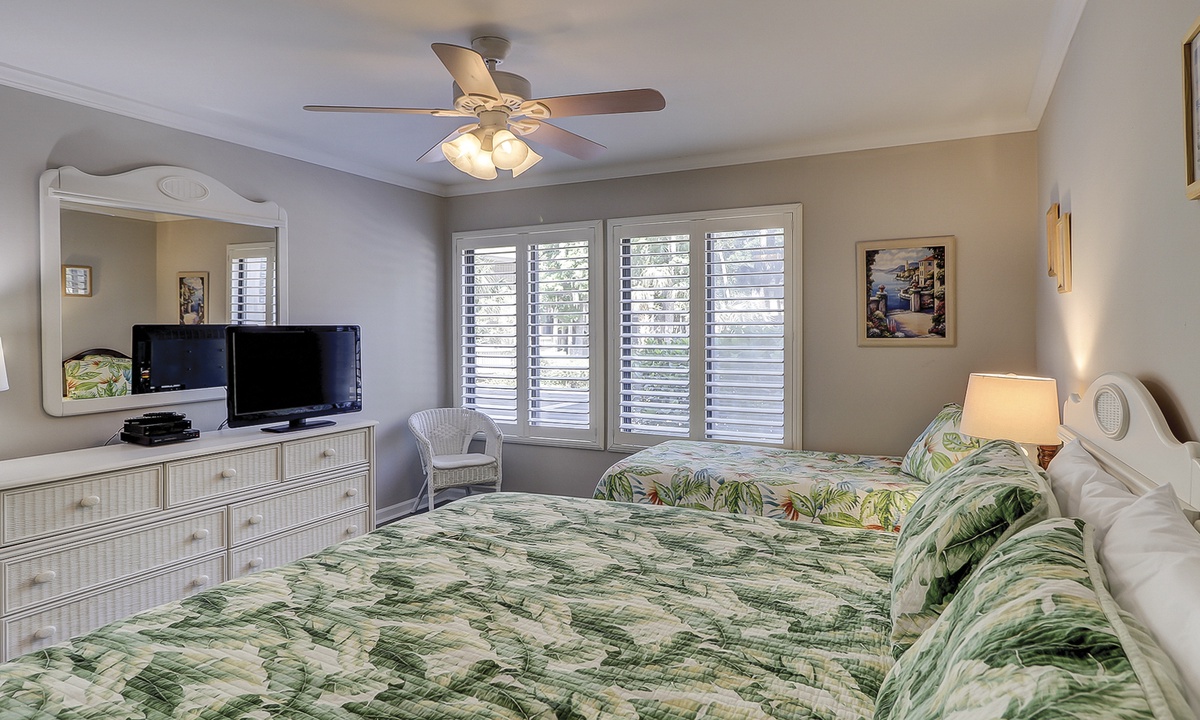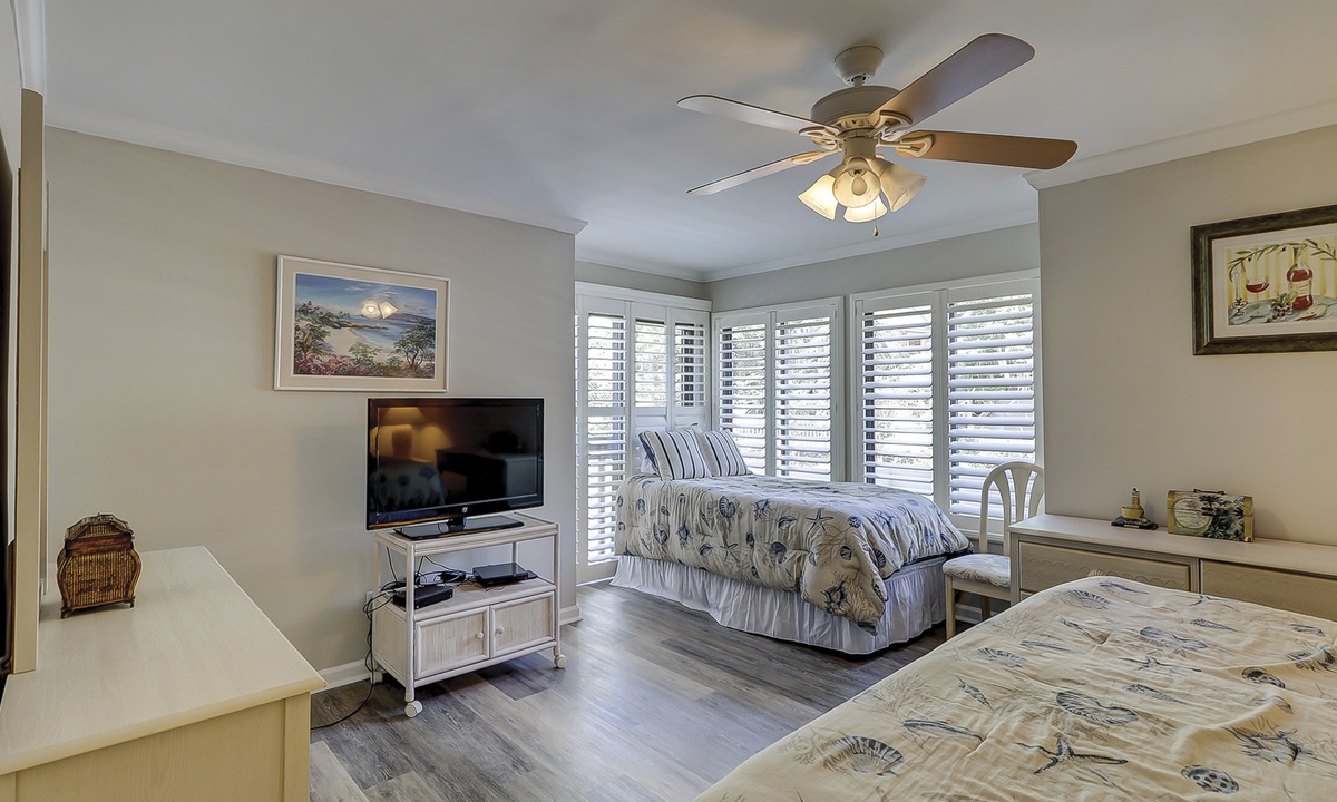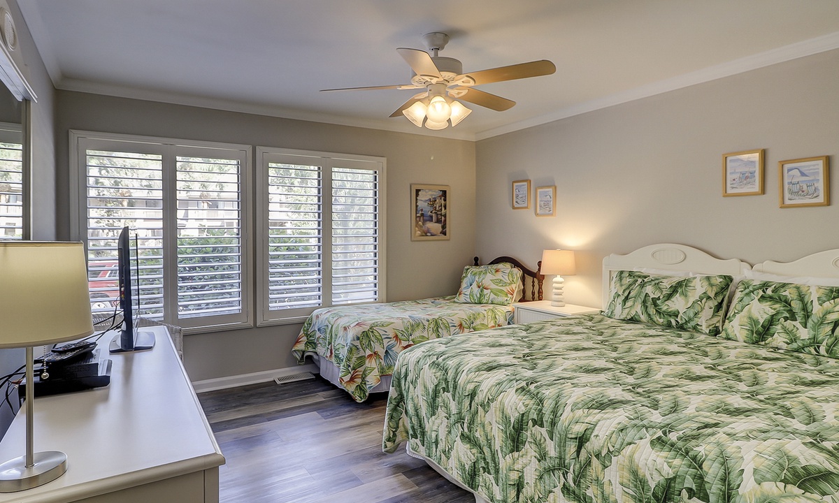 Both bedrooms in this villa offer king size beds, allowing two families to enjoy comfortable and spacious sleeping quarters while on vacation. To the right you will find the guest bedroom with two beds, one king size and one twin size and 32” flat screen TV and a DVD player. Just outside of this bedroom you will find the updated hall bathroom with luxury tile floors, double vanity with granite countertops and a tub/shower combination perfect for washing off after a hot day of exploring Hilton Head Island.