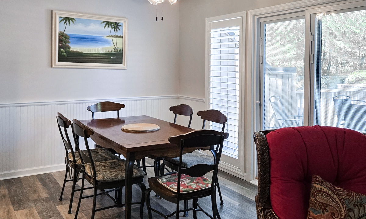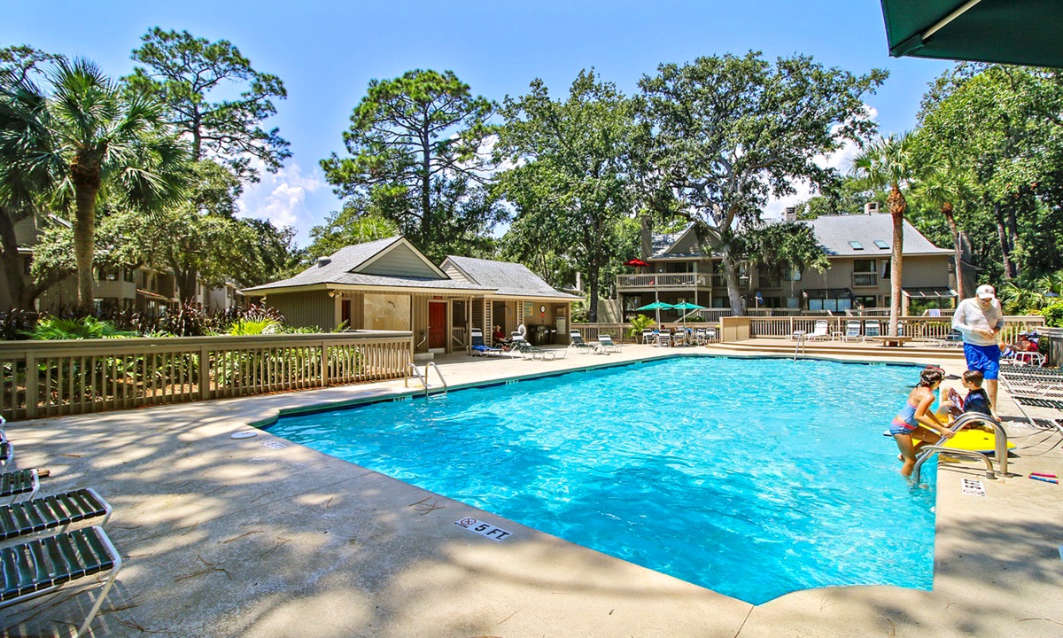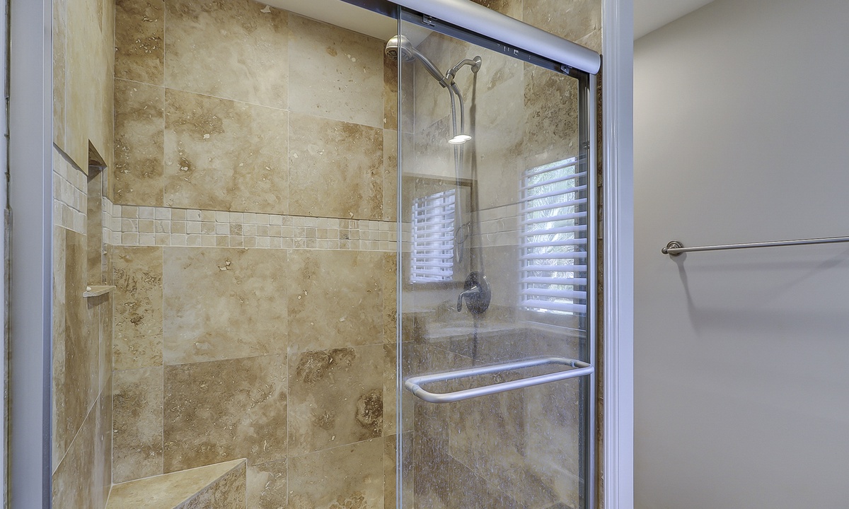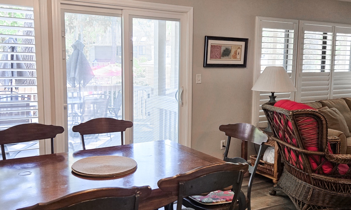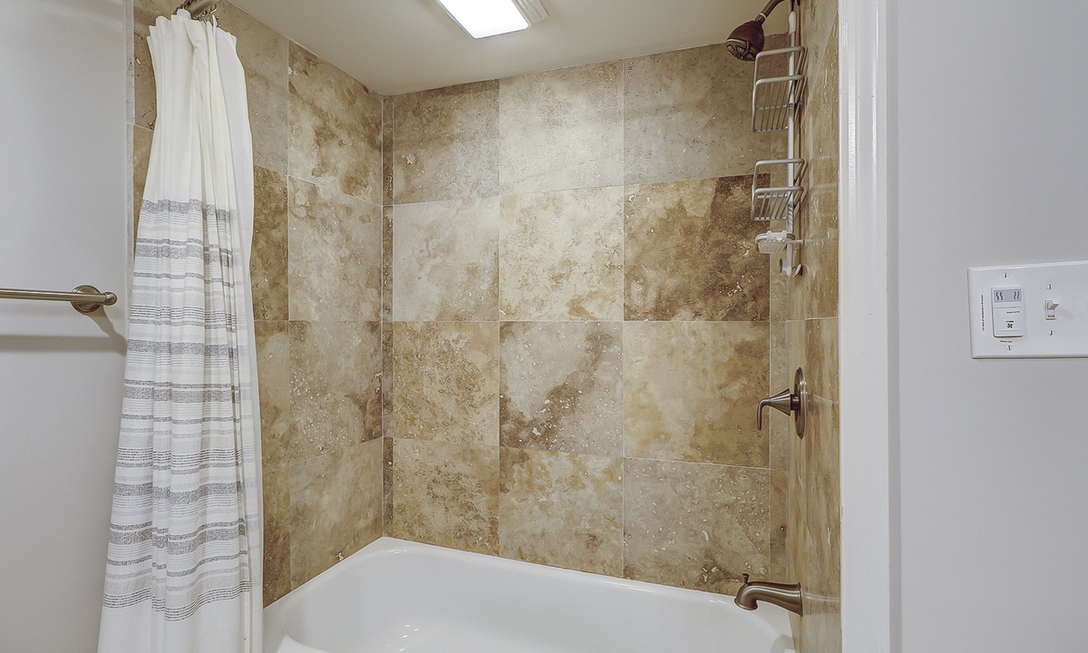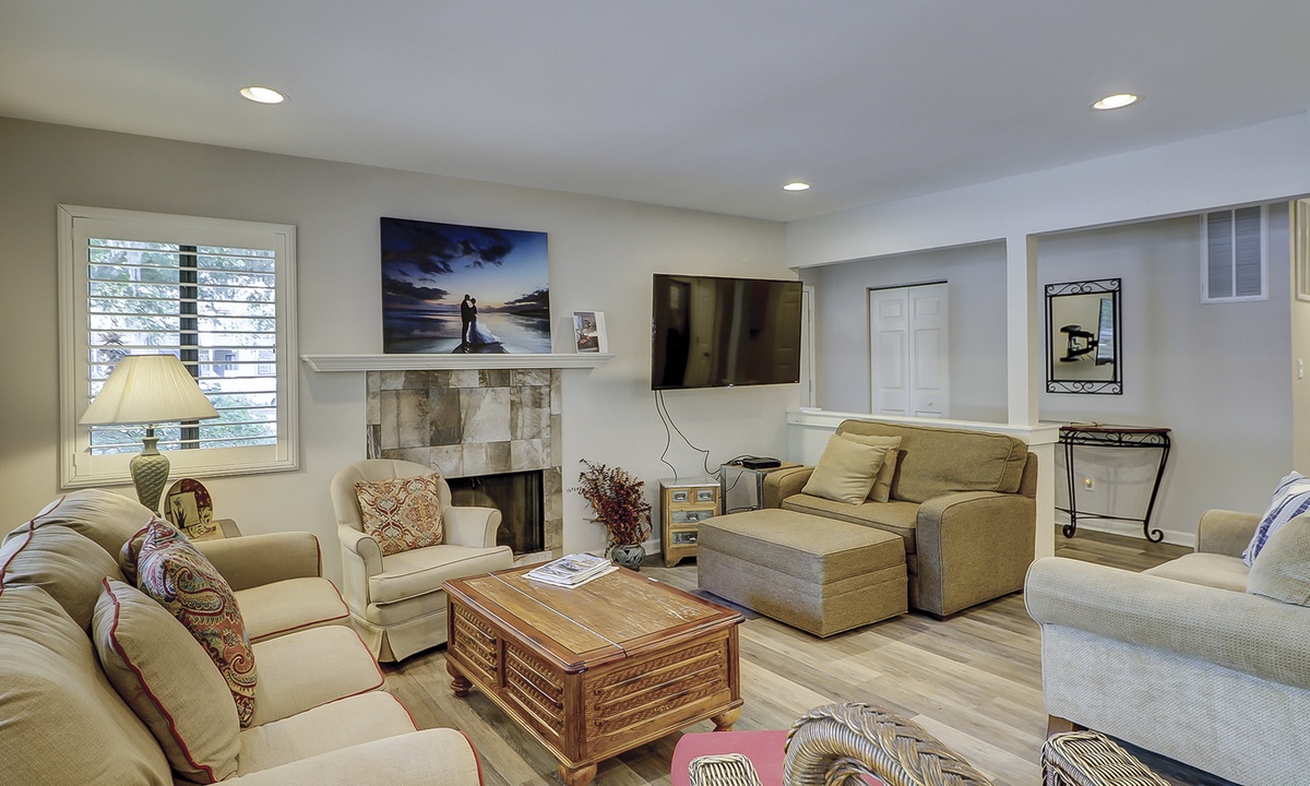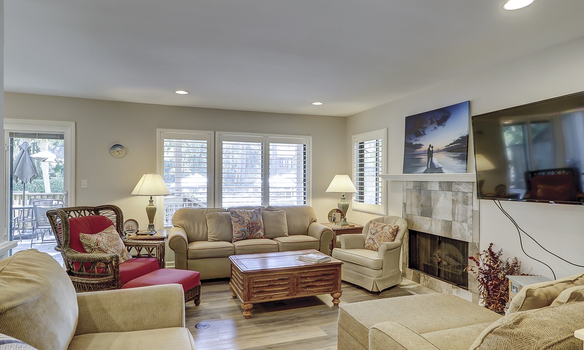 Both bedrooms in this villa offer king size beds, allowing two families to enjoy comfortable and spacious sleeping quarters while on vacation. To the right you will find the guest bedroom with two beds, one king size and one twin size and 32” flat screen TV and a DVD player. Just outside of this bedroom you will find the updated hall bathroom with luxury tile floors, double vanity with granite countertops and a tub/shower combination perfect for washing off after a hot day of exploring Hilton Head Island.