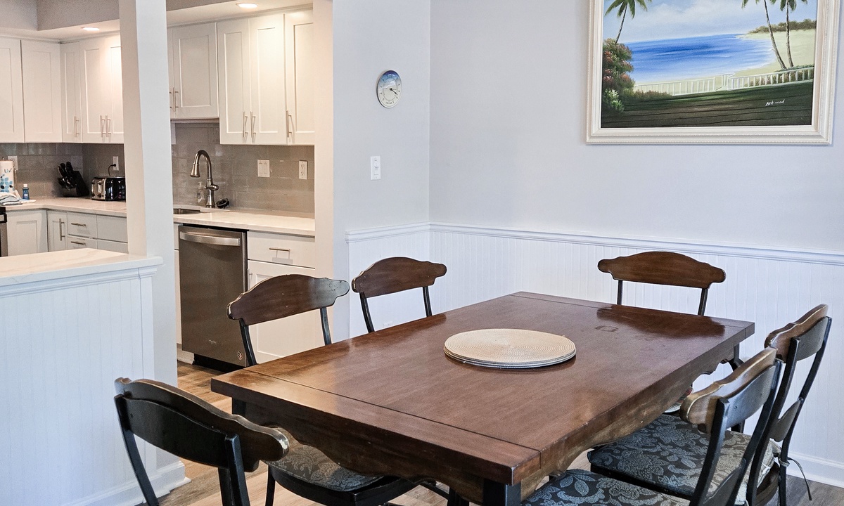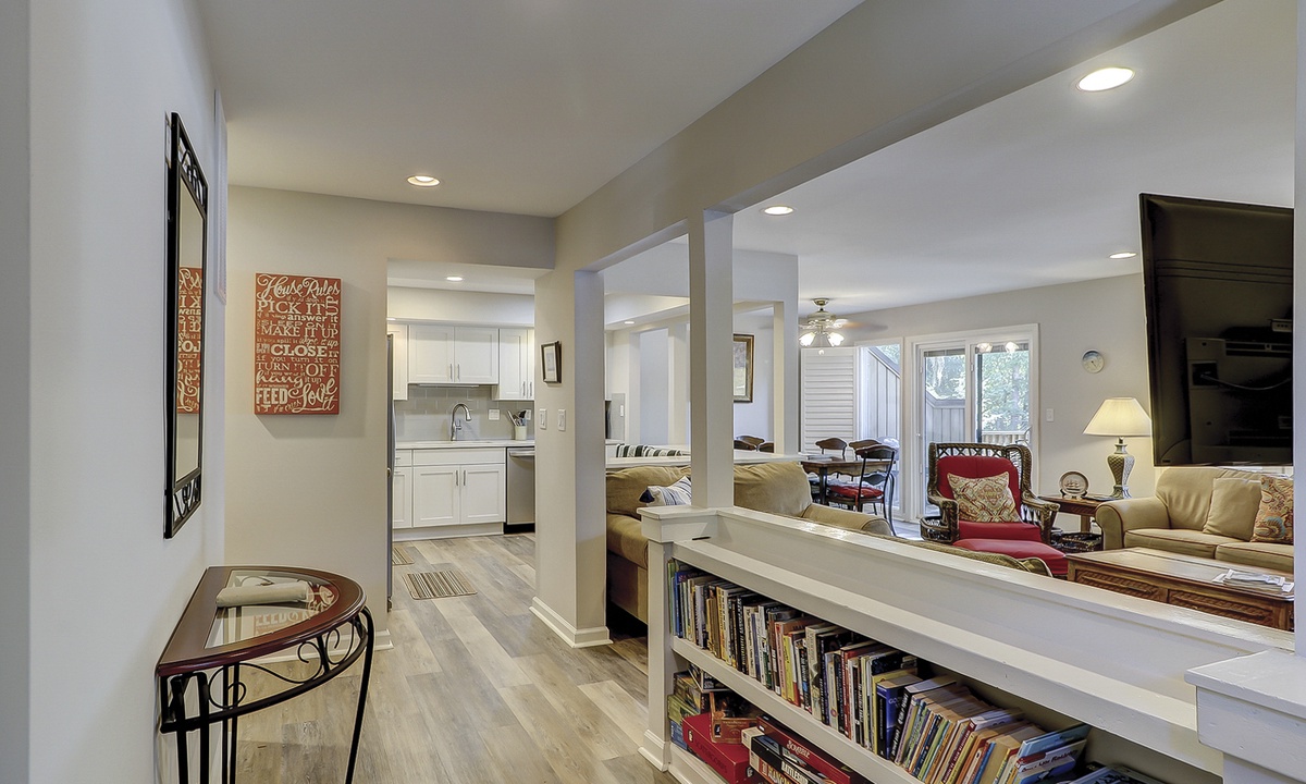The foyer greets you with plenty of books in the long bookshelf as well as plenty of games in the hall closet to keep the kids busy at any time of day. The entry seamlessly flows to the rest of the villa with newly upgraded premium cortex vinyl wood flooring throughout the entry, living room, kitchen, dining area, and bedrooms.