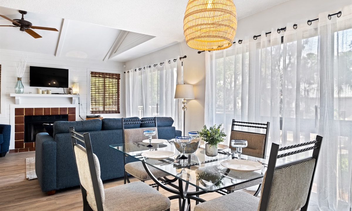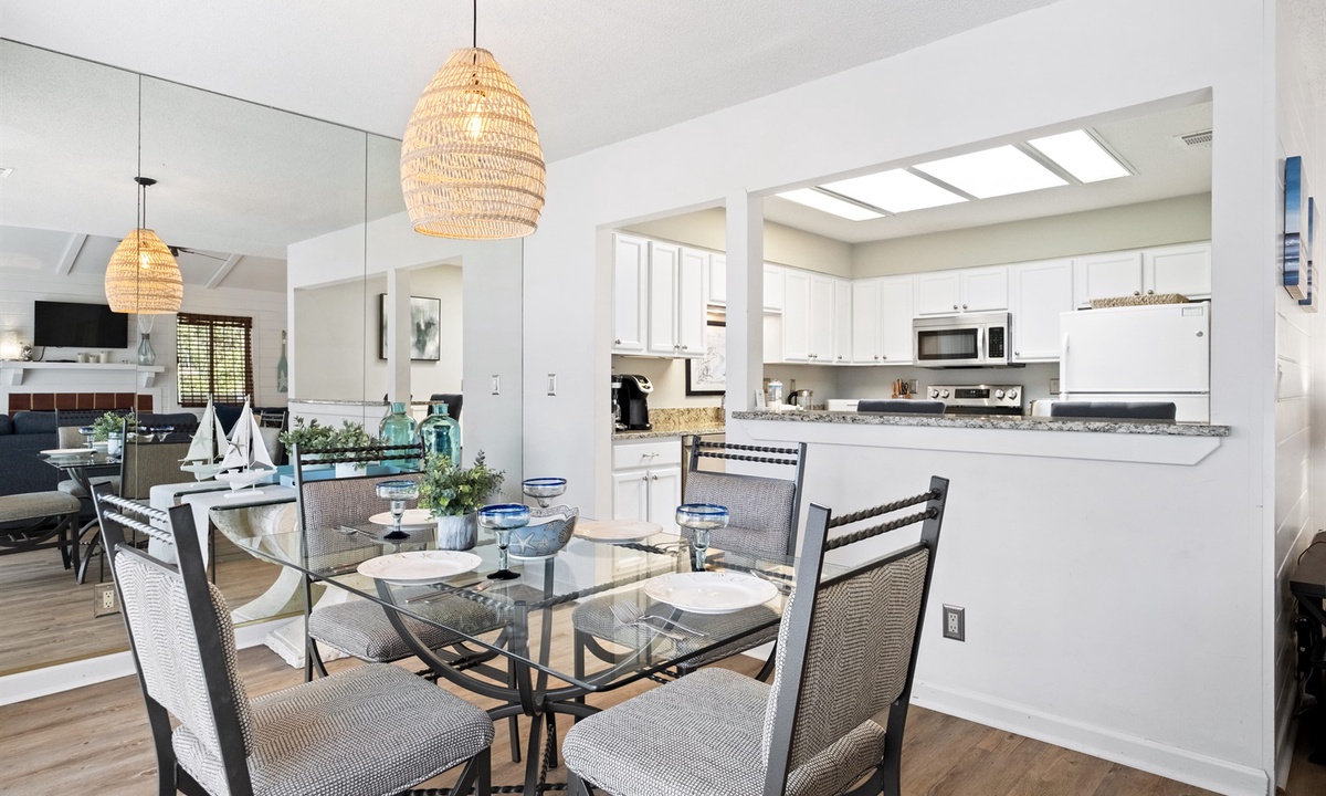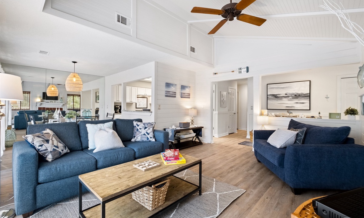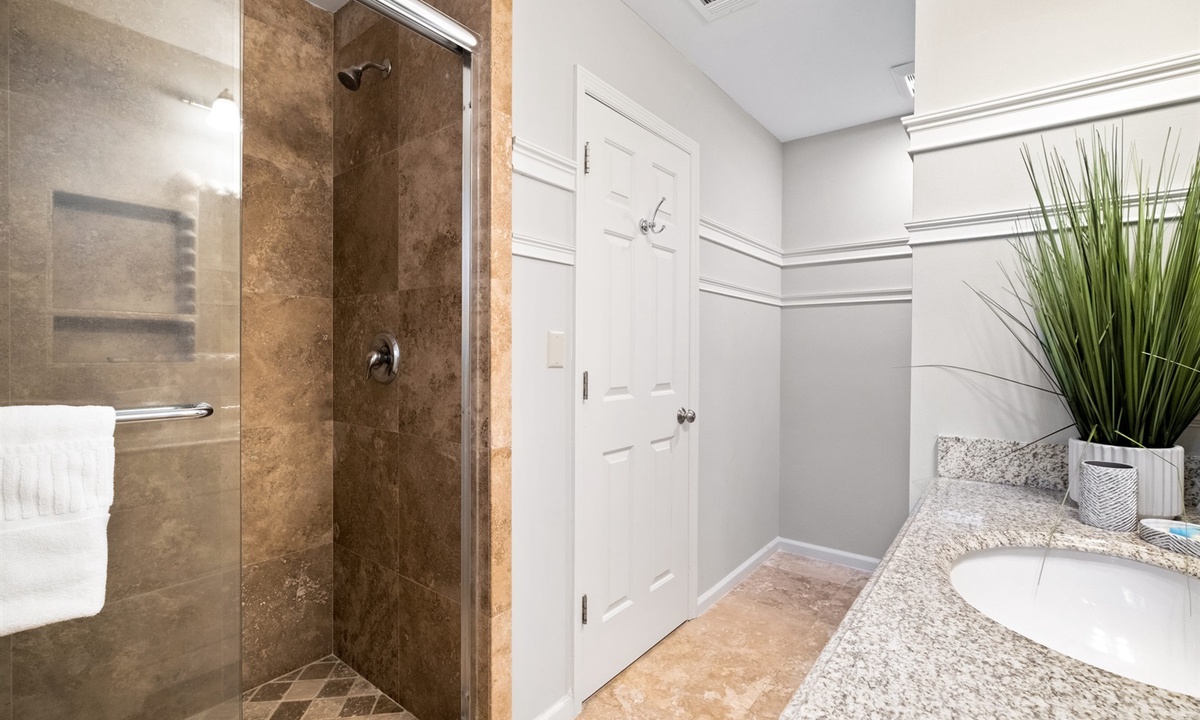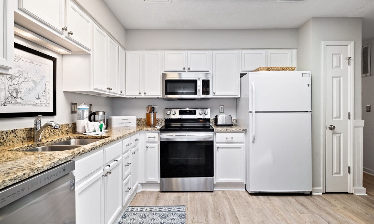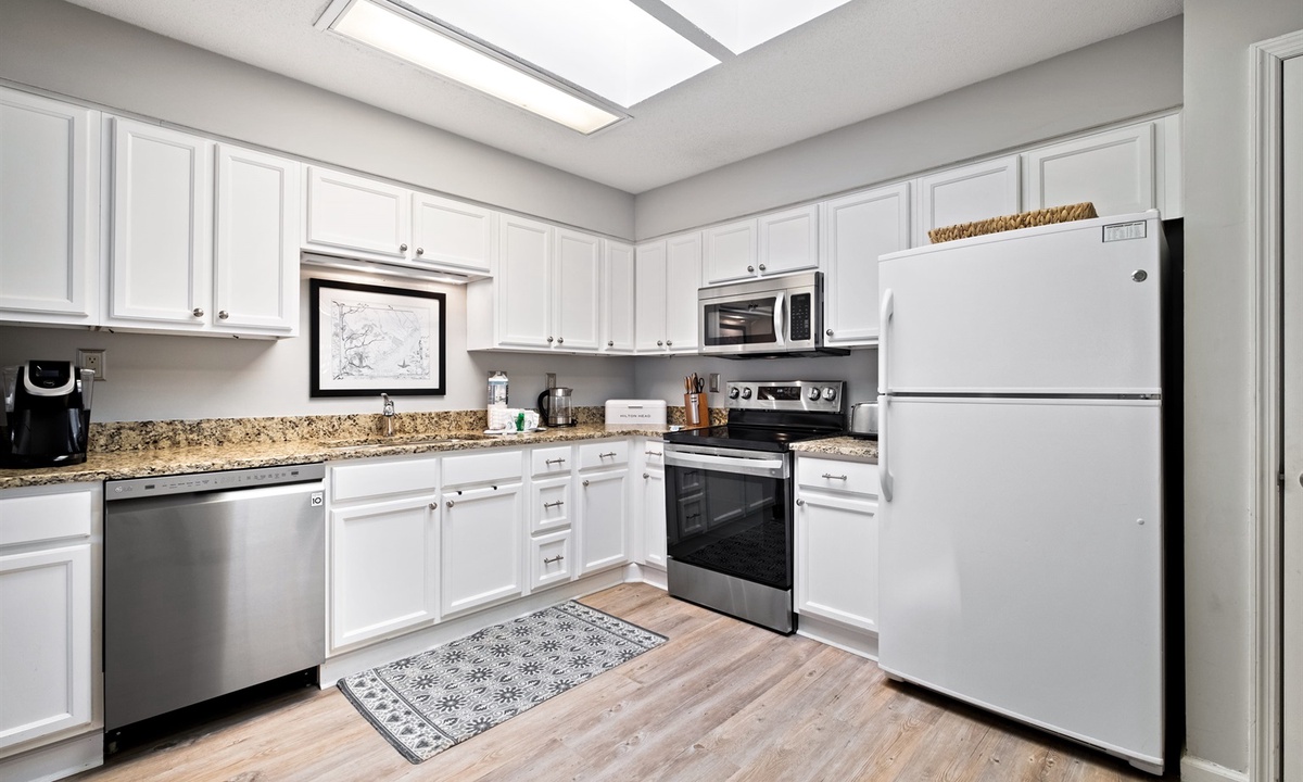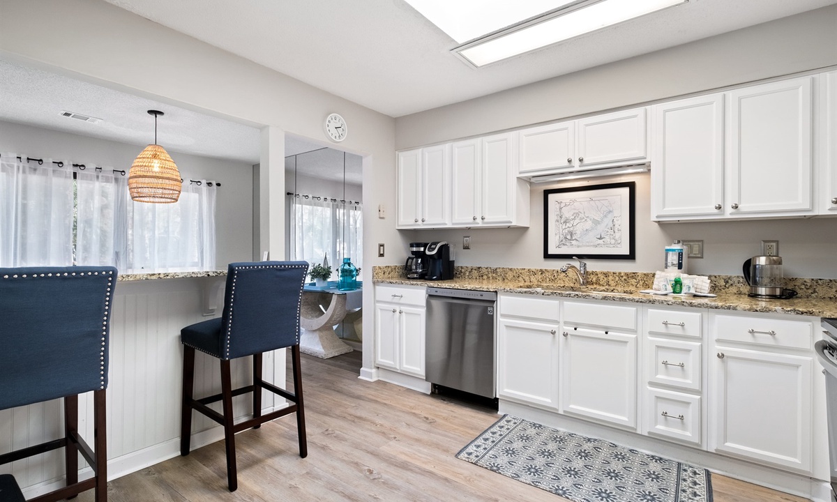 The spacious living room has a vaulted ceiling with both a Queen-size sofabed and large “chair and a half” that converts into a Single sleeper. The large kitchen has granite countertops and is fully equipped including newer stainless-steel appliances. There is a separate full-size dining area as well as a breakfast bar area with two additional seats. Both bathrooms have granite countertops and large showers with travertine stone tile and detachable showerheads. The entire unit has been recently upgraded with attractive LVP flooring. Most of the major appliances and equipment (AC/Heat Pump, WiFi thermostat, hot water heater) are less than 5 years old.