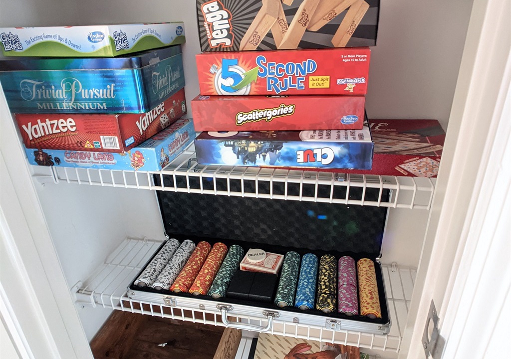 • The “Games” closet has lots of games for family fun -- including Chess, Scattergories, Yahtzee, Trivial Pursuit, Candyland, Clue, “Hilton Head-opoly”, and jigsaw puzzles. Even a professional 500 piece poker chip set. This is also where a computer monitor is stored when it isn’t being used in the BR “remote office” area.