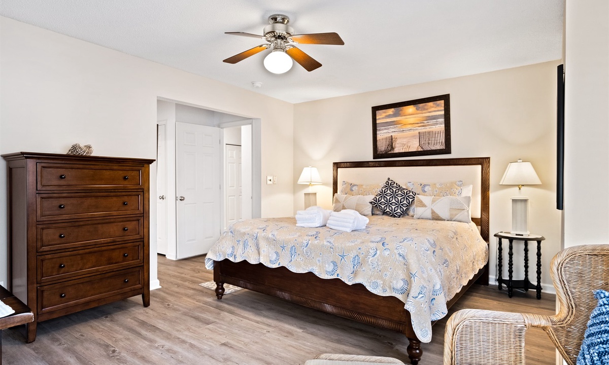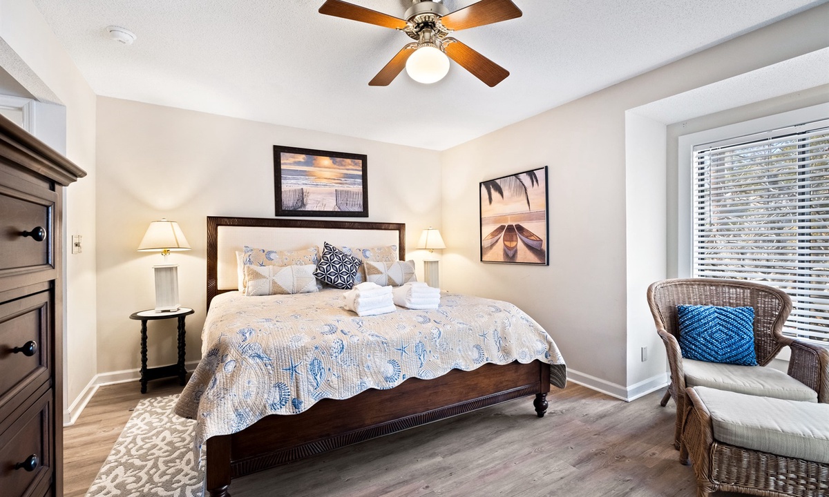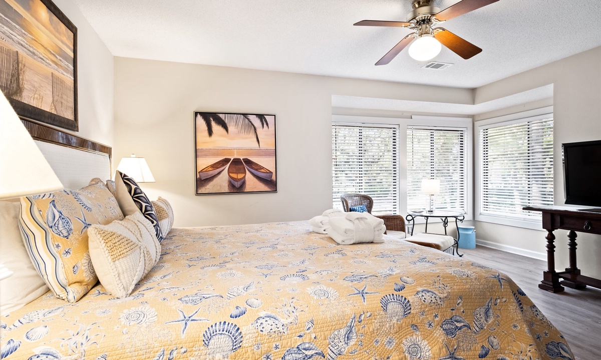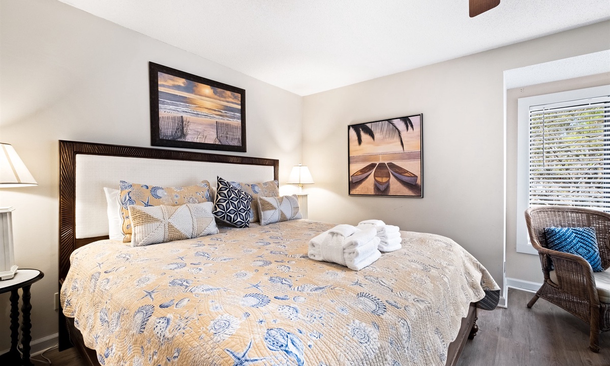 The bedroom includes a King-size bed plus a sitting area and desk suitable for use as a “remote office” set-up (extra monitor w/HDMI cable located in the “Games” closet). With 2 full bathrooms and additional sleeping options in the living room (Queen AND Single sleepers), this is the ultimate getaway for couples of all ages or a young family. Beachwalk is the closest villa accommodation to the beach in Shipyard - a comfortable 7 minute walk down a shady path to the Shipyard Beach Club and 12 miles of gorgeous sandy beach. The Beachwalk Shipyard complex also has a large on site community pool.