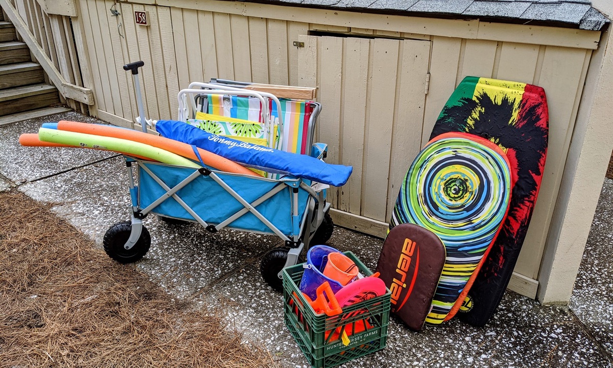 • Beach equipment in the outdoor storage locker (including beach wagon, beach chairs, a beach umbrella, cooler, boogie boards and beach toys for the kids)