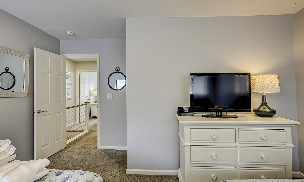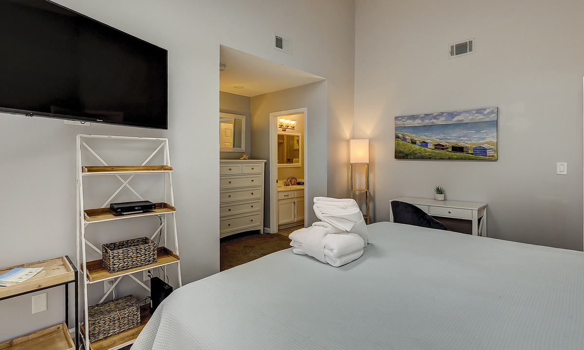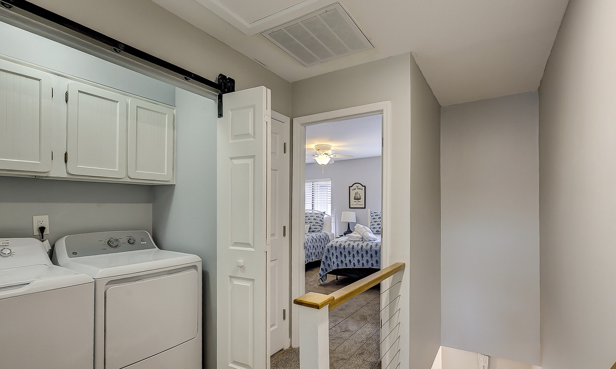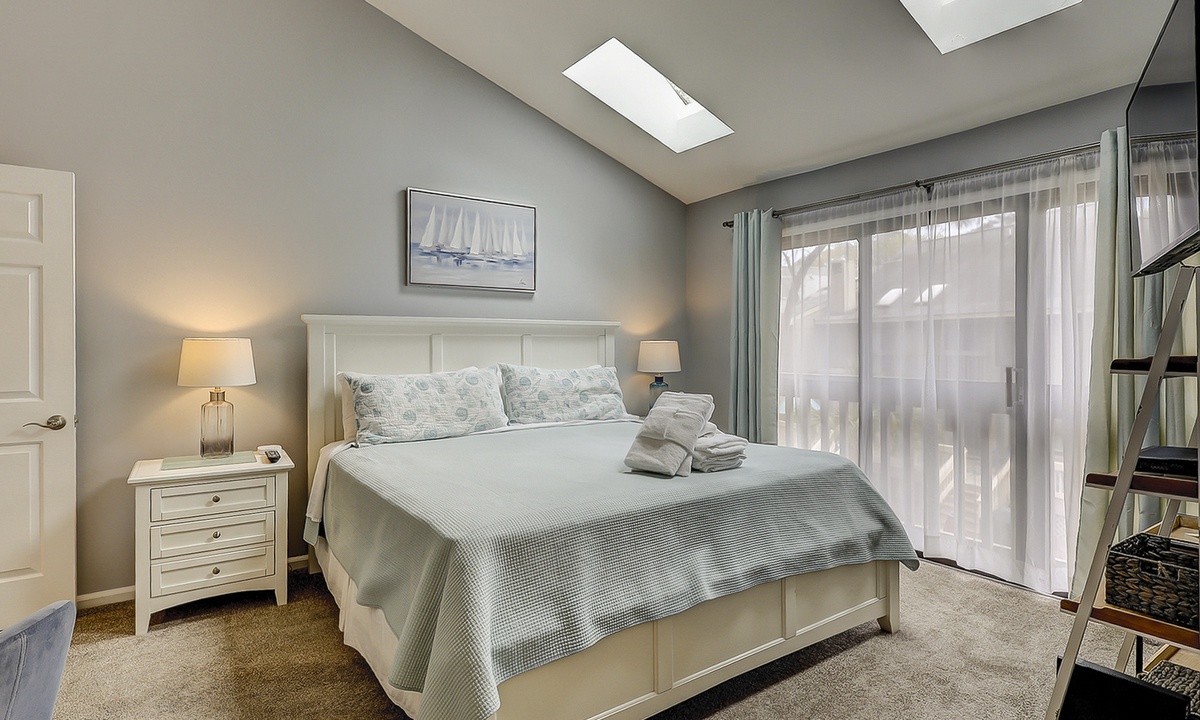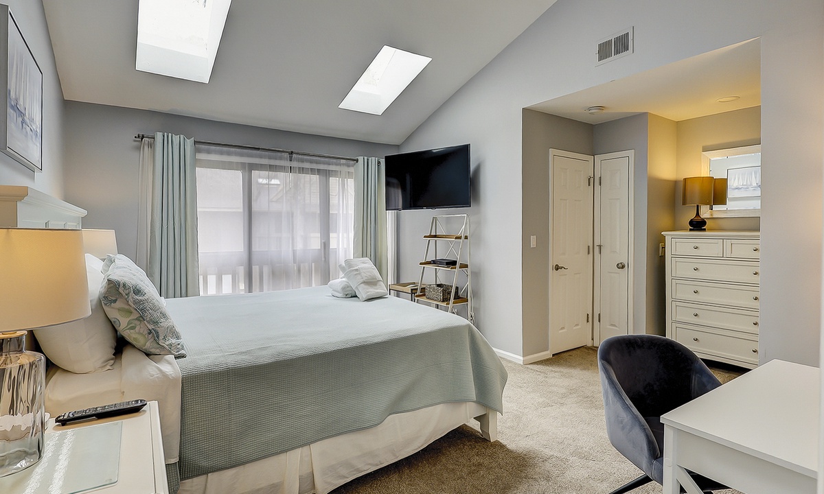 Upstairs comfortably sleeps 6 guests in 2 bedrooms, each with a private full bathroom, ample closet space, and new smart TVs. The spacious primary bedroom features a vaulted ceiling, skylights, a new Vaughn Bassett king-size bed with a back protector mattress, and a large walk-in closet. The guest bedroom comfortably features 2 queen beds. New appliances are located in the second-floor laundry. Cable television and high-speed internet are included.