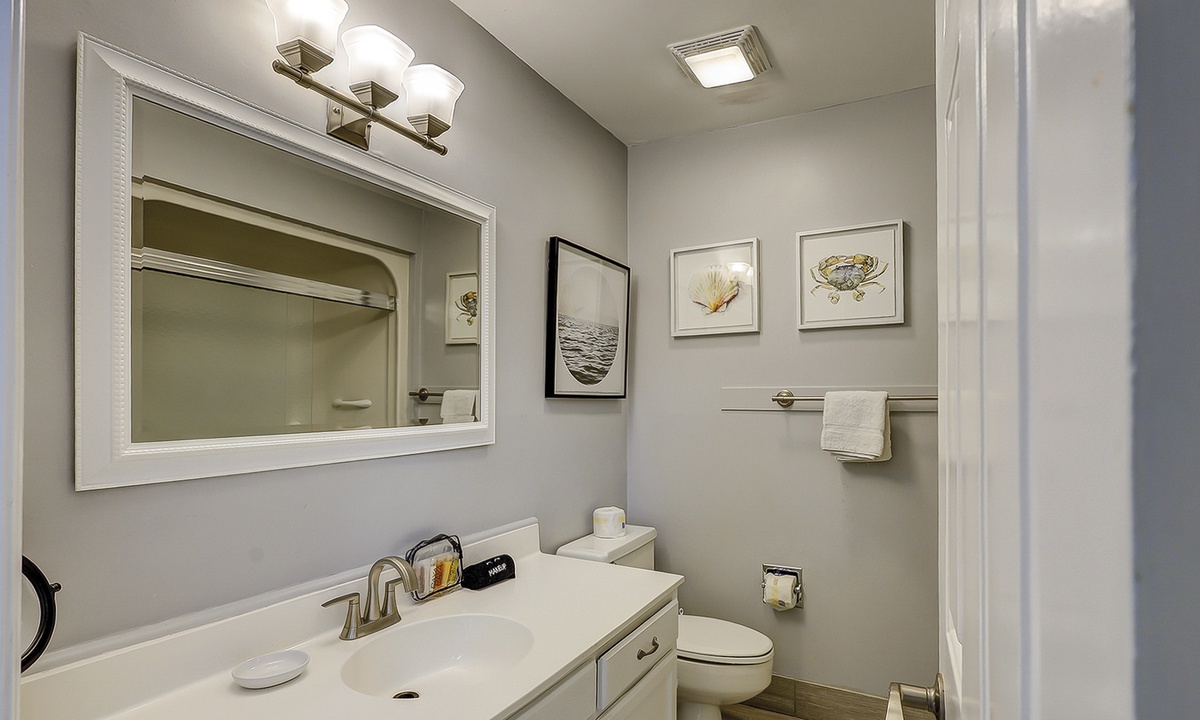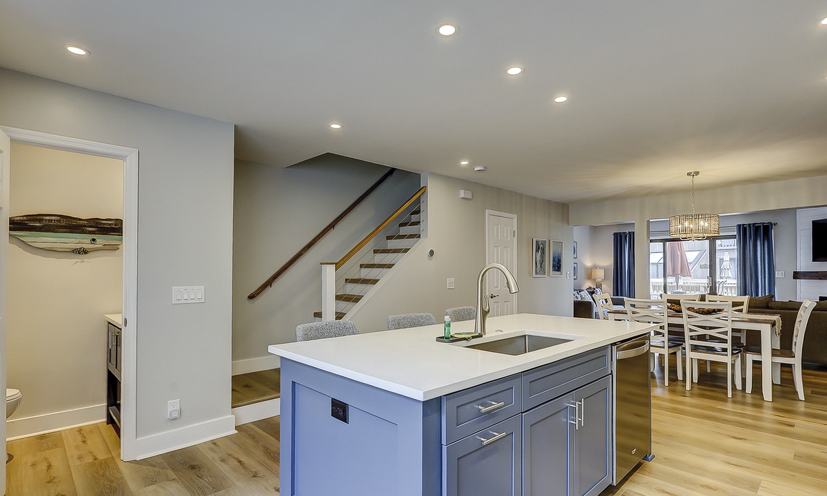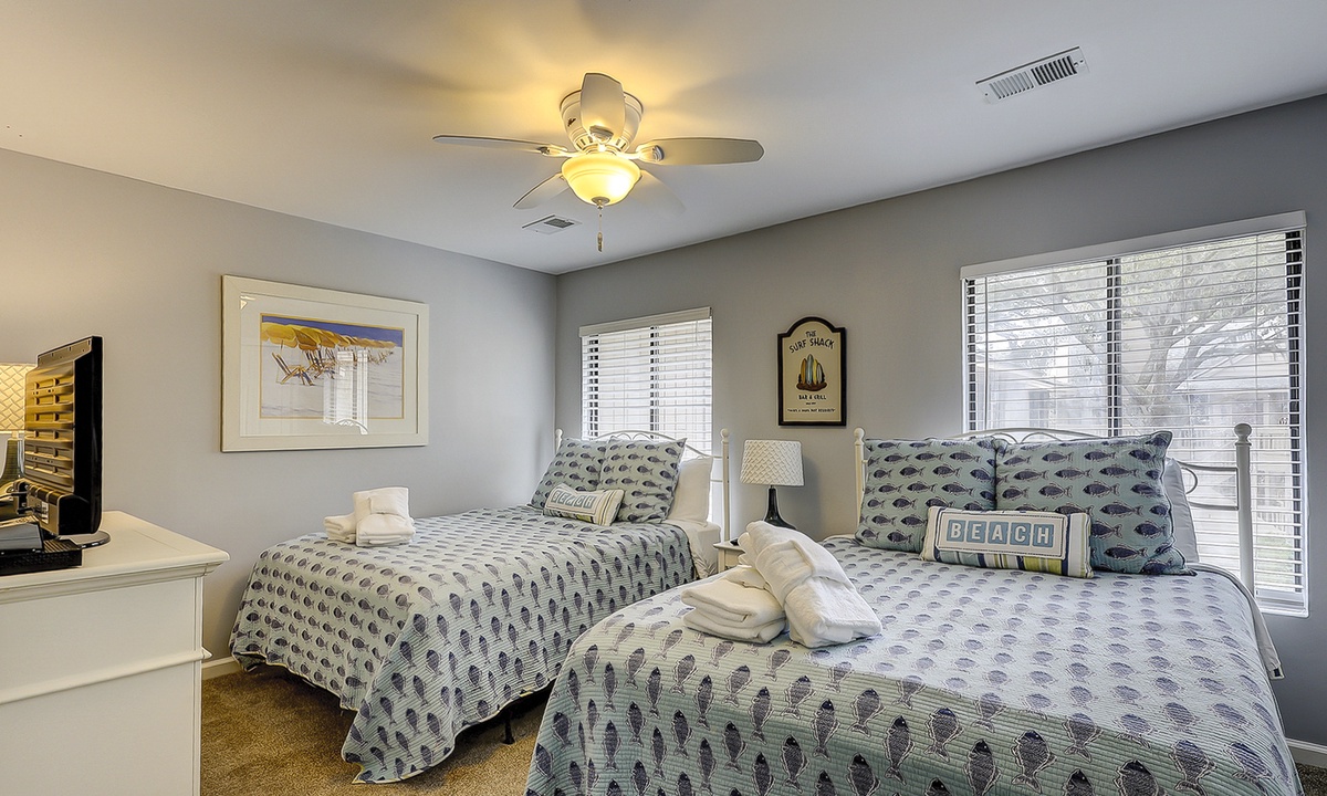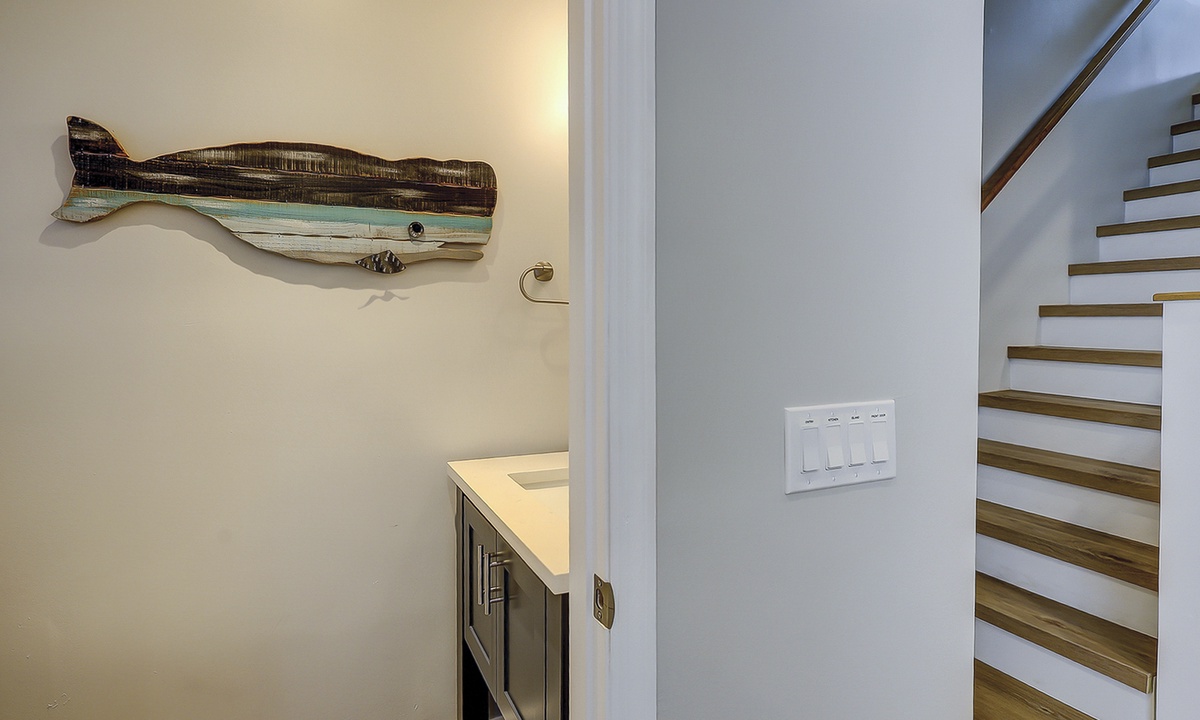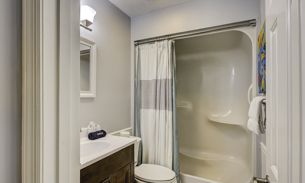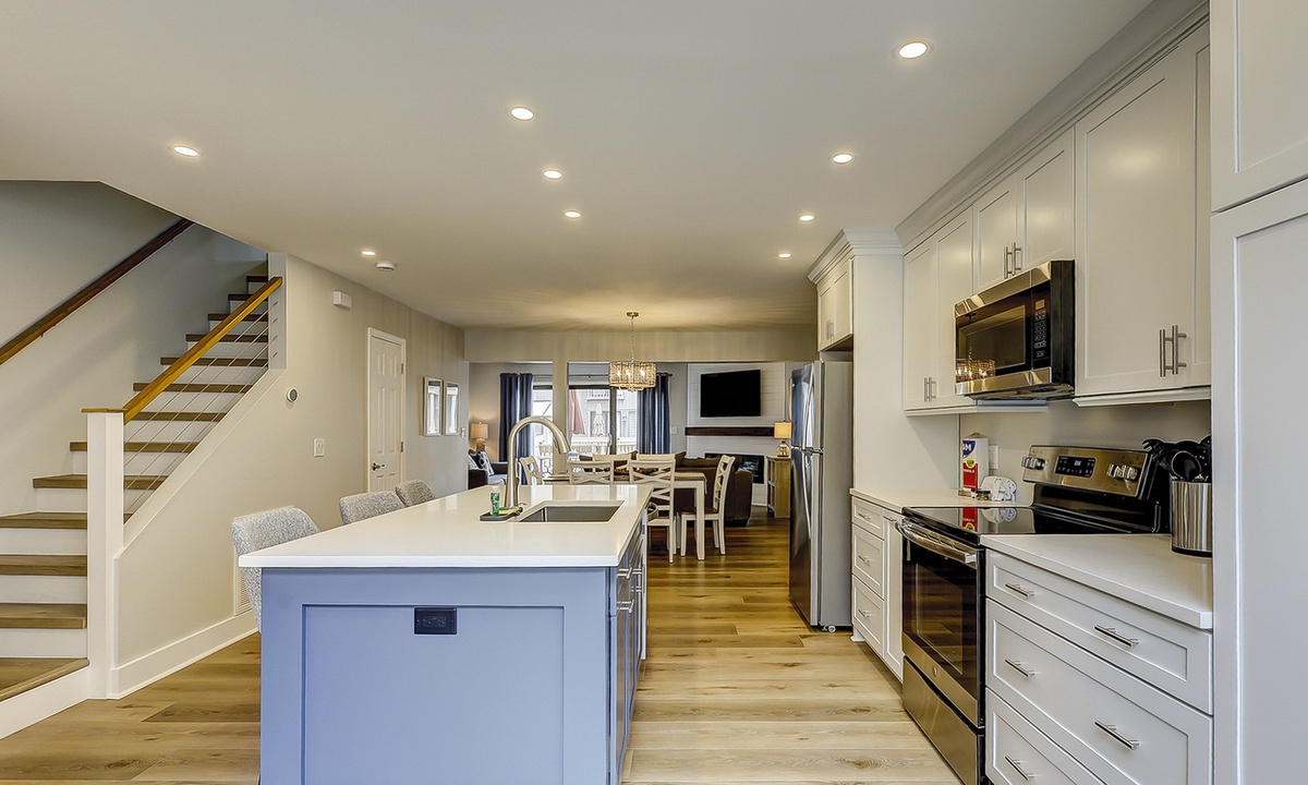 Upstairs comfortably sleeps 6 guests in 2 bedrooms, each with a private full bathroom, ample closet space, and new smart TVs. The spacious primary bedroom features a vaulted ceiling, skylights, a new Vaughn Bassett king-size bed with a back protector mattress, and a large walk-in closet. The guest bedroom comfortably features 2 queen beds. New appliances are located in the second-floor laundry. Cable television and high-speed internet are included.