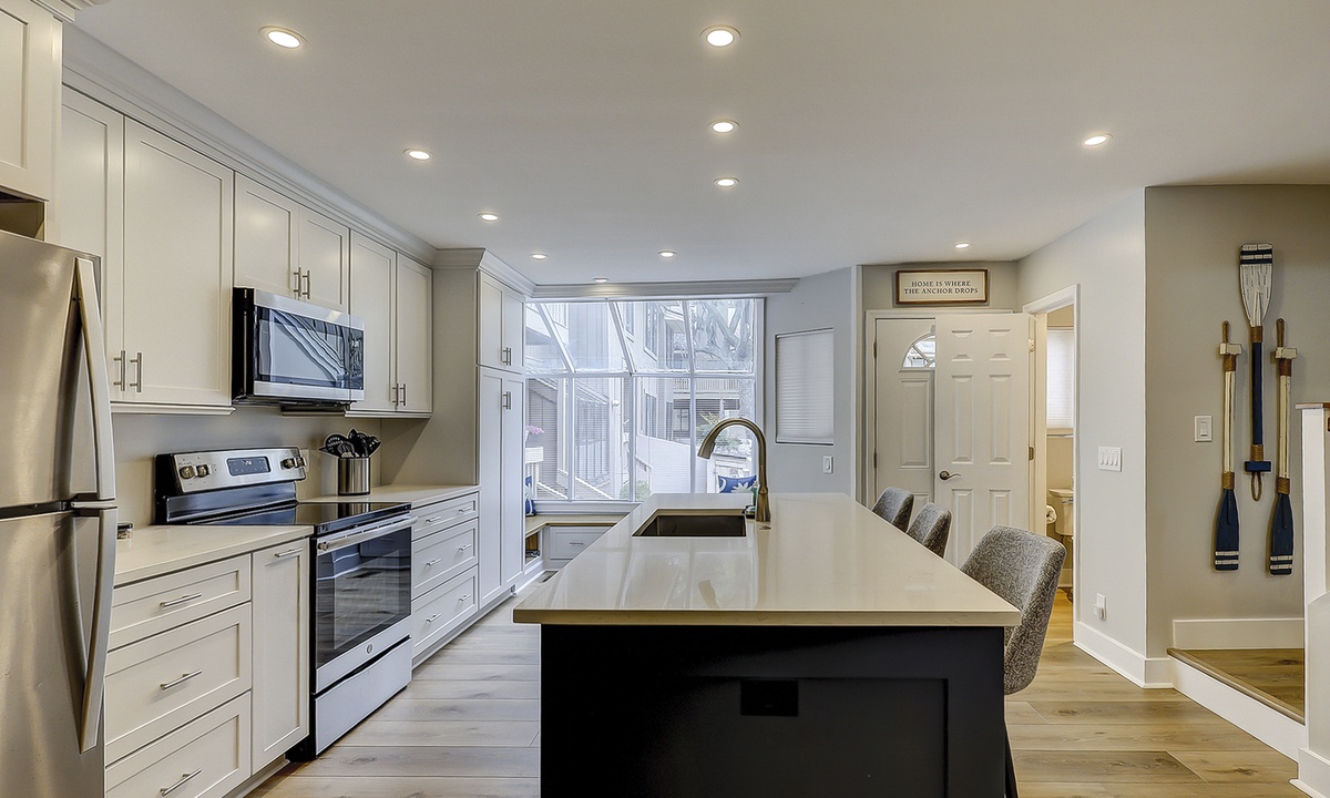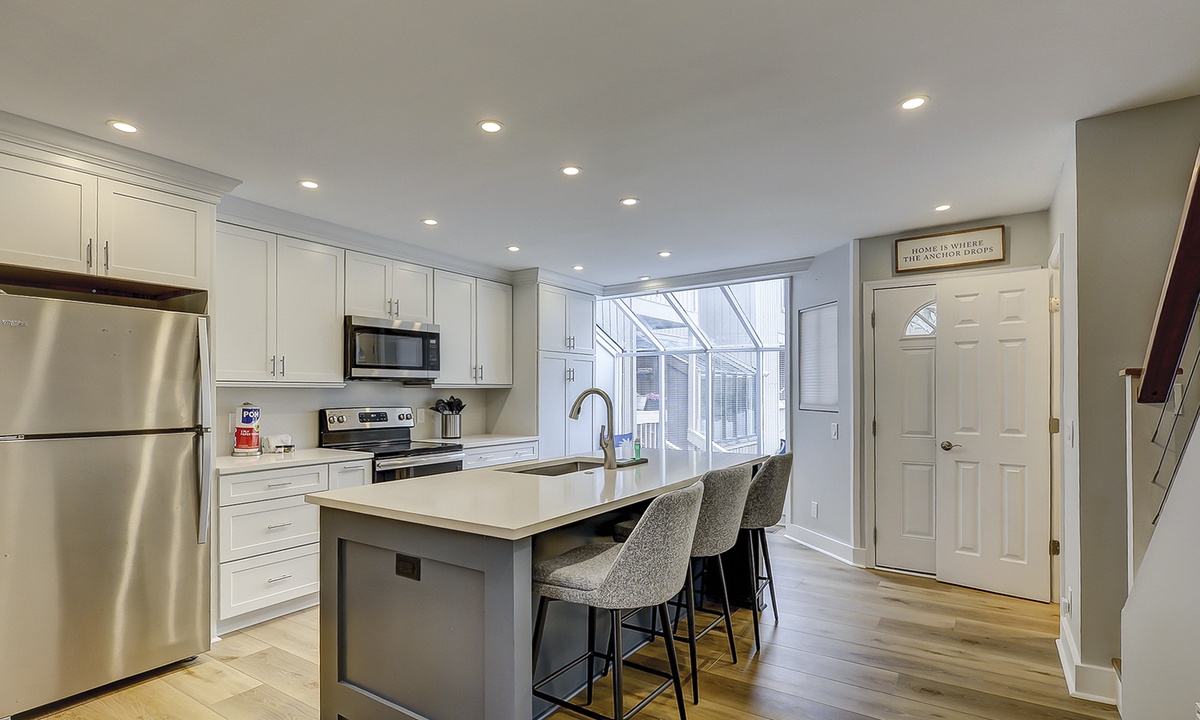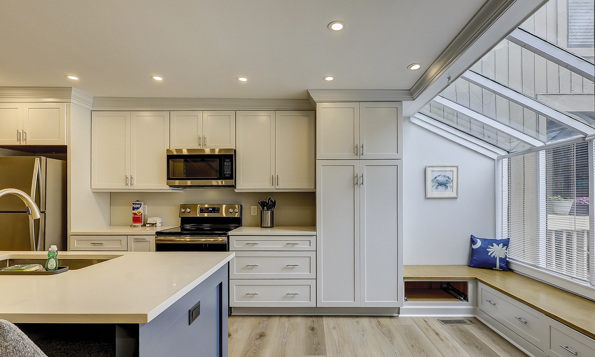 As you enter, you are welcomed into the open-concept first floor by a sunny atrium with a charming window seat for reading and morning coffee. The beautiful kitchen features a large island with seating for three, luxurious quartz countertops, ample cabinet and pantry space, and everything you need to prepare a meal while enjoying unobstructed views to the back deck.