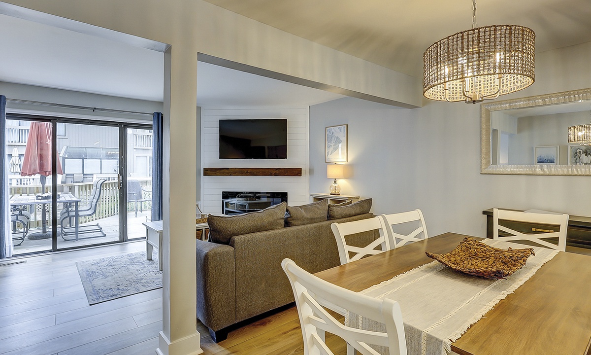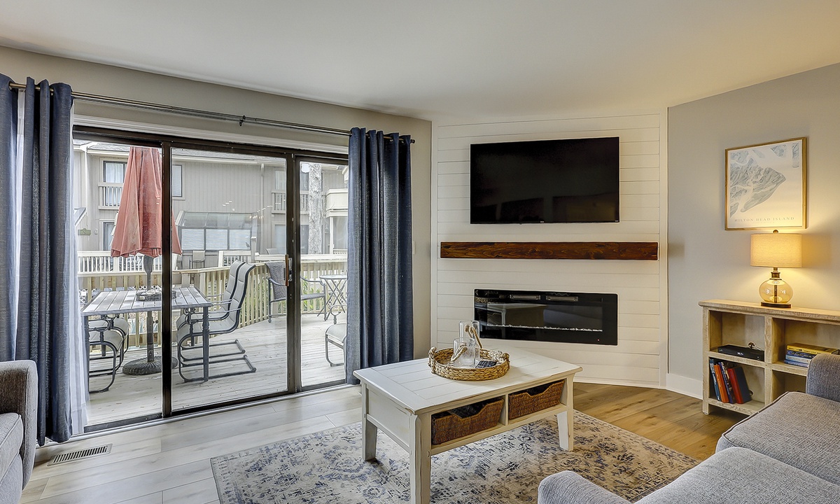 Warm, wood-tone luxury vinyl plank floors guide you to the dining area, with seating for six, and the spacious family room includes a dry bar with a wine/beverage fridge and a large Smart TV above the electric fireplace. A wide sliding door opens to the back deck which seats six and overlooks lush low-country vegetation and a grassy area.