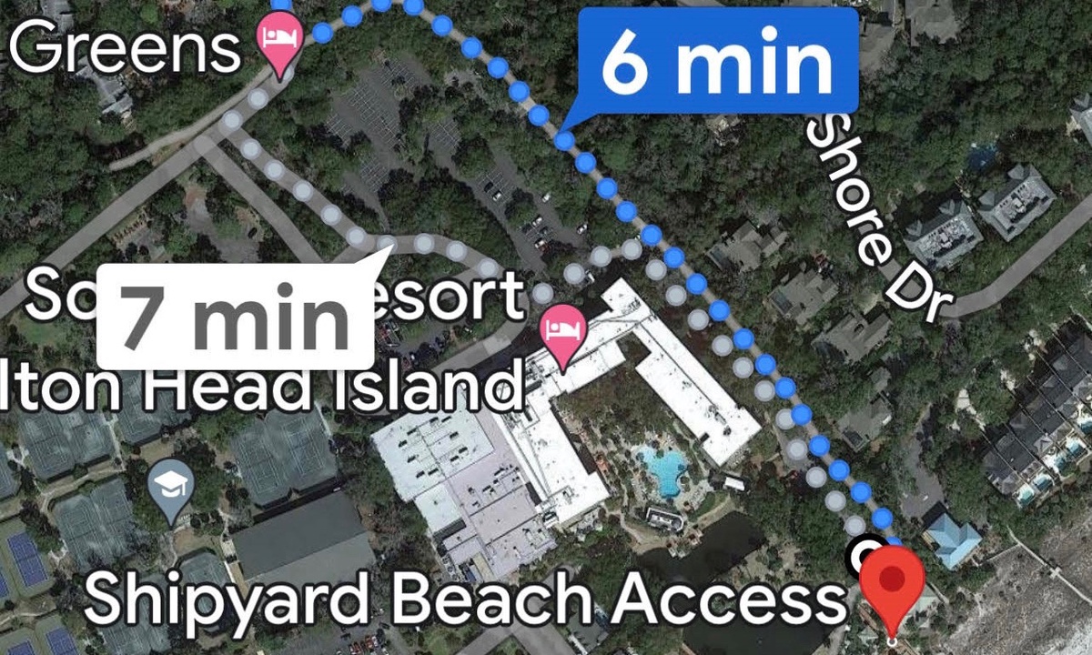 Enjoy a short, 6-minute walk under a canopy of beautiful trees along the path to Shipyard’s private beach access. Bicycle parking, private restrooms, and outdoor showers are located at the beach access and lifeguards are present seasonally. The beach itself is great for relaxing, family fun, walking/biking/running, and viewing stunning sunsets. Adjacent to the beach access, but hidden behind the dunes, is the Sonesta Resort which includes a spa, restaurants, and bar which are open to the public.