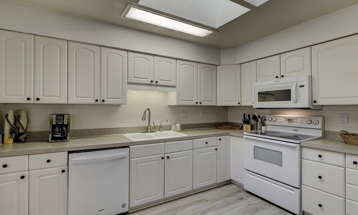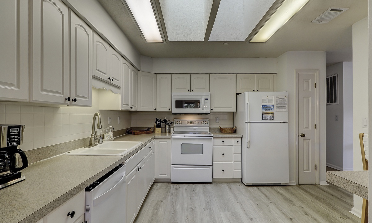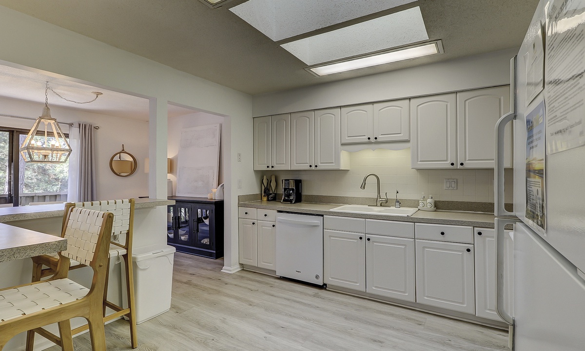 The dining area, which is open to the living area and kitchen, seats 6 comfortably with additional seating for two at the kitchen bar. The kitchen has ample counter and cabinet space, white appliances and all the supplies need needed to cook a meal for your group.