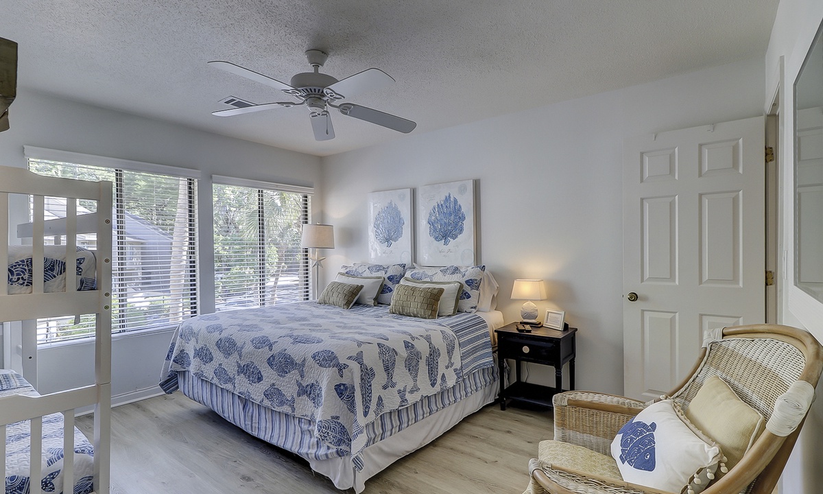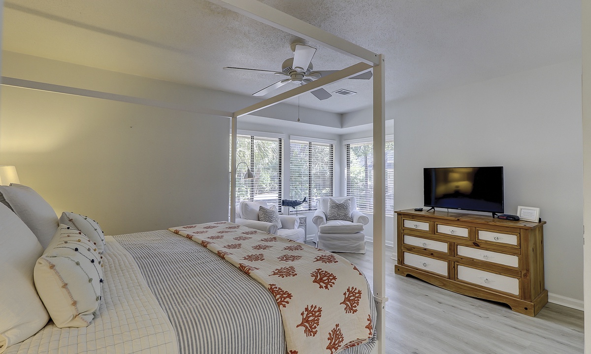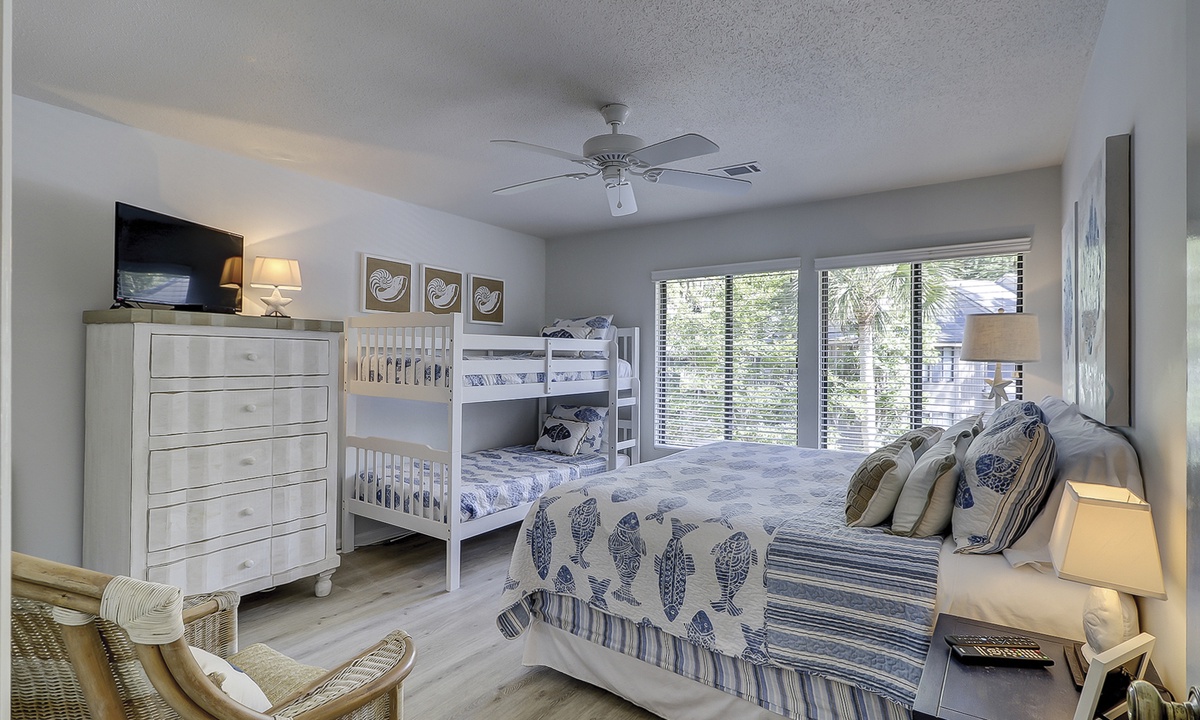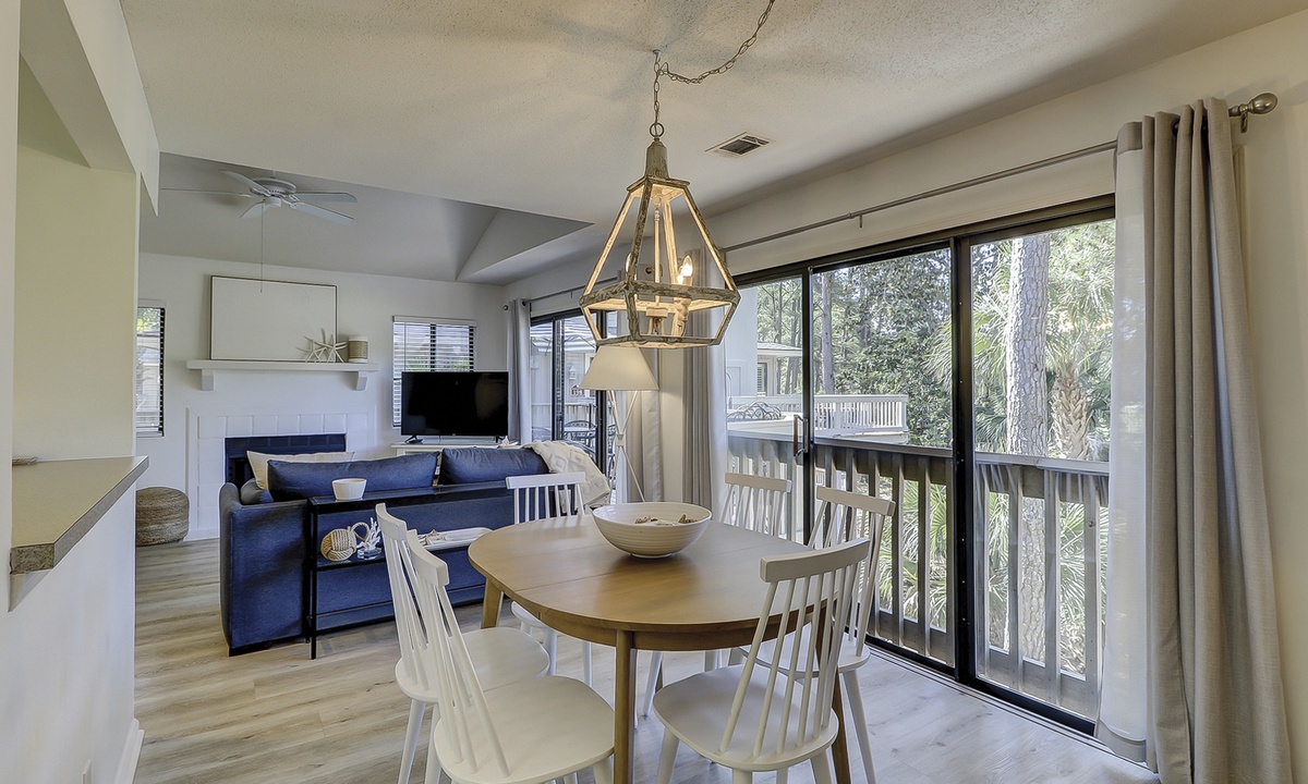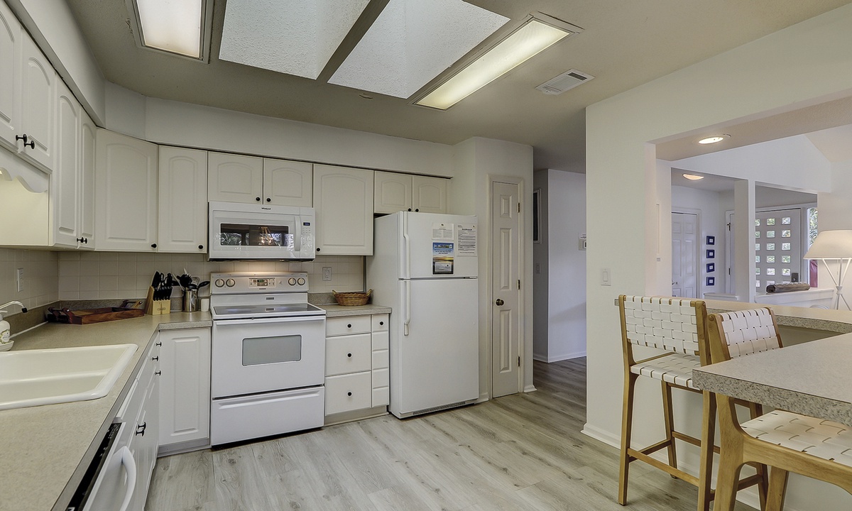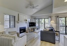 This Beachwalk Hilton Head Island villa has been outfitted with coastal décor and comfortable furnishings, as well as laminate flooring that spans the living areas and bedrooms. The living room features a queen sleeper sofa and two club chairs, flat screen TV and sliding doors that lead to the private balcony overlooking the lagoon and golf course.