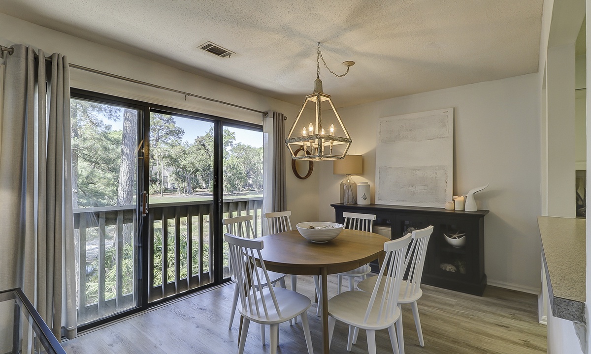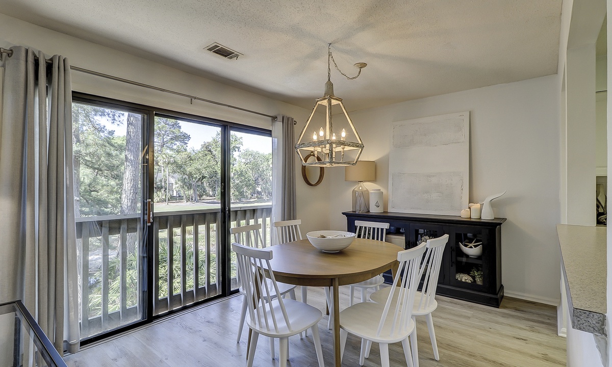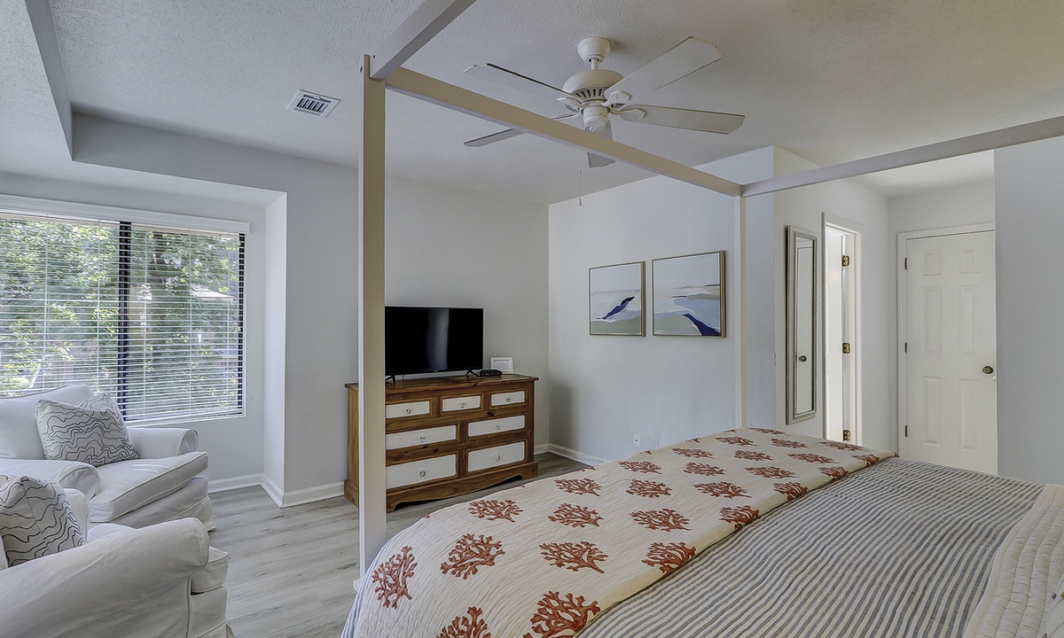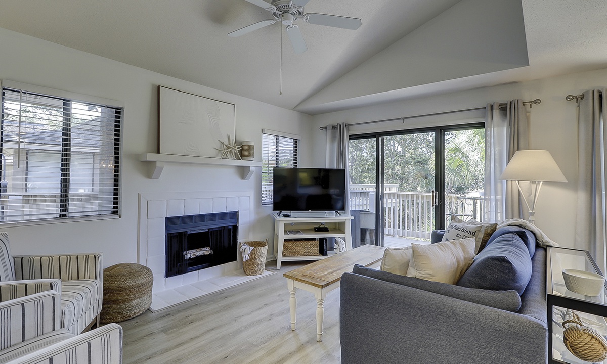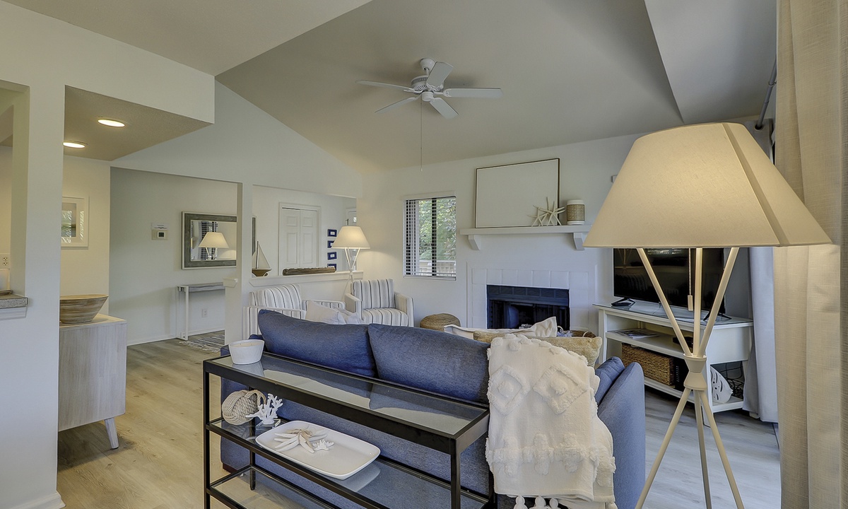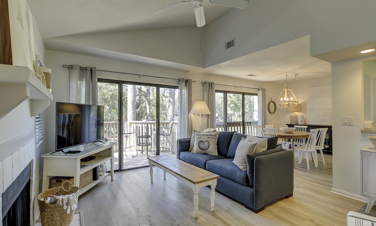 This Beachwalk Hilton Head Island villa has been outfitted with coastal décor and comfortable furnishings, as well as laminate flooring that spans the living areas and bedrooms. The living room features a queen sleeper sofa and two club chairs, flat screen TV and sliding doors that lead to the private balcony overlooking the lagoon and golf course.