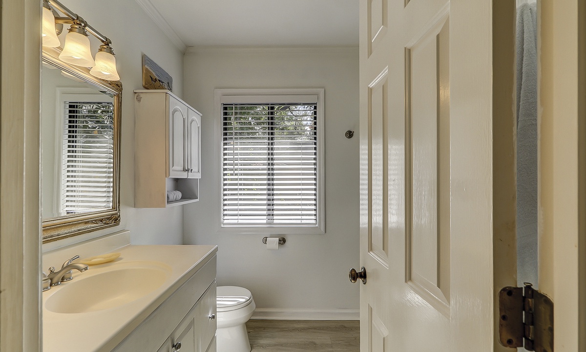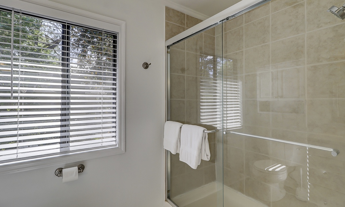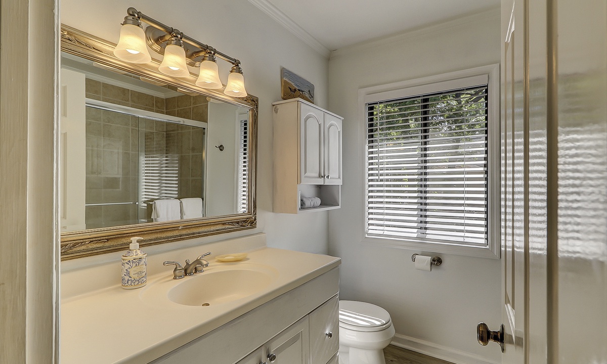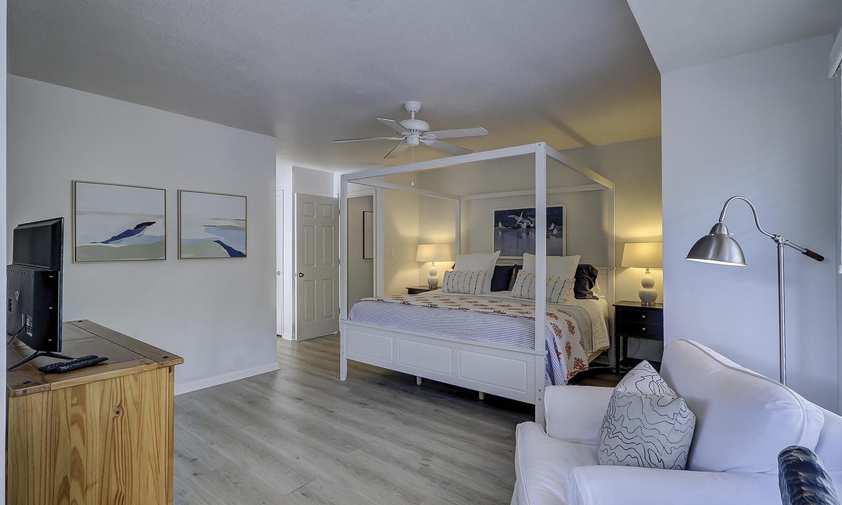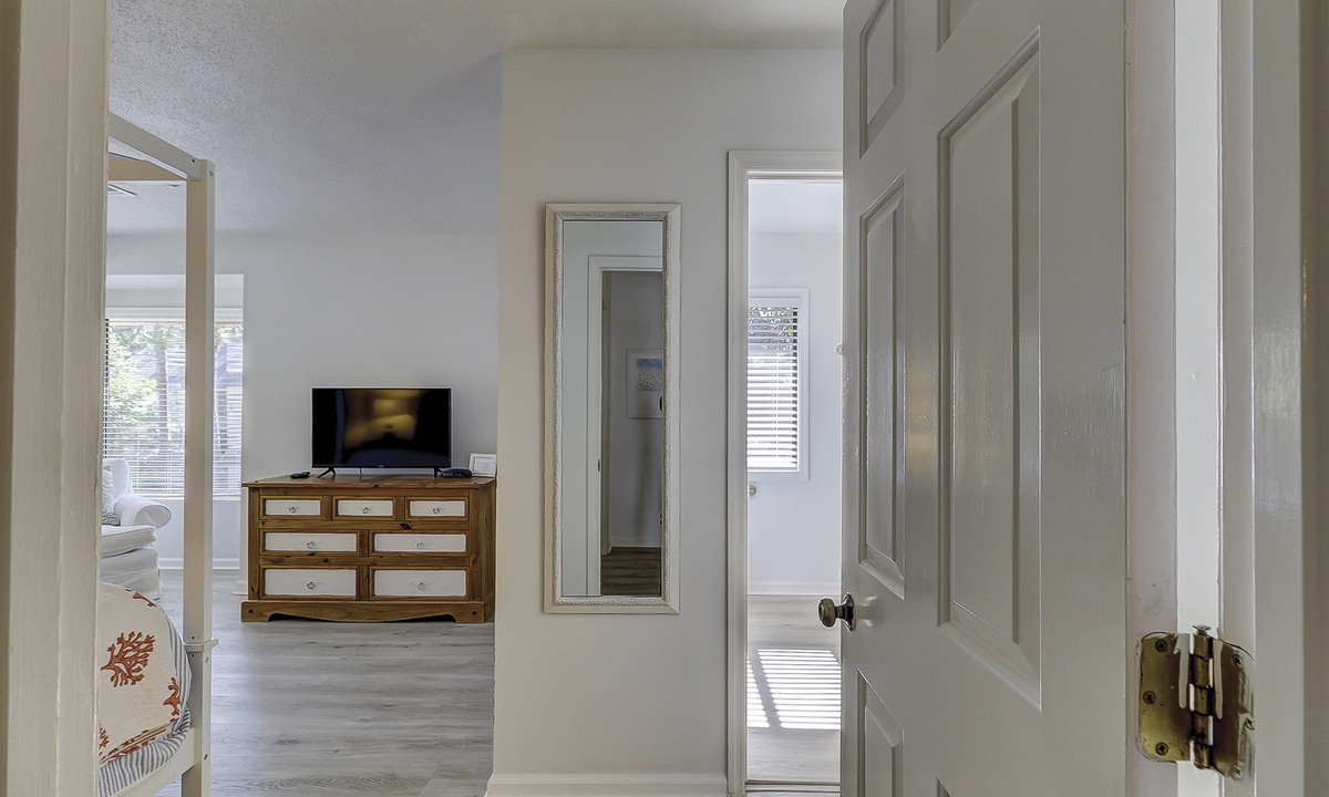 This Beachwalk Hilton Head Island villa has been outfitted with coastal décor and comfortable furnishings, as well as laminate flooring that spans the living areas and bedrooms. The living room features a queen sleeper sofa and two club chairs, flat screen TV and sliding doors that lead to the private balcony overlooking the lagoon and golf course.