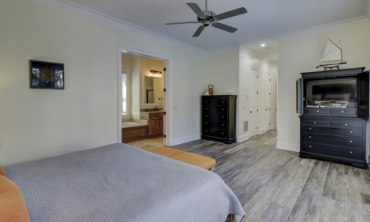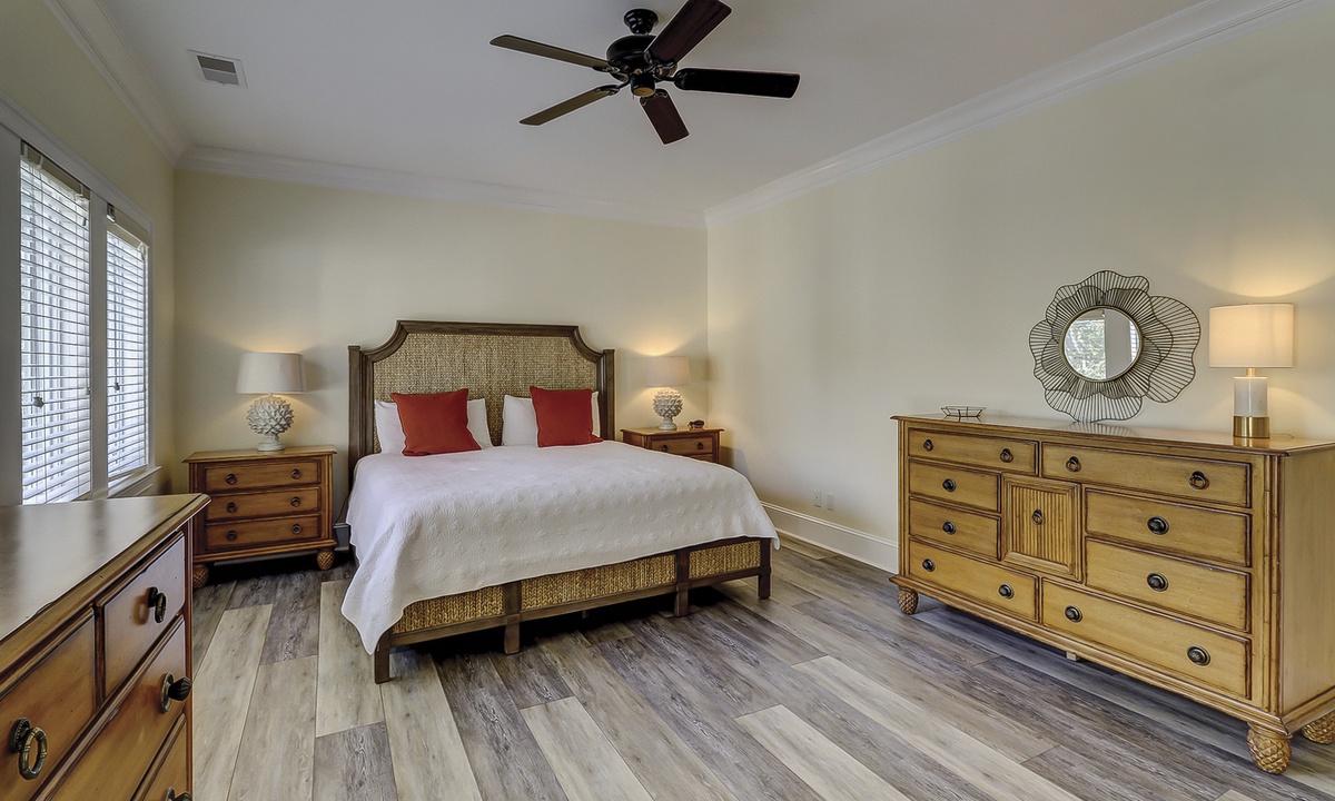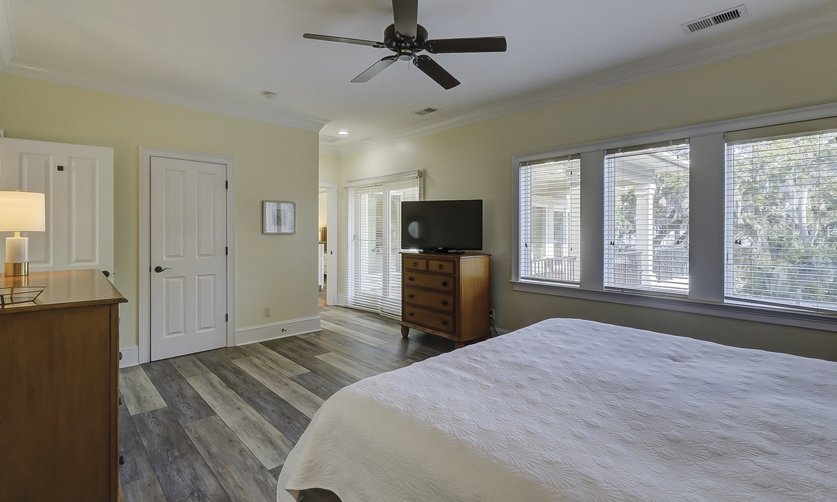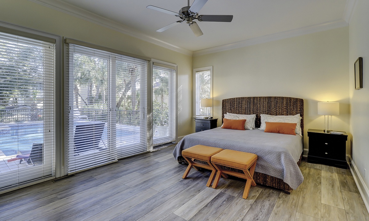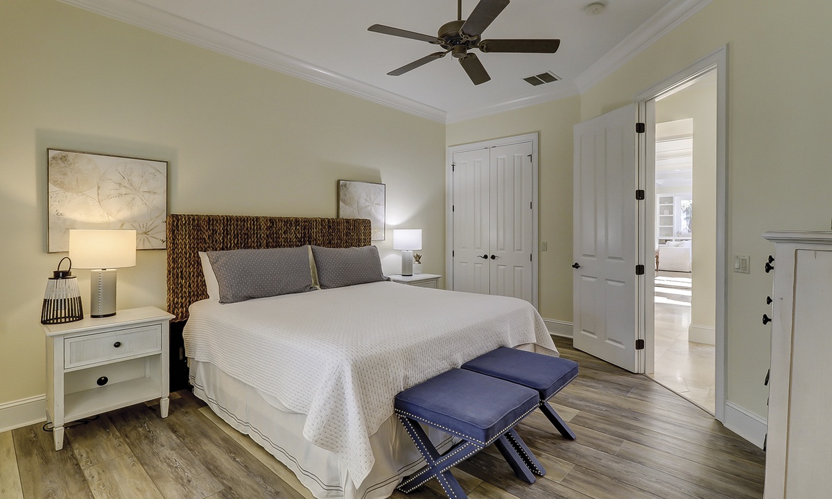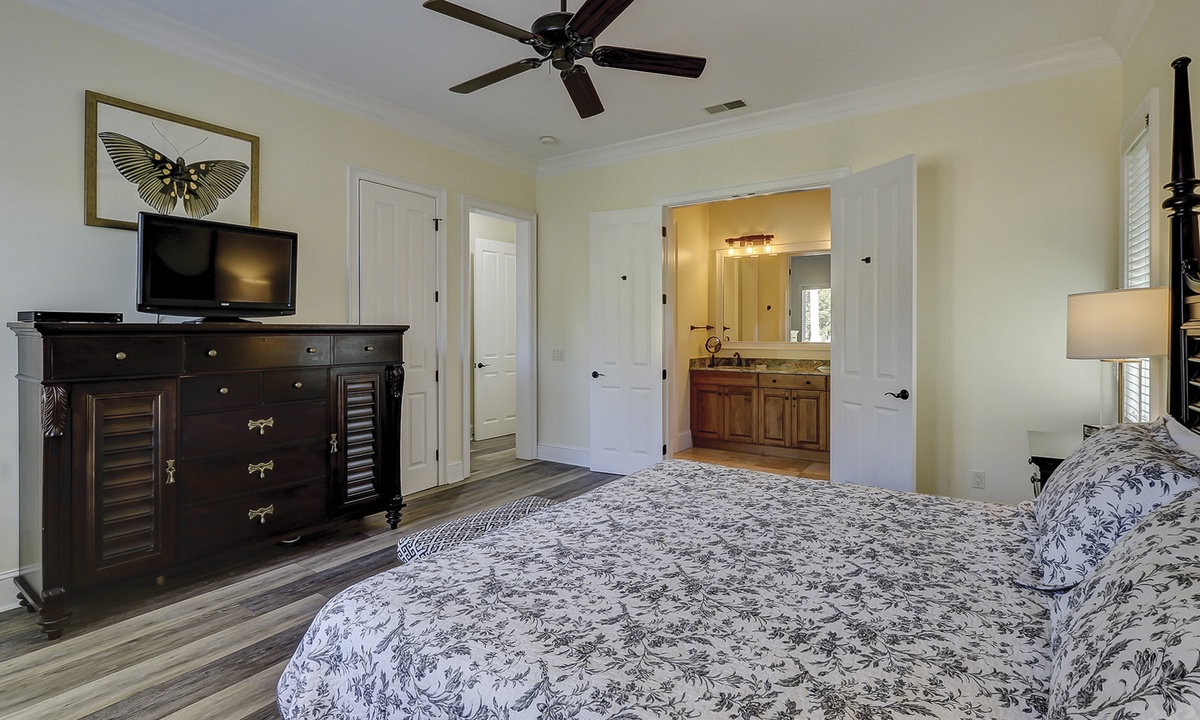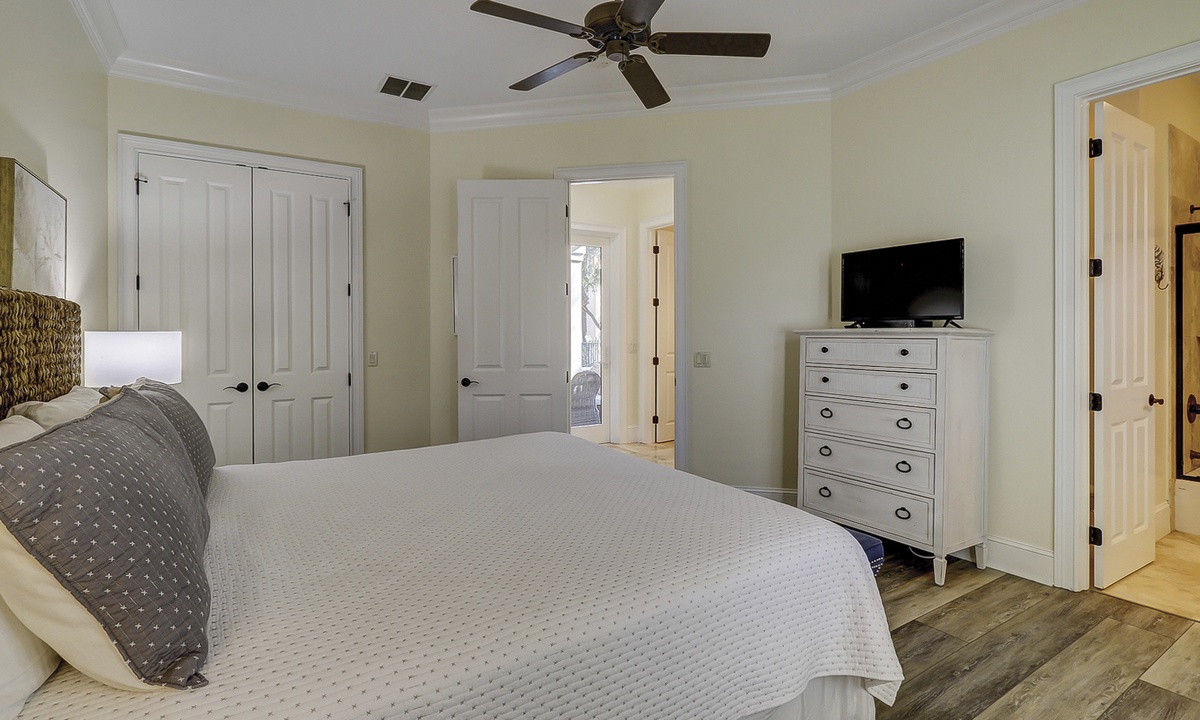 A short hallway off the great room has a convenient powder room, and the first of 7 bedrooms. All the bedrooms in the home feature wood flooring. This first room features a King-sized bed, TV, large closet, and private shower/bath. The hallway ends at the very private primary bedroom, which features a king-size bed, an armoire with TV/DVD, a walk-in closet, a large window wall with a slider door to the pool deck, and a private bath with a spa tub, a large walk-in shower, double vanities, and a separate water closet. All of the bathrooms feature hair dryers and magnifying mirrors for added convenience!