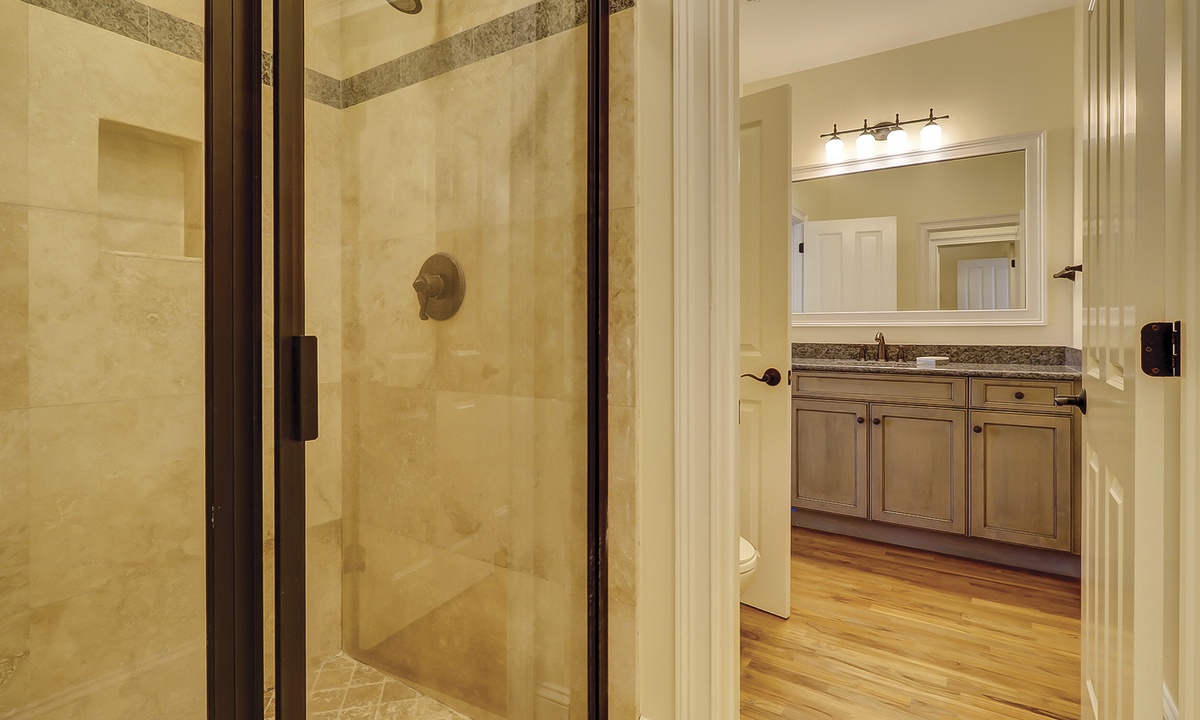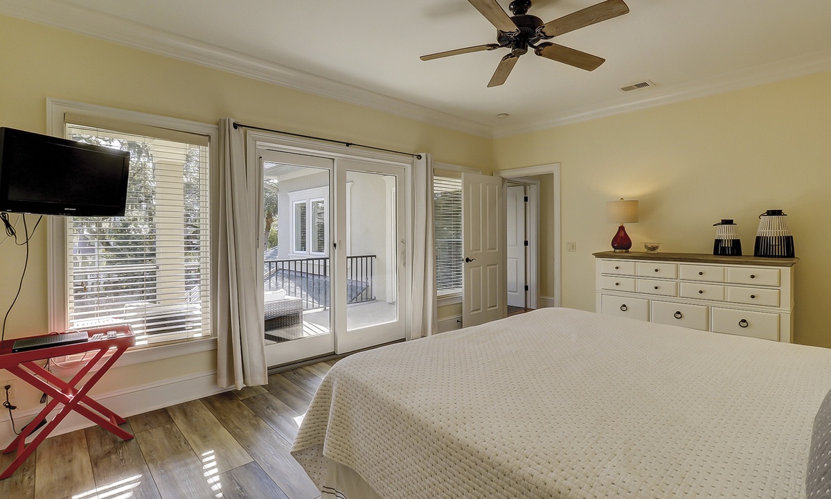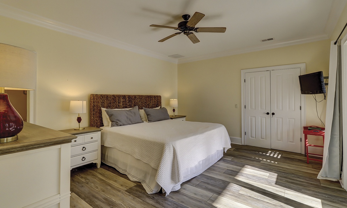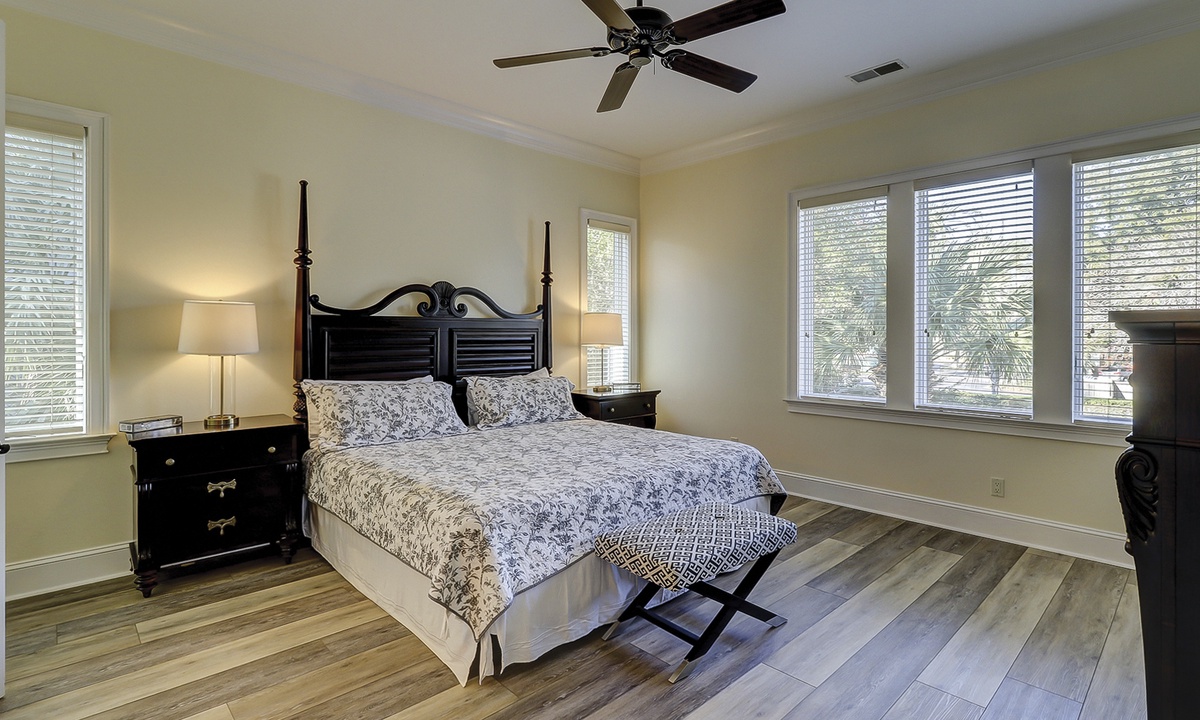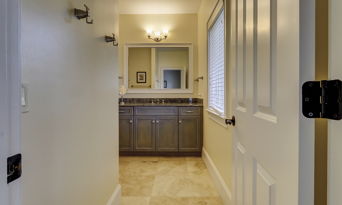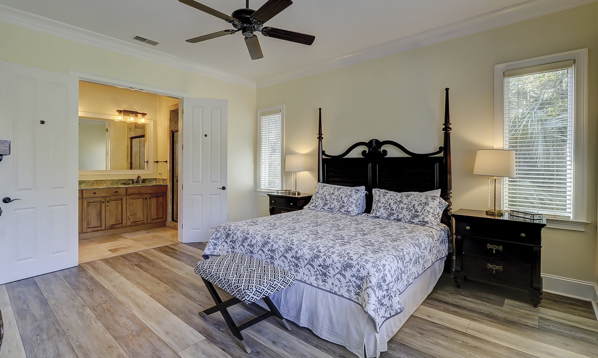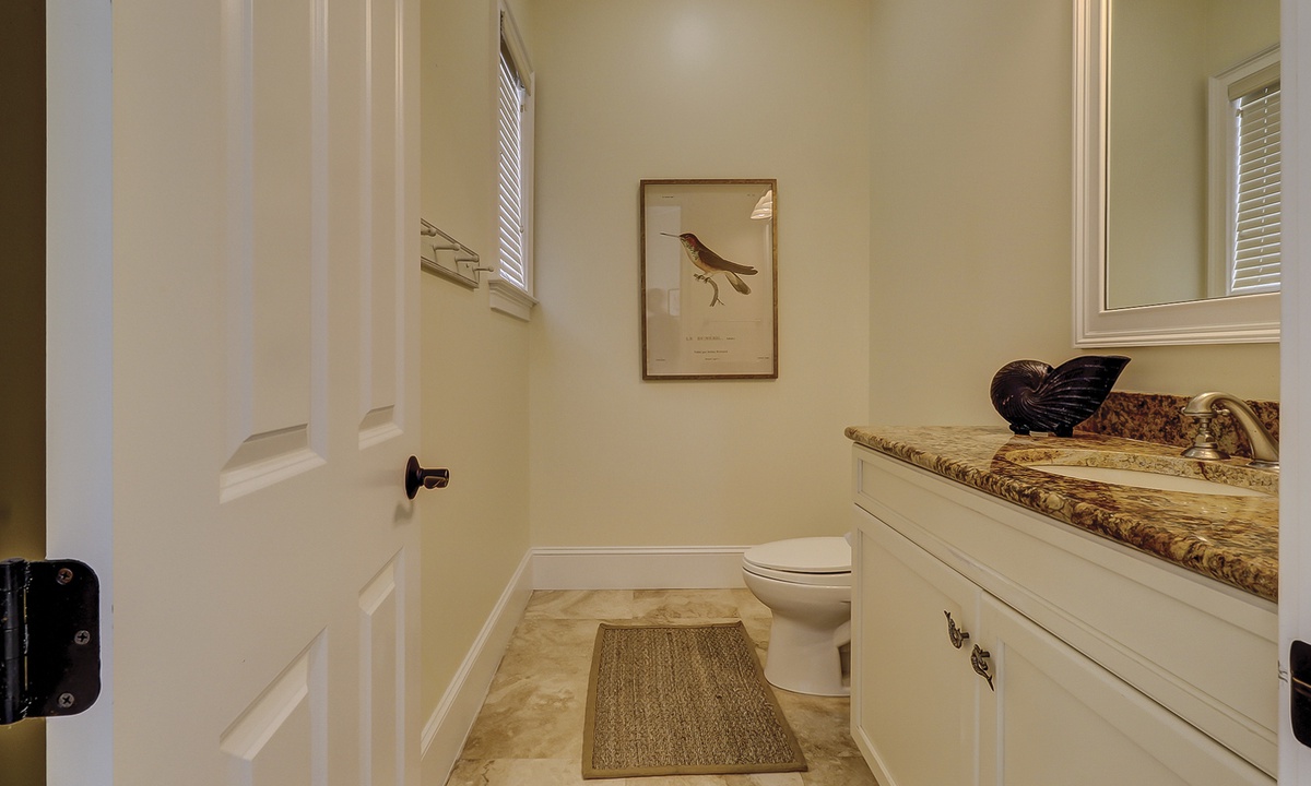 A short hallway off the great room has a convenient powder room, and the first of 7 bedrooms. All the bedrooms in the home feature wood flooring. This first room features a King-sized bed, TV, large closet, and private shower/bath. The hallway ends at the very private primary bedroom, which features a king-size bed, an armoire with TV/DVD, a walk-in closet, a large window wall with a slider door to the pool deck, and a private bath with a spa tub, a large walk-in shower, double vanities, and a separate water closet. All of the bathrooms feature hair dryers and magnifying mirrors for added convenience!
