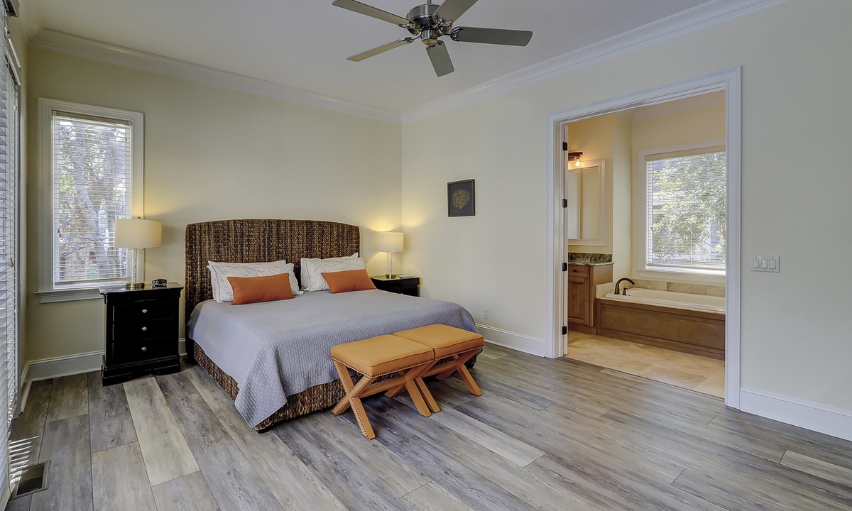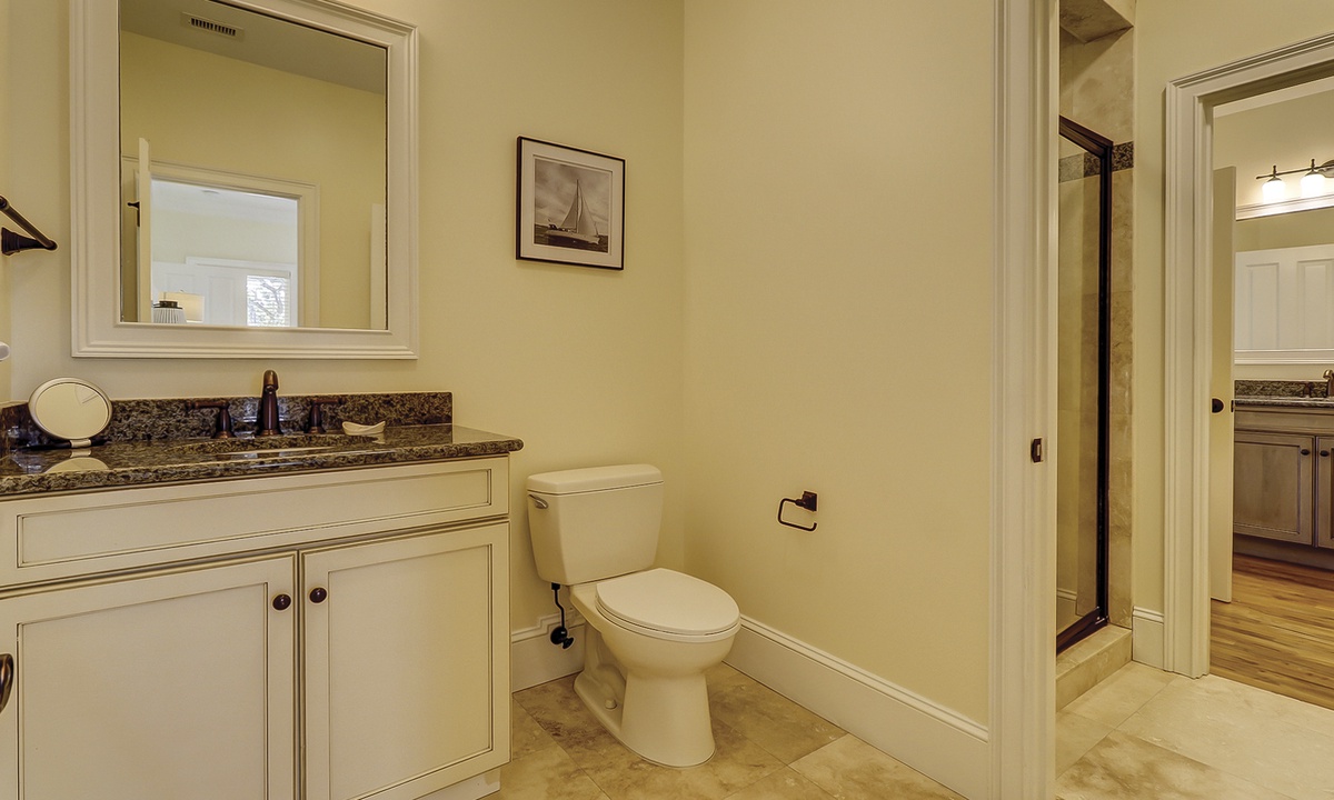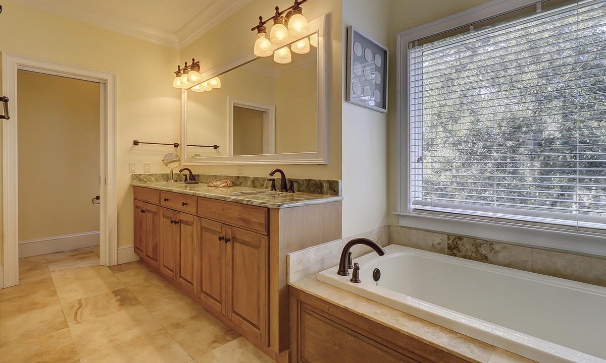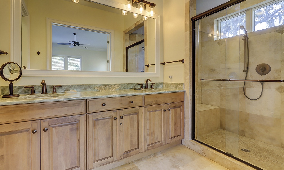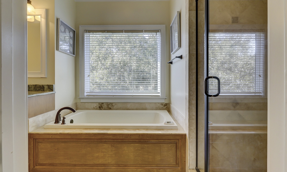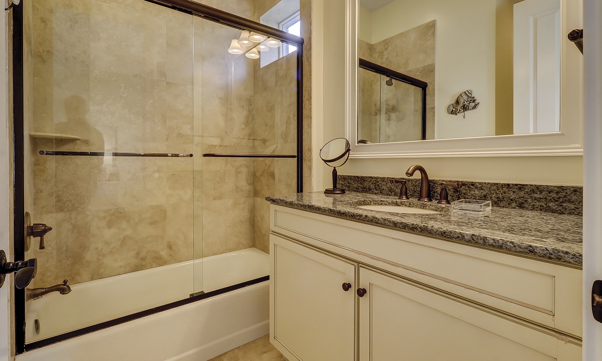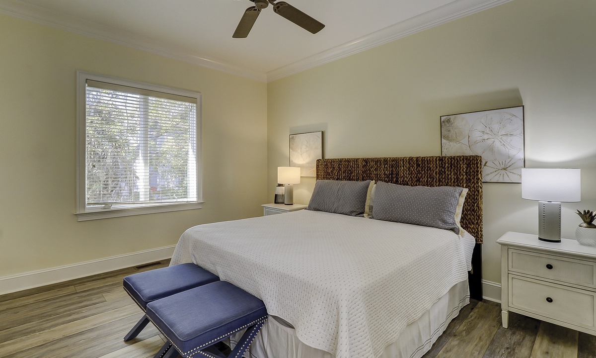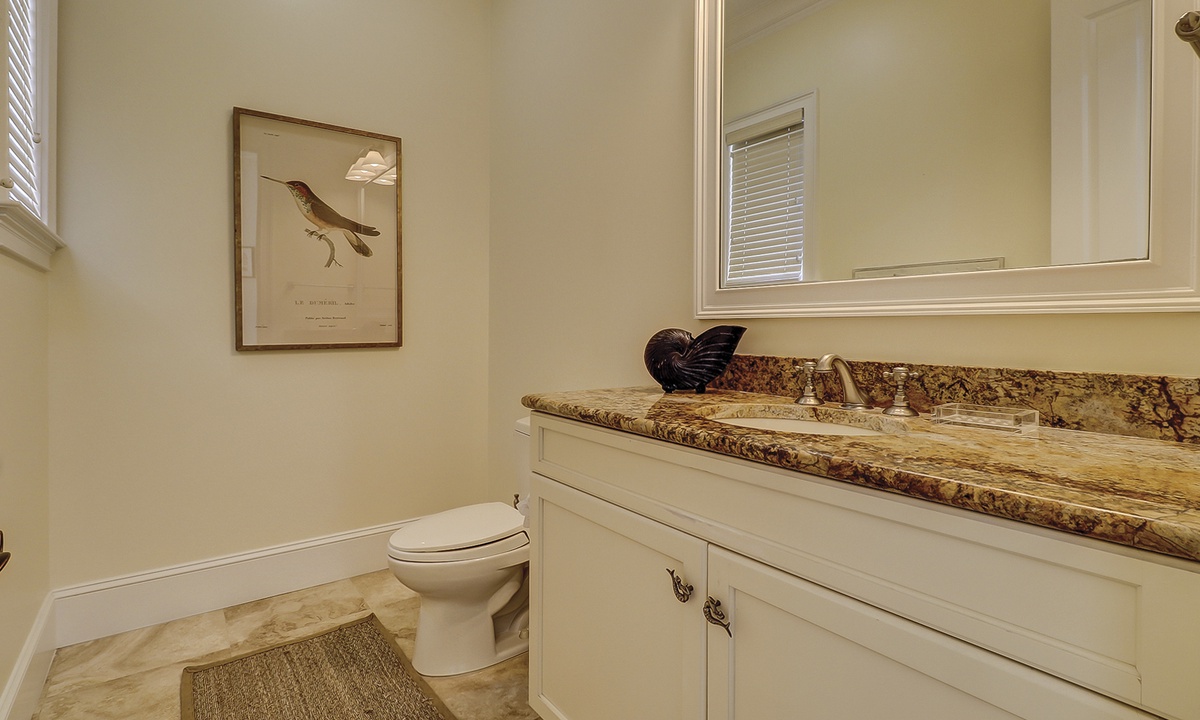 A short hallway off the great room has a convenient powder room, and the first of 7 bedrooms. All the bedrooms in the home feature wood flooring. This first room features a King-sized bed, TV, large closet, and private shower/bath. The hallway ends at the very private primary bedroom, which features a king-size bed, an armoire with TV/DVD, a walk-in closet, a large window wall with a slider door to the pool deck, and a private bath with a spa tub, a large walk-in shower, double vanities, and a separate water closet. All of the bathrooms feature hair dryers and magnifying mirrors for added convenience!