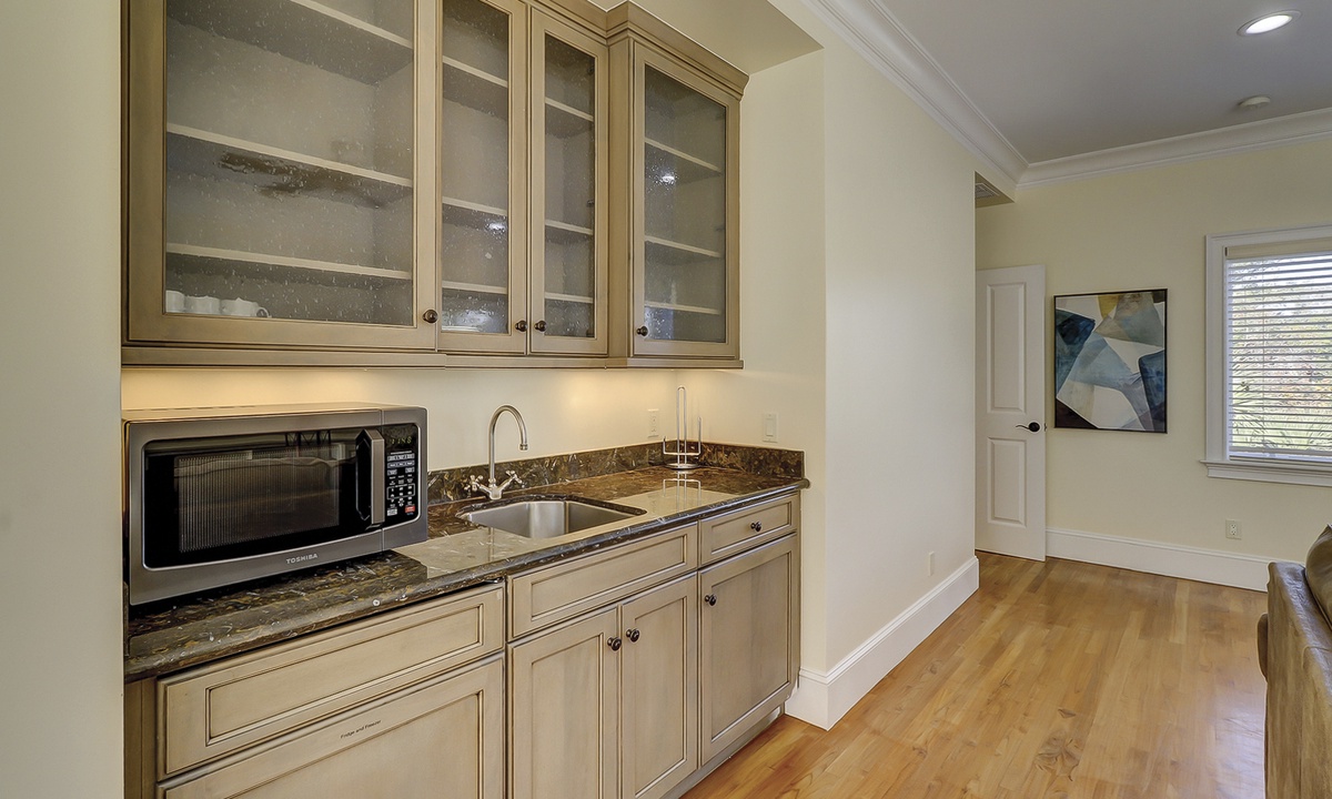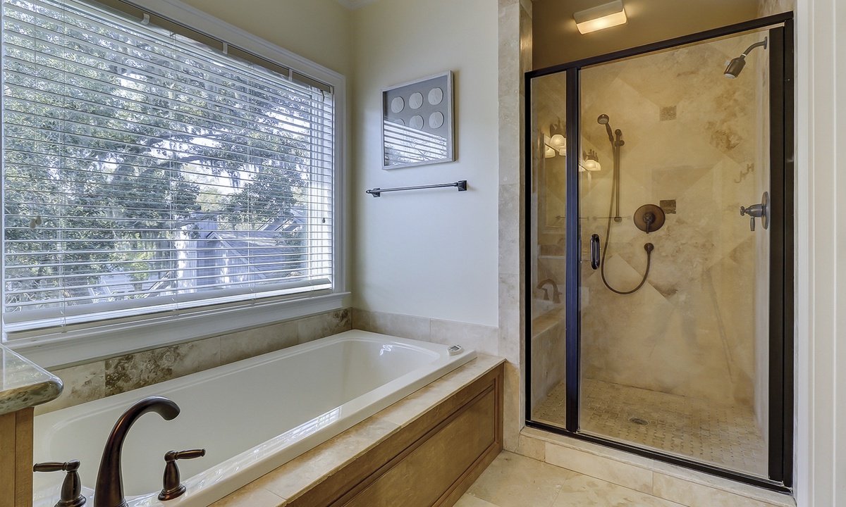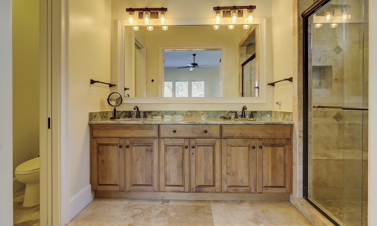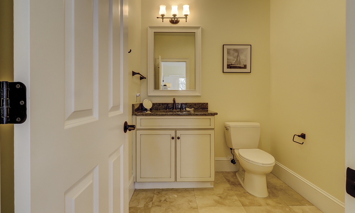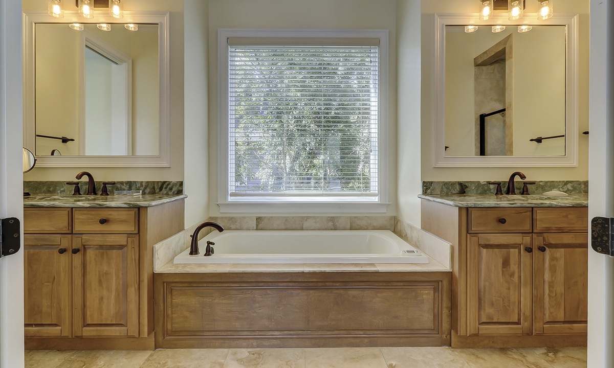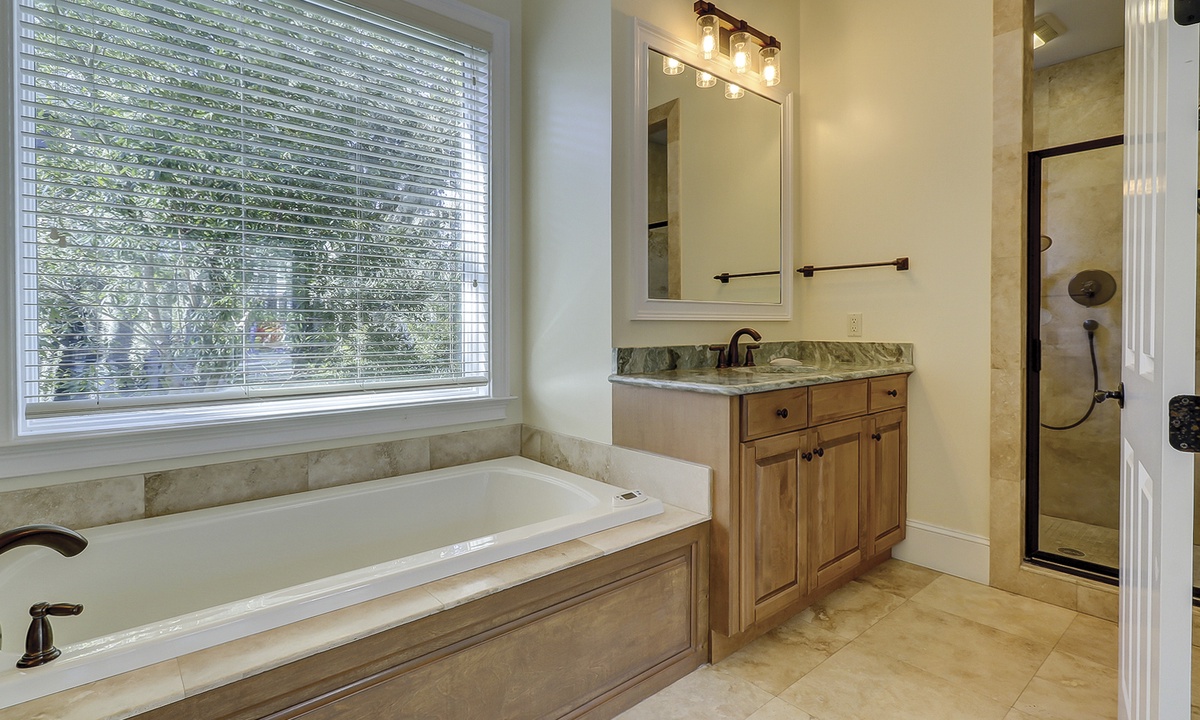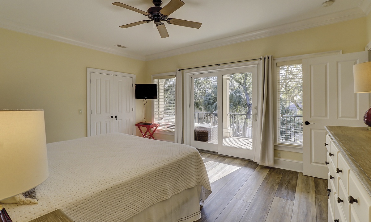 A short hallway off the great room has a convenient powder room, and the first of 7 bedrooms. All the bedrooms in the home feature wood flooring. This first room features a King-sized bed, TV, large closet, and private shower/bath. The hallway ends at the very private primary bedroom, which features a king-size bed, an armoire with TV/DVD, a walk-in closet, a large window wall with a slider door to the pool deck, and a private bath with a spa tub, a large walk-in shower, double vanities, and a separate water closet. All of the bathrooms feature hair dryers and magnifying mirrors for added convenience!