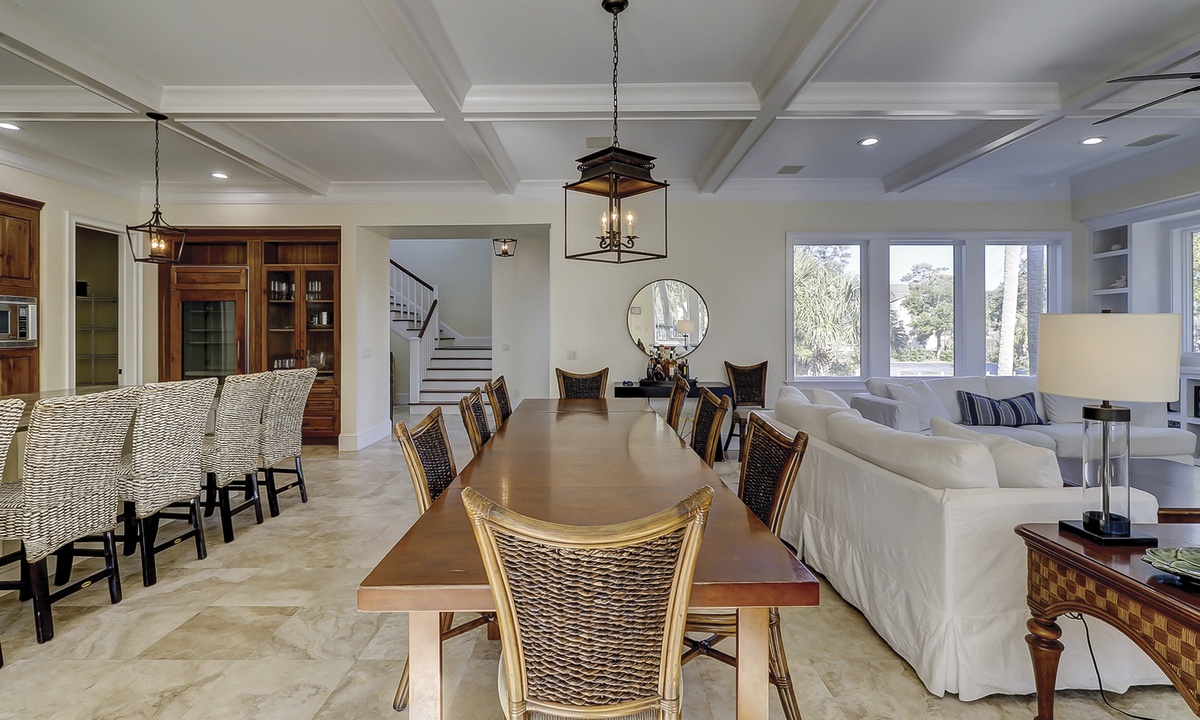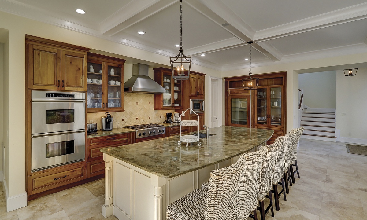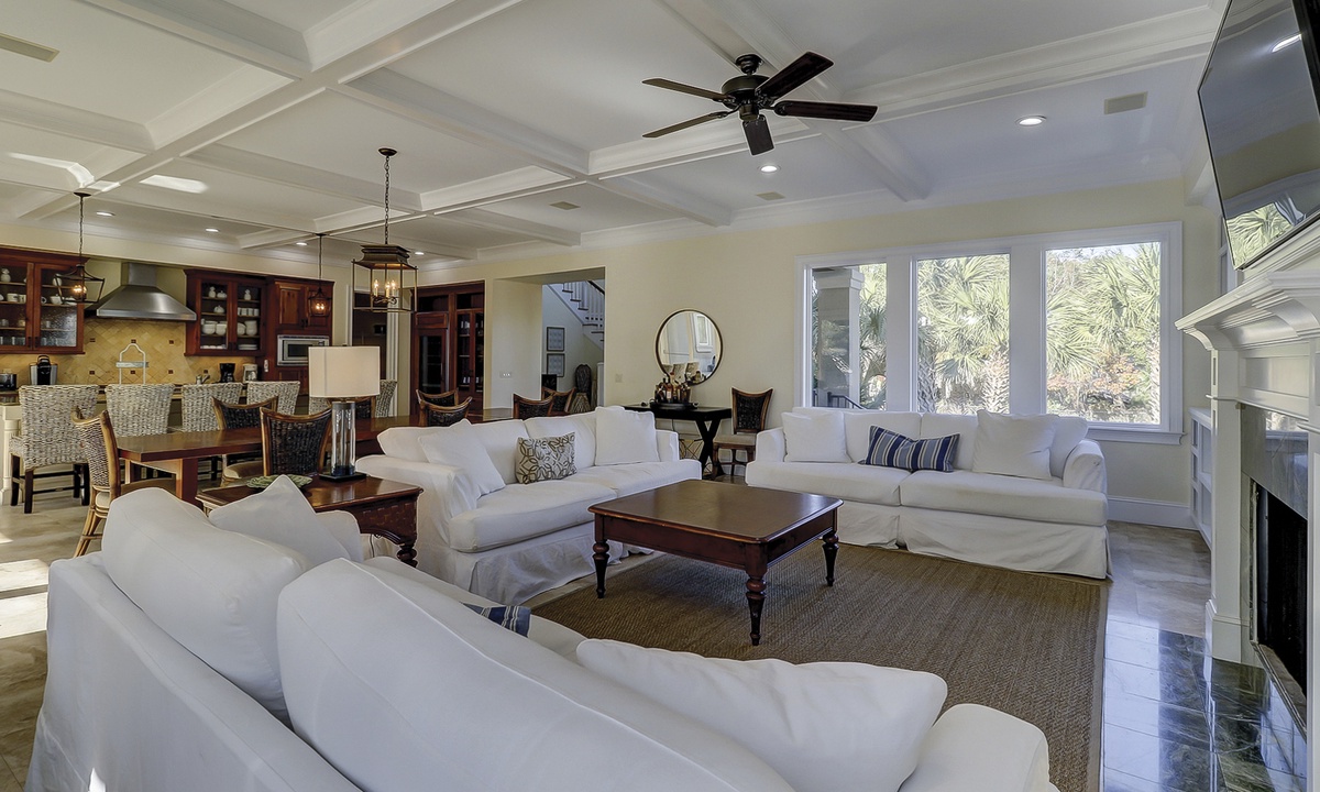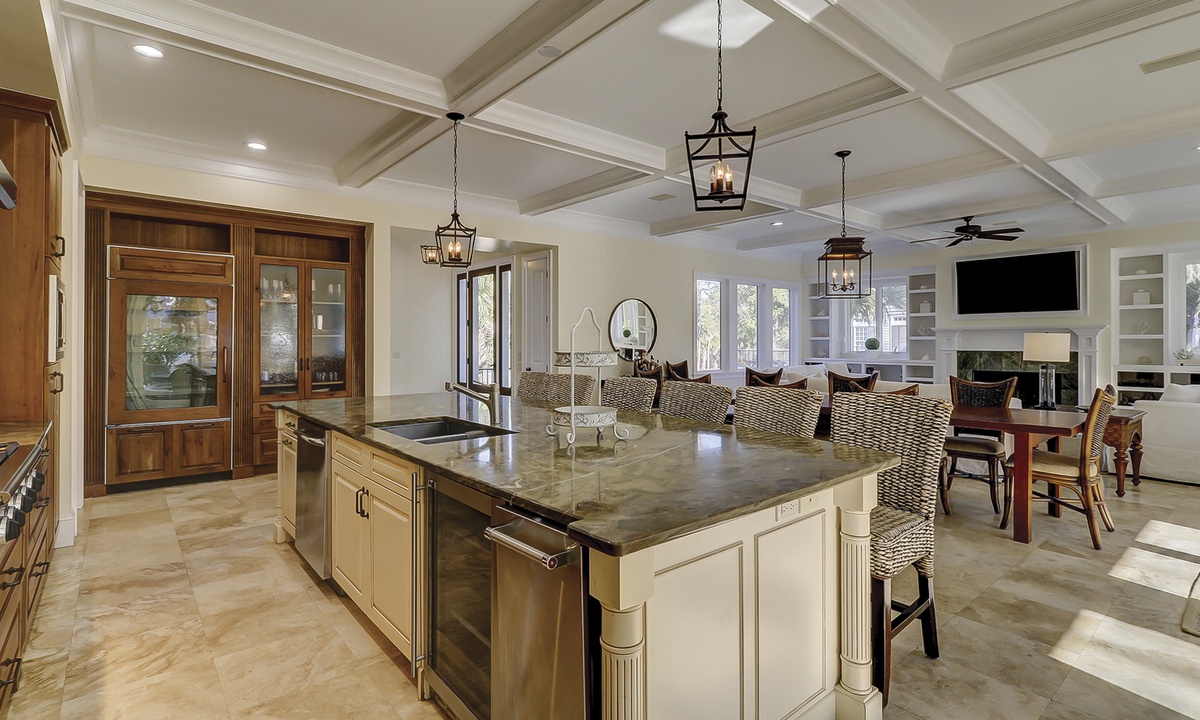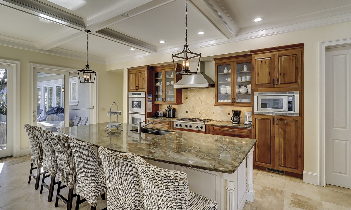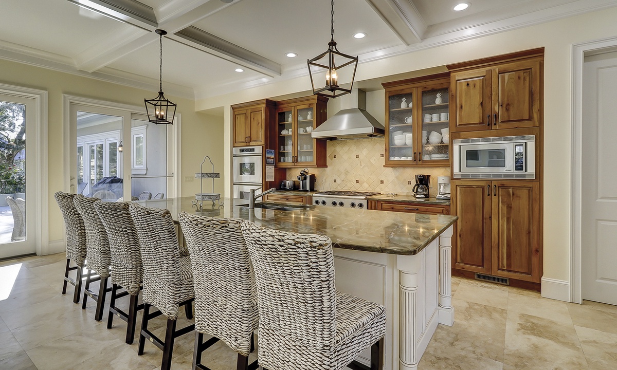 To the left of the 2-story entry foyer is an idyllic great room with an inviting 3- piece seating group and a mounted flat screen TV, located above the impressive fireplace mantle. **Fireplace is not for guest use.** A wall of windows provides views of palmetto trees and a glimpse of the ocean just beyond that. A state-of-the-art gourmet kitchen defined by a spacious island with a sink, dishwasher, wine cooler, and 6 wicker bar chairs sits along the back wall of the living room. For added comfort, the ornate kitchen also features a sub-zero refrigerator, double wall ovens, a gas cook-top stove, a standard and a Keurig coffee maker, a walk-in pantry, and frosted glass cabinetry. Everyone can gather together at the banquet size, wooden, dining table occupying the center of the room and complete with 12 plush chairs. The room's outside wall includes 2 sets of sliding doors that lead out to the relaxing pool deck, home to a chic, wicker table with matching chairs, perfect for dining al fresco. Lounge in the pool to stay cool, lay on the deck and soak up the sun, and utilize for your evening barbecues.