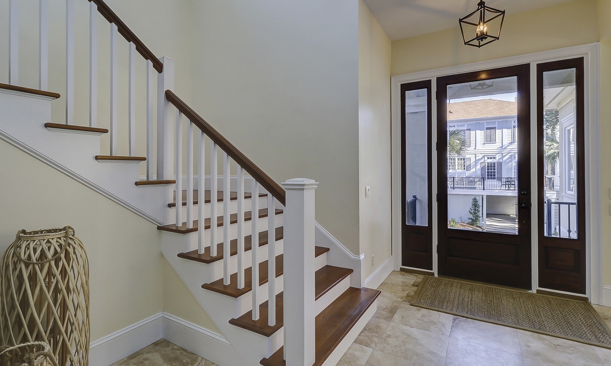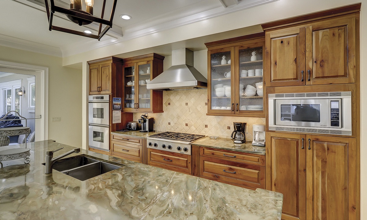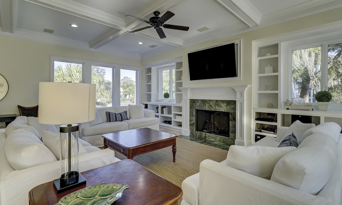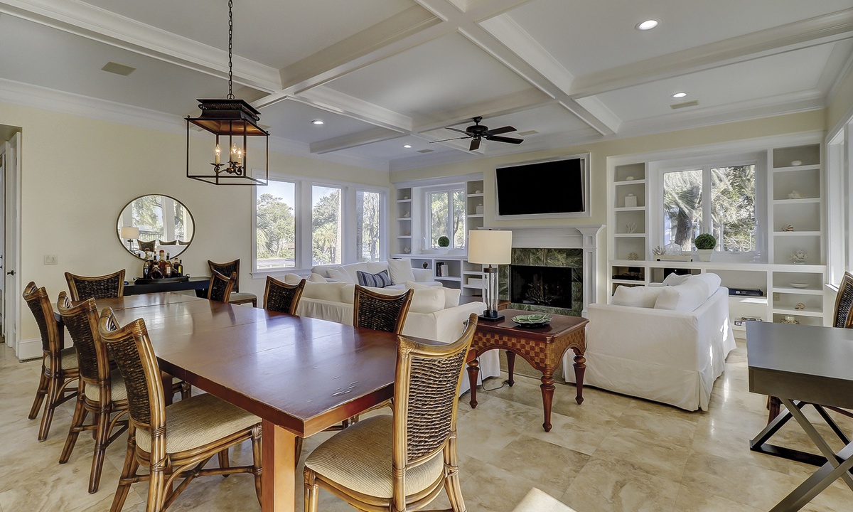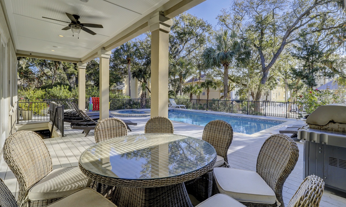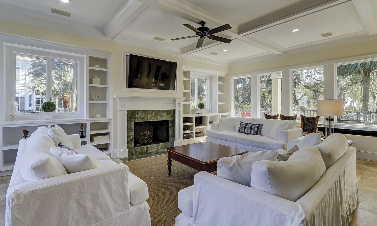 To the left of the 2-story entry foyer is an idyllic great room with an inviting 3- piece seating group and a mounted flat screen TV, located above the impressive fireplace mantle. **Fireplace is not for guest use.** A wall of windows provides views of palmetto trees and a glimpse of the ocean just beyond that. A state-of-the-art gourmet kitchen defined by a spacious island with a sink, dishwasher, wine cooler, and 6 wicker bar chairs sits along the back wall of the living room. For added comfort, the ornate kitchen also features a sub-zero refrigerator, double wall ovens, a gas cook-top stove, a standard and a Keurig coffee maker, a walk-in pantry, and frosted glass cabinetry. Everyone can gather together at the banquet size, wooden, dining table occupying the center of the room and complete with 12 plush chairs. The room's outside wall includes 2 sets of sliding doors that lead out to the relaxing pool deck, home to a chic, wicker table with matching chairs, perfect for dining al fresco. Lounge in the pool to stay cool, lay on the deck and soak up the sun, and utilize for your evening barbecues.