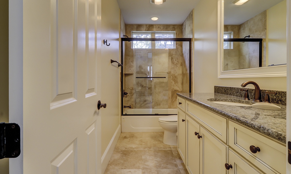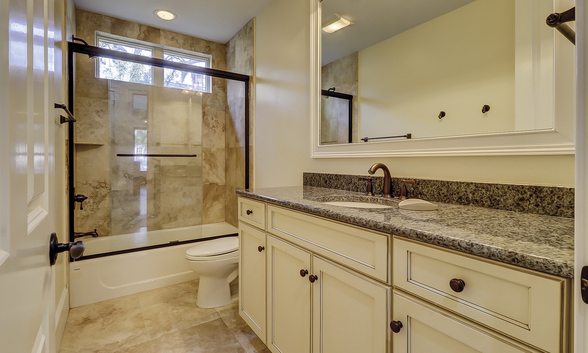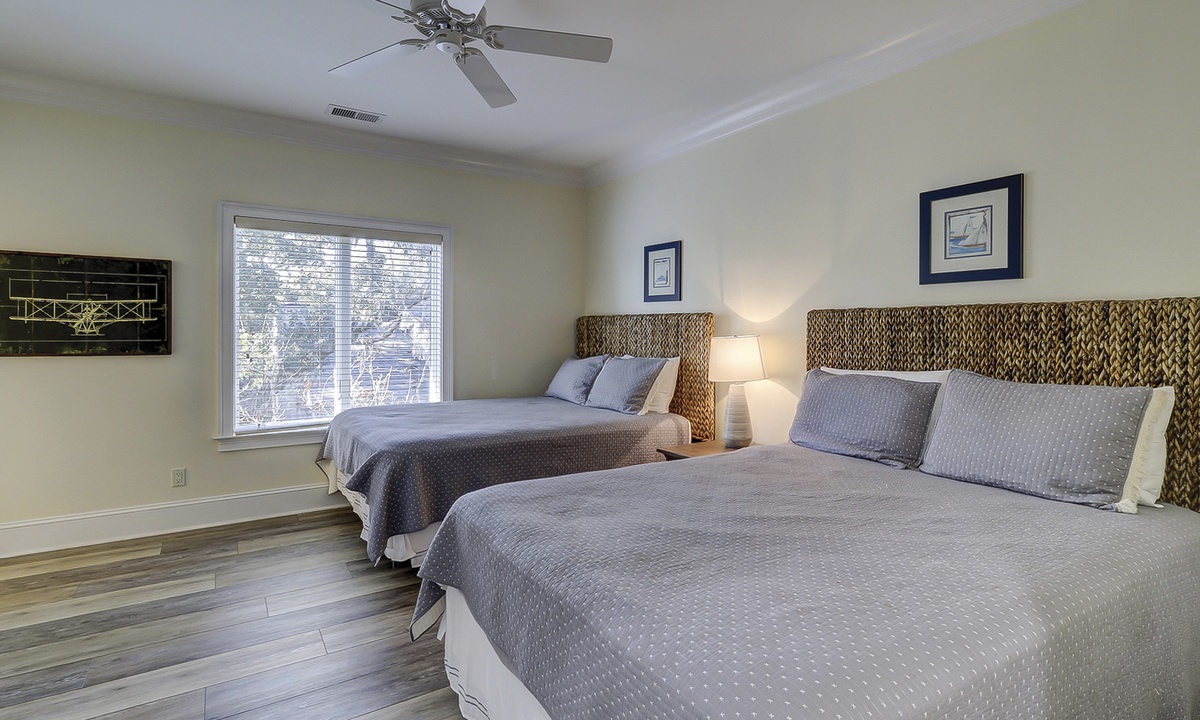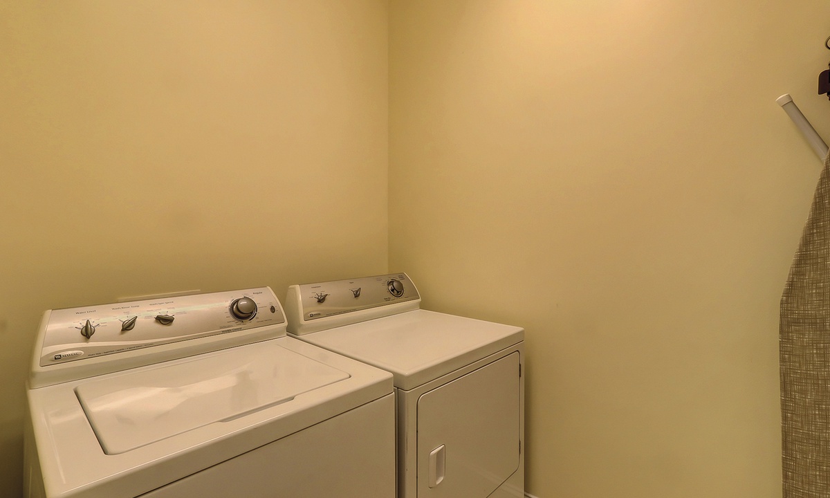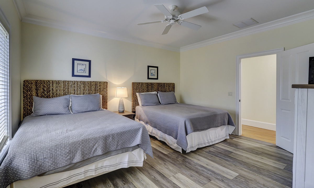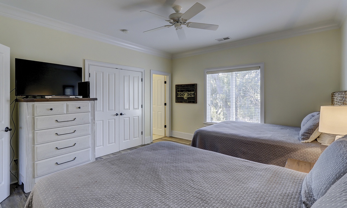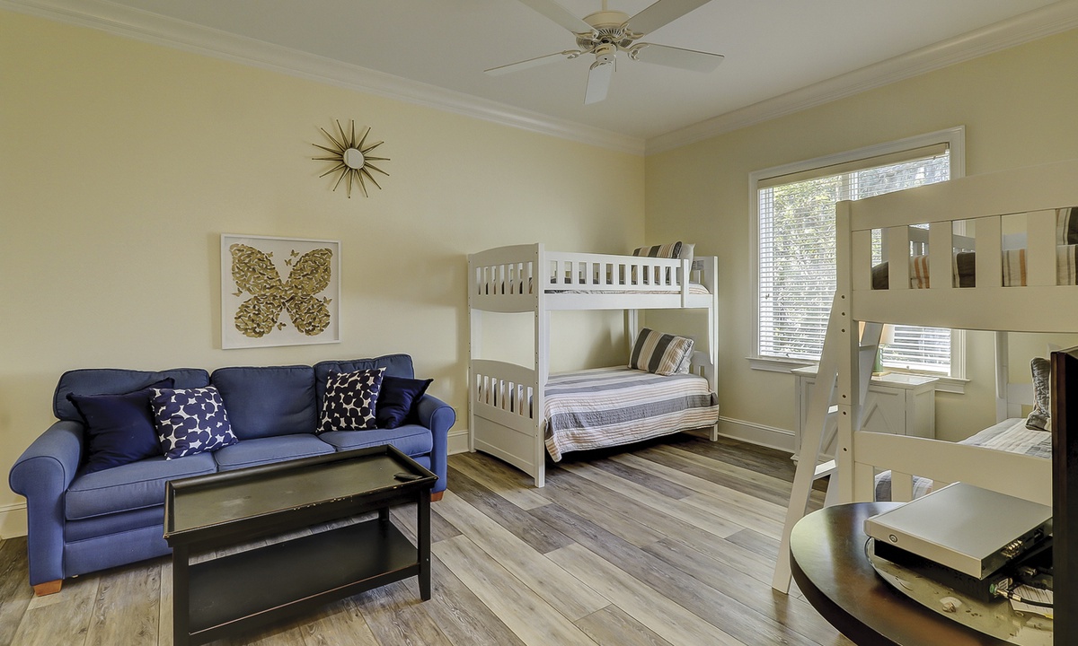 Off of the entry foyer, a second hallway leads to a laundry room, a corner bedroom with a king-size bed, large double closets, and a spacious private bath with a walk-in shower, and a charming kid-friendly bedroom with two sets of bunk beds, a queen sleeper sofa, a TV, and a private bath.