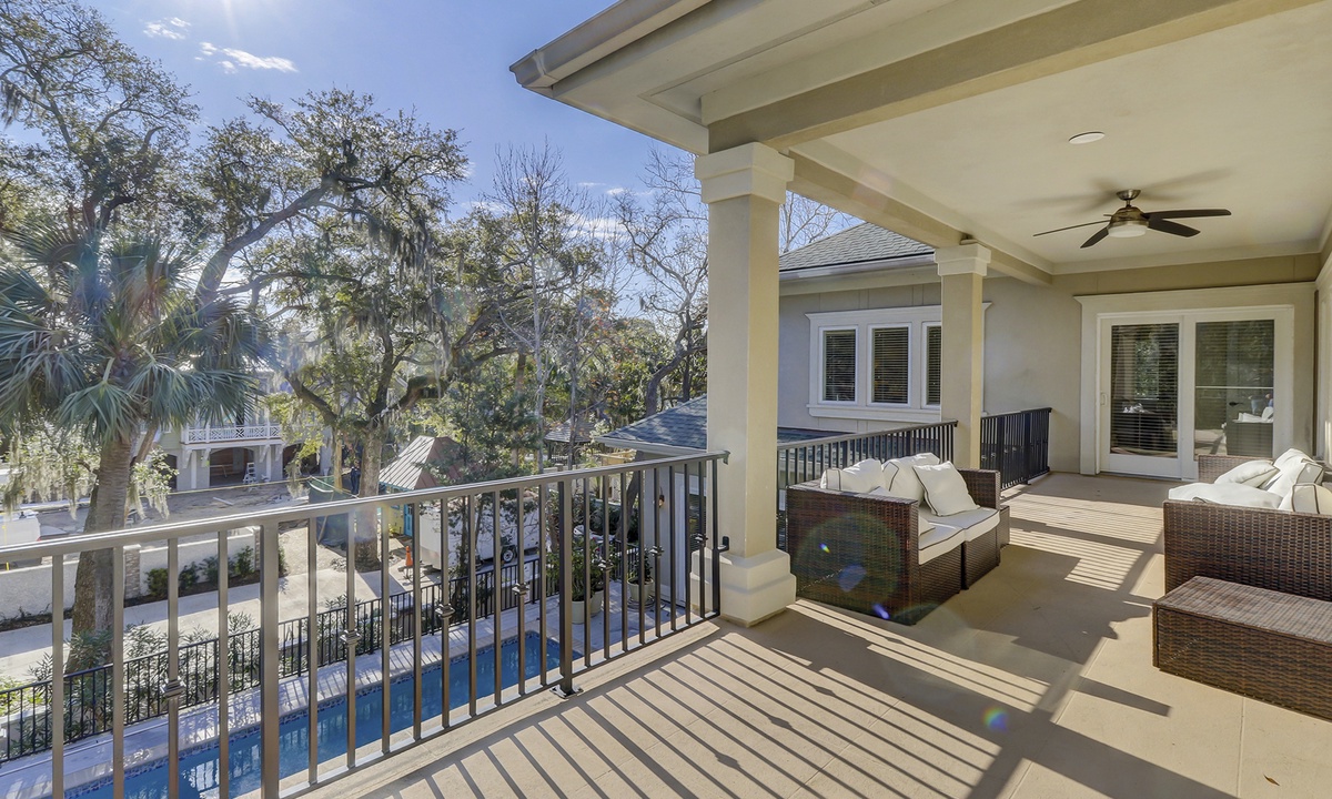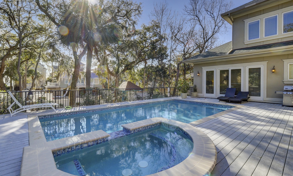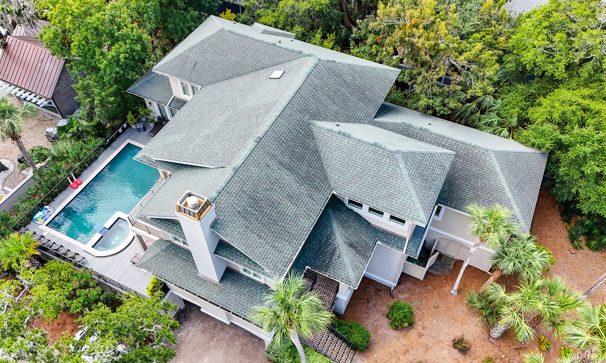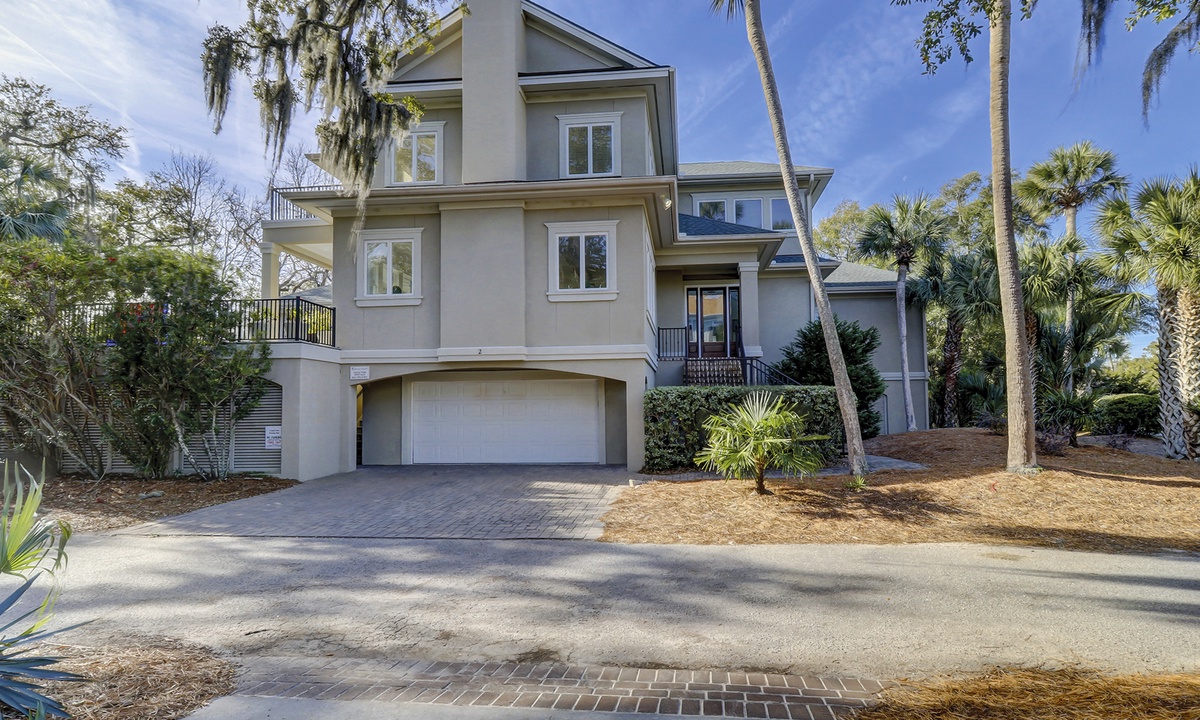 The Hilton Head Island vacation of your dreams awaits at this luxurious 3rd row wonder: 2 Capri Lane in North Forest Beach, Hilton Head. This 7 bedroom, 7.5 bathroom Forest Beach home offers glimpses of the ocean, a raised pool and spa deck, spacious interiors for everyone to lounge, contemporary and coastal furnishings. The raised style of the home allows for garage parking for up to 6 cars at ground level, and an ocean-peak view from both the house and the raised pool and spa deck.