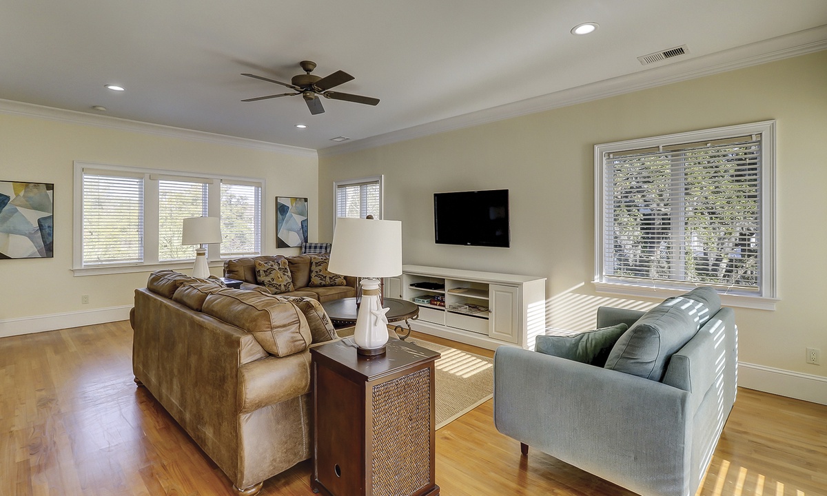 A grand stairway leads to the 2nd floor where there are 3 more bedrooms, a hall bath, a 2nd laundry room, and a spacious family room. The family room is brightened by windows on 3 sides and features comfortable seating, a TV/DVD, a wet bar with small refrigerator, microwave, and coffee maker, as well as a slider door to a deck overlooking the pool. The fifth bedroom is a secondary suite with a king-size bed, a TV, a walk-in closet, a slider door to the deck, and a private bath with a spa tub and walk-in shower. Bedroom #6 has 2 queen beds, a TV, and a private bath, and bedroom #7 has a king-size bed, a TV, a slider door to the deck, and a private half-bath with a connecting door to a shared shower with the hall bath.