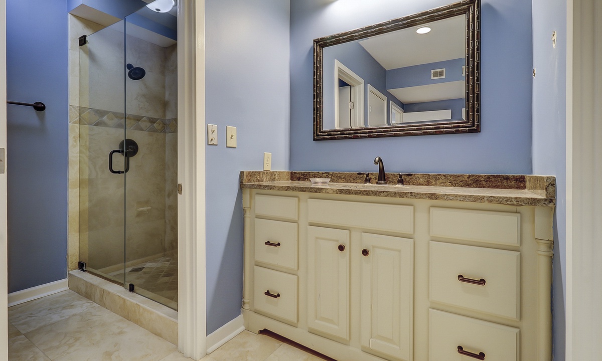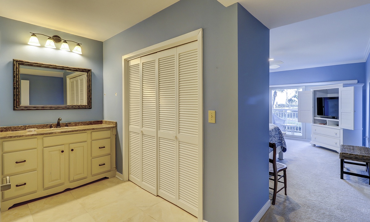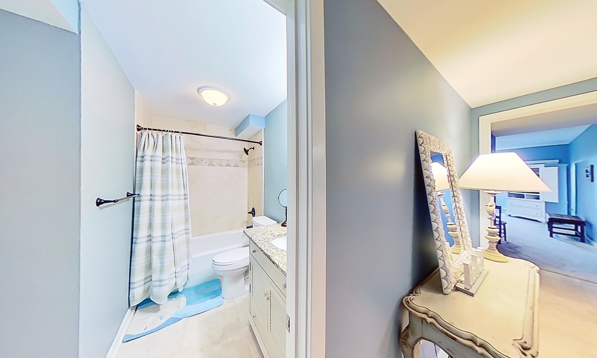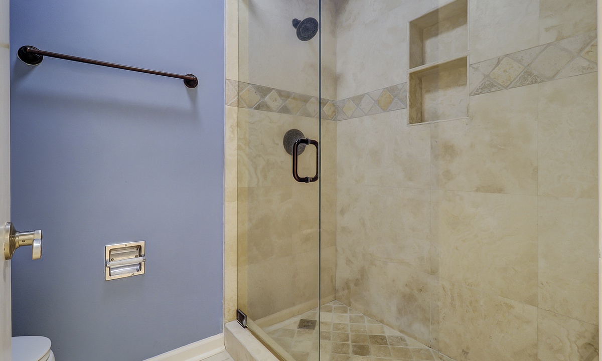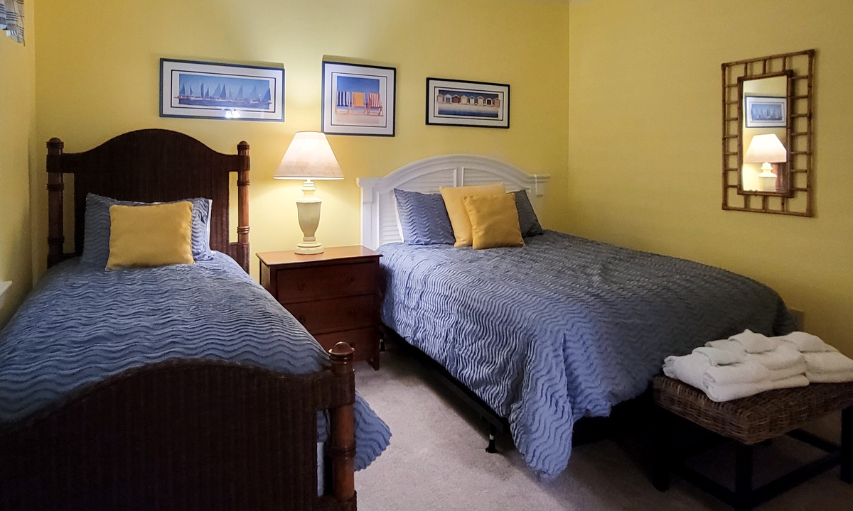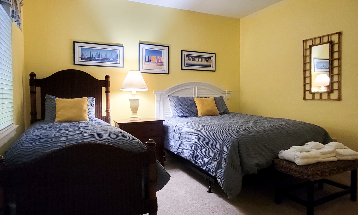 The primary bedroom features a queen- size bed, a TV, windows looking out to the landscape view, and a private bathroom with a granite top vanity and a walk-in shower. The guest bedroom is home to queen size bed and a twin bed with its own private bathroom with tub/ shower combination.