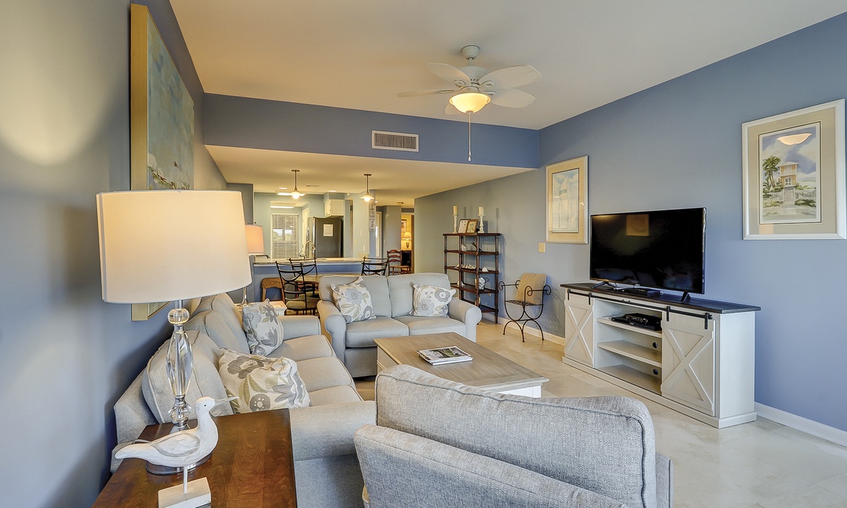 The dining area has seating for four and adjoins the living room, which features a 3 piece seating group, a TV/ DVD, and a full wall and a half of windows with a slider door to the deck. A set of stairs from the deck will take you down to the ocean or community pool.