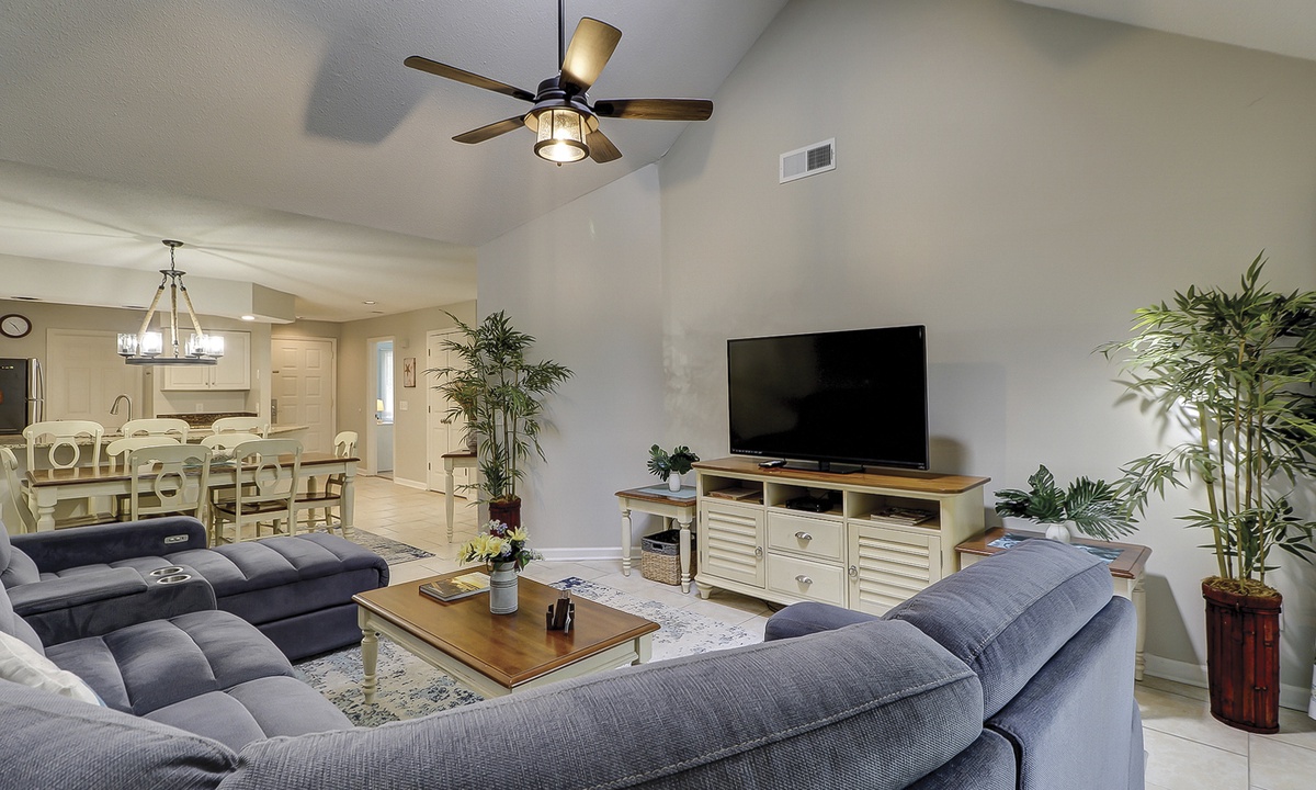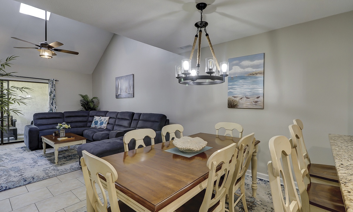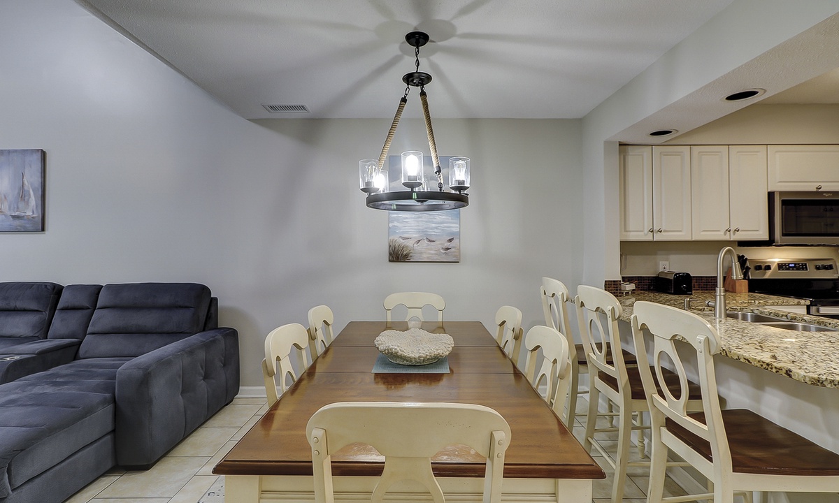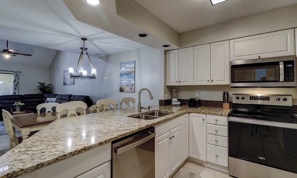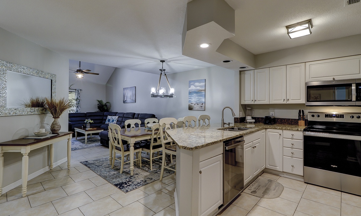 The spacious living area features a sectional sofa, Smart TV and access to the private balcony overlooking the natural landscape. Just beyond the living area is the dining table with seating for 6 with additional seating for 3 at the kitchen bar. The well-equipped kitchen features granite counters, stainless appliances and plenty of cabinet space.