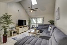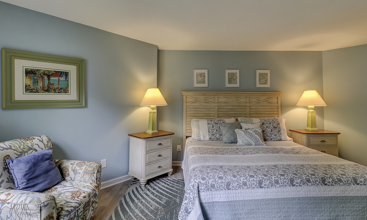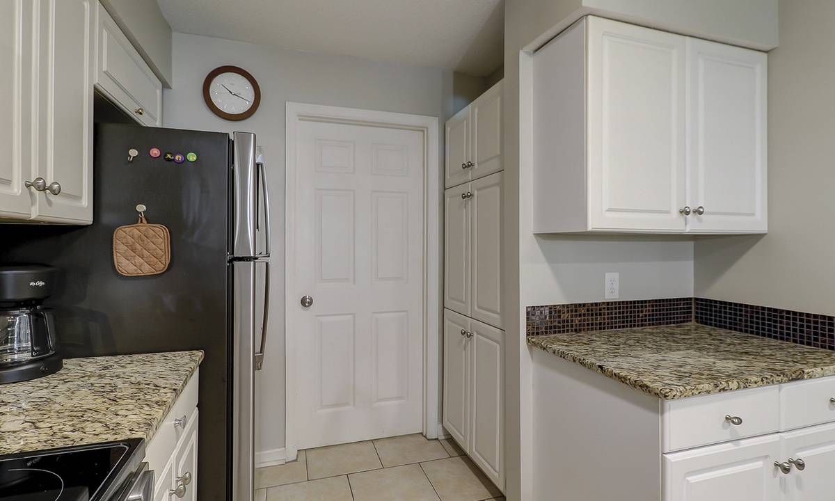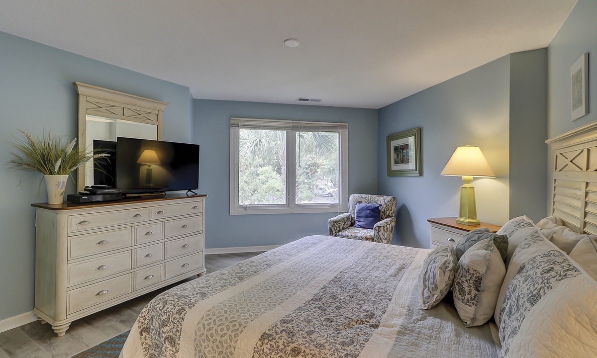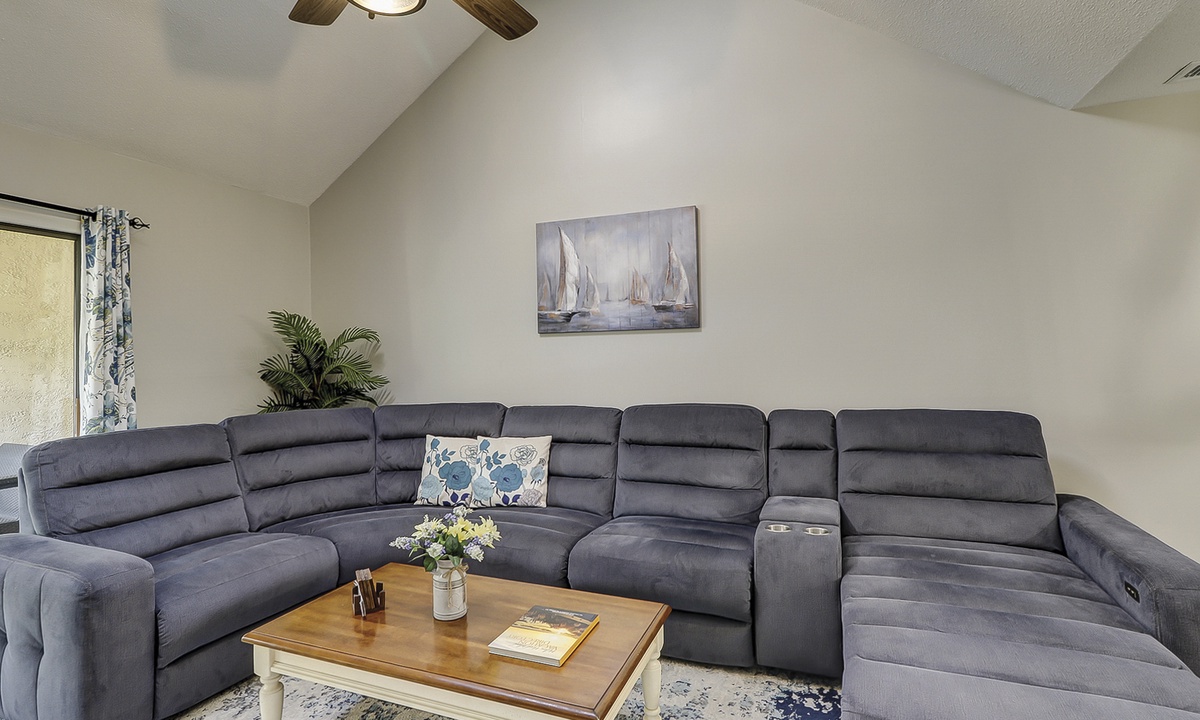 The spacious living area features a sectional sofa, Smart TV and access to the private balcony overlooking the natural landscape. Just beyond the living area is the dining table with seating for 6 with additional seating for 3 at the kitchen bar. The well-equipped kitchen features granite counters, stainless appliances and plenty of cabinet space.