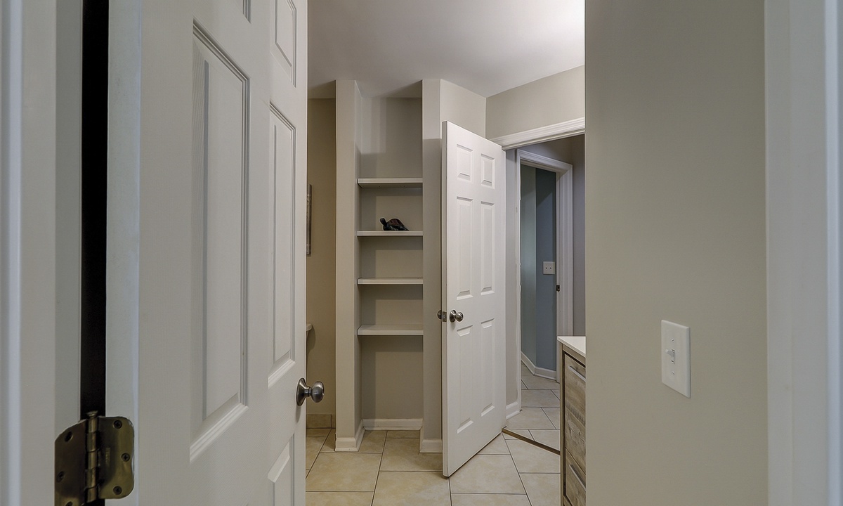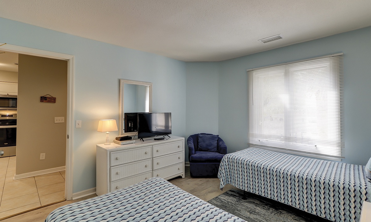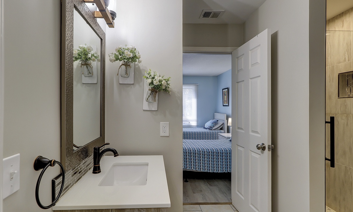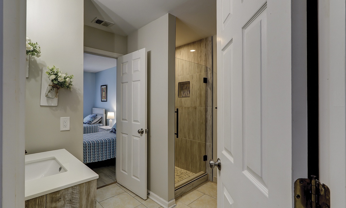 The guest bedroom features 2 twin beds, a TV and shares access with a hall bathroom featuring a walk-in shower.