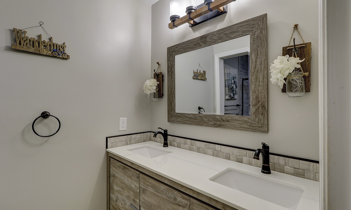 The large main bedroom has a king bed, TV and a private bathroom. This remodeled en-suite has a large vanity area and a tiled tub/shower combination.