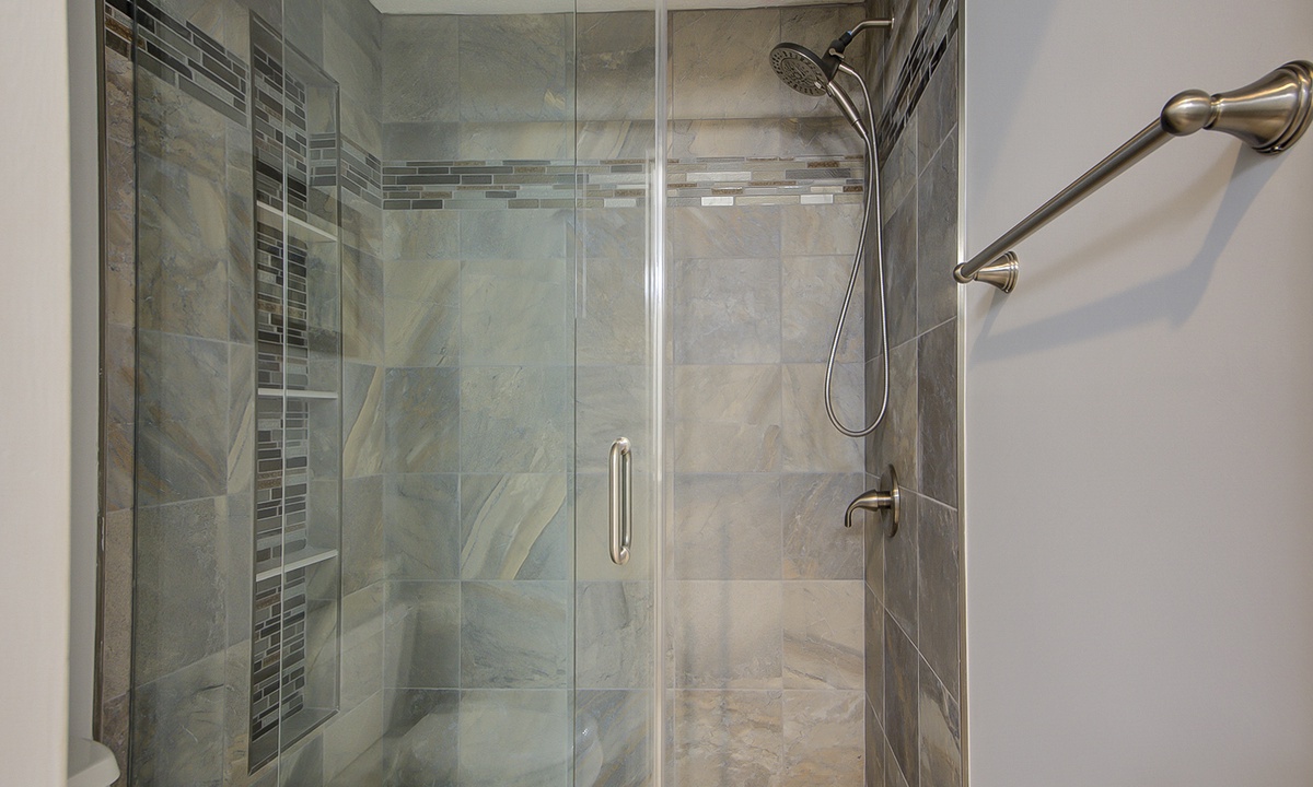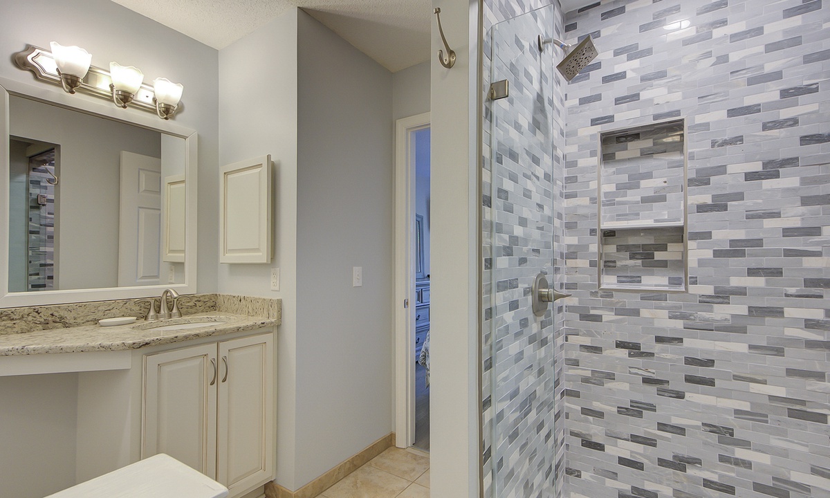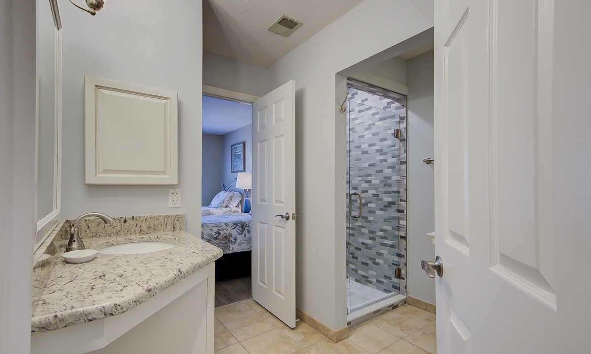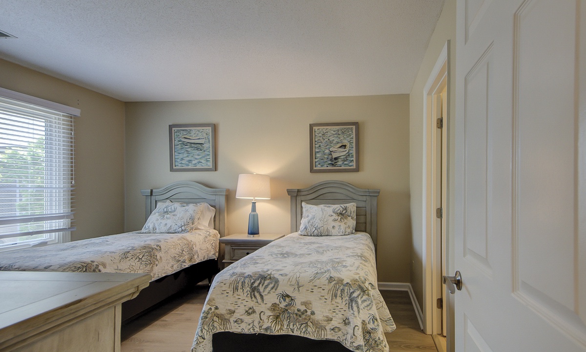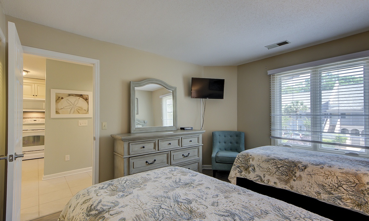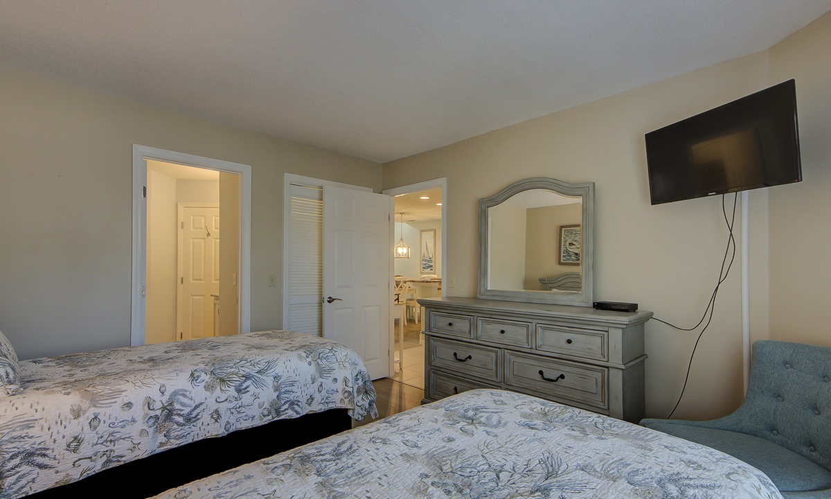 The guest bedroom features 2 new twin beds and a flat screen TV. This room has access to to a hall bath with a new tiled walk-in shower.