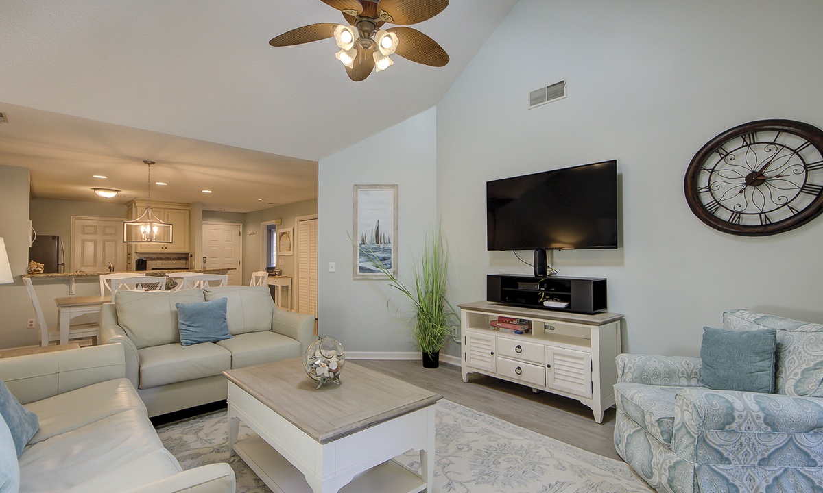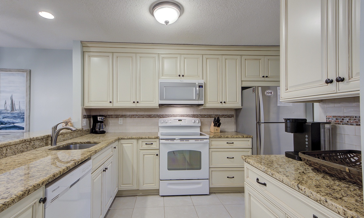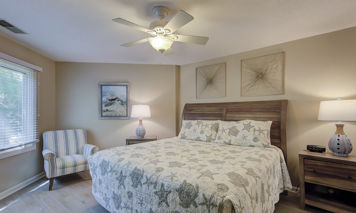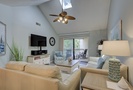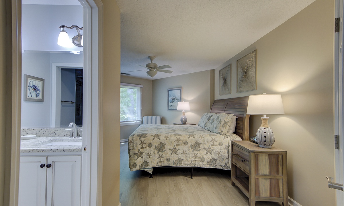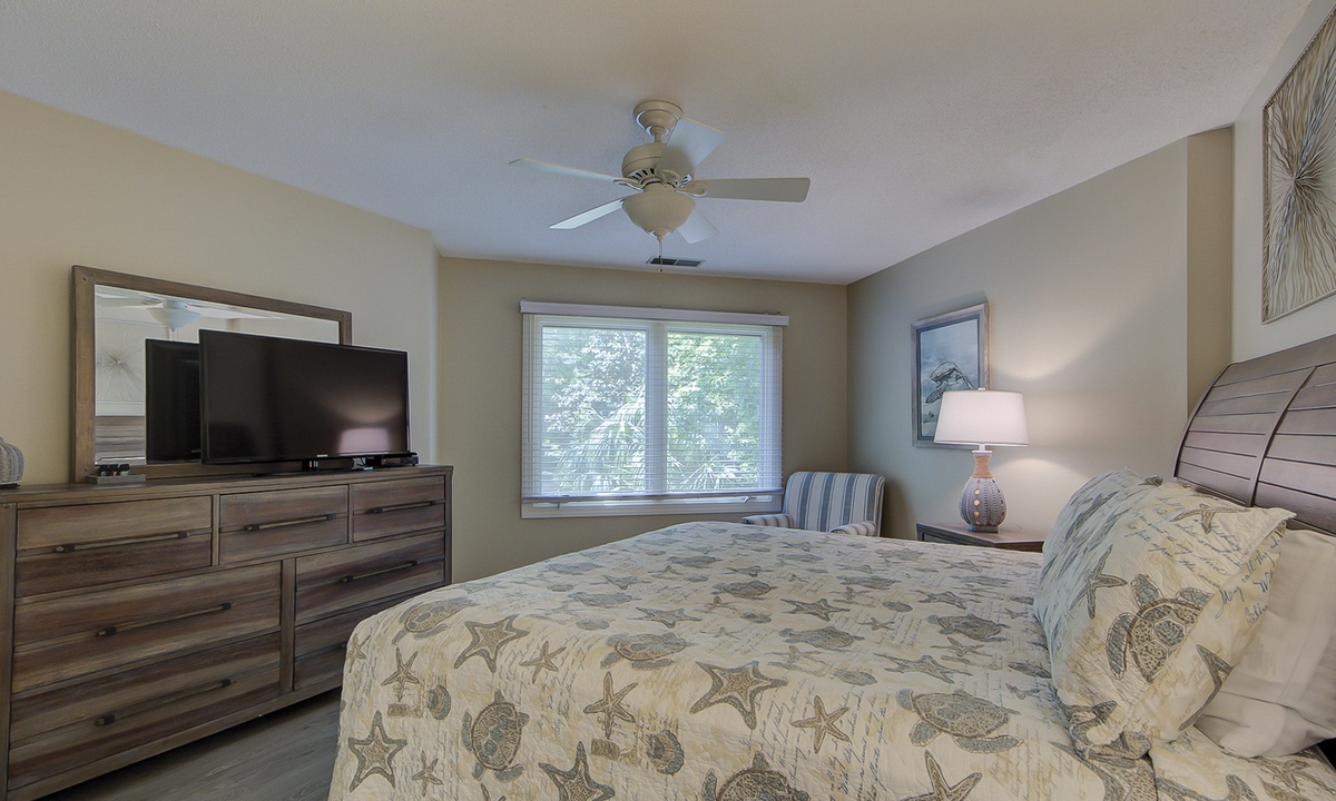 The living area is outfitted with a leather sleeper sofa, loveseat and a large wall-mounted TV. You can also access the private patio through doors in the living room. Enjoy the island view while you relax on the rockers with your cup of coffee or glass of wine.