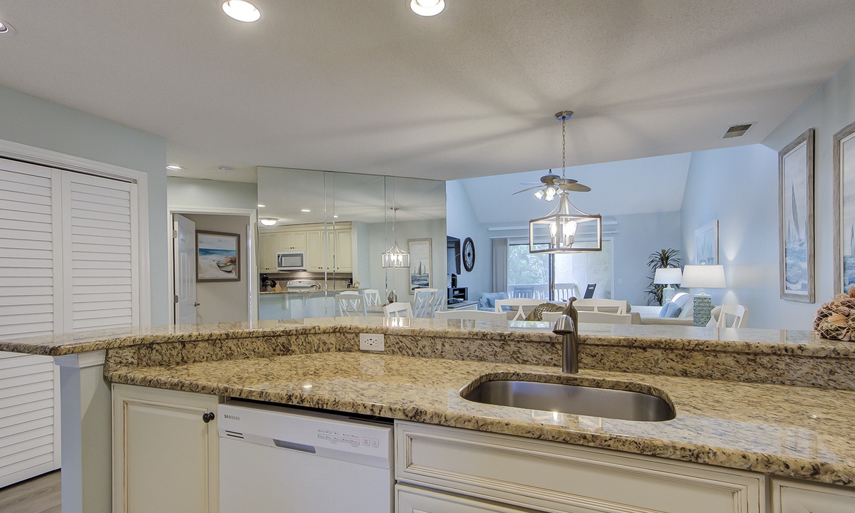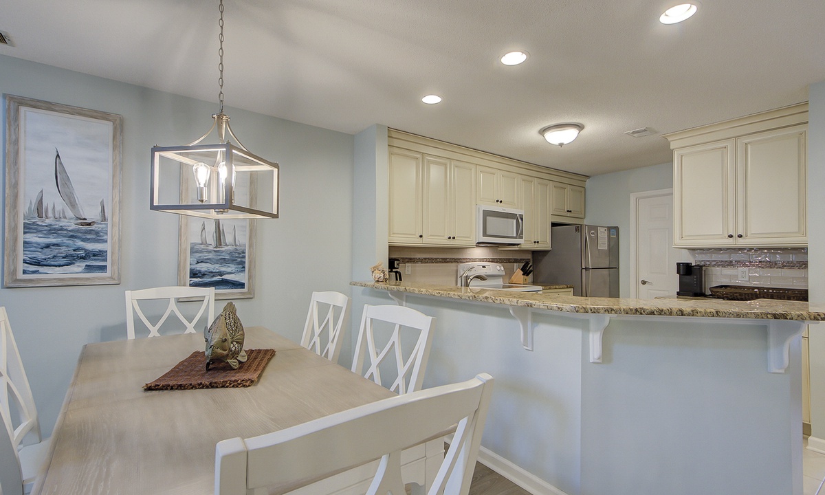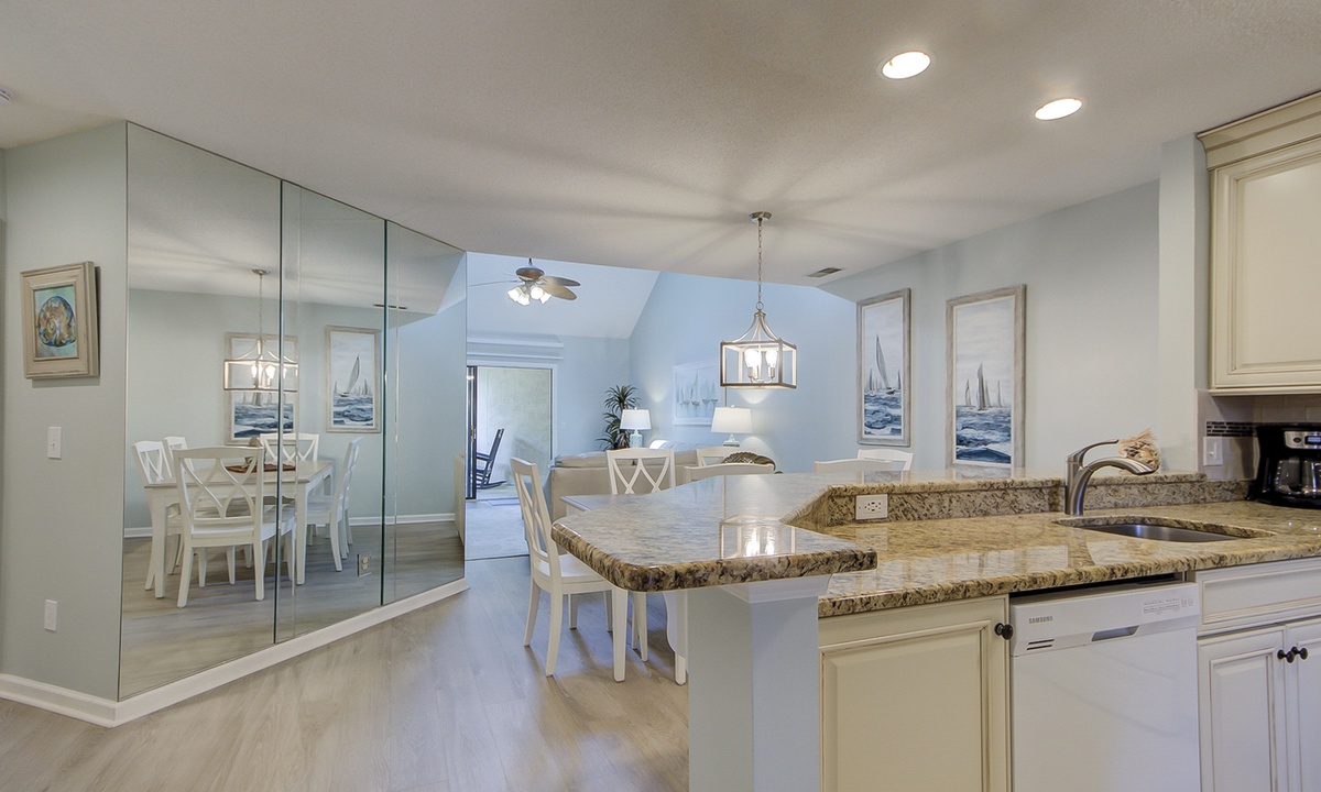 The beautifully updated kitchen has granite counters, custom cabinetry and new appliances. Enjoy a home cooked meal using the air fryer, crock pot and rice cooker/steamer. The dining area, which is between the kitchen and living room, features seating for 6.