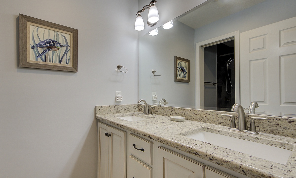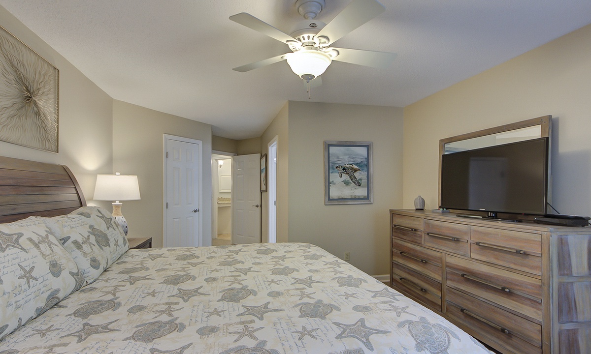 The main bedroom features a new king Marriott mattress, large walk-in closet and a large flat screen TV. This room also has a private bathroom with granite double sinks and a new walk-in shower!