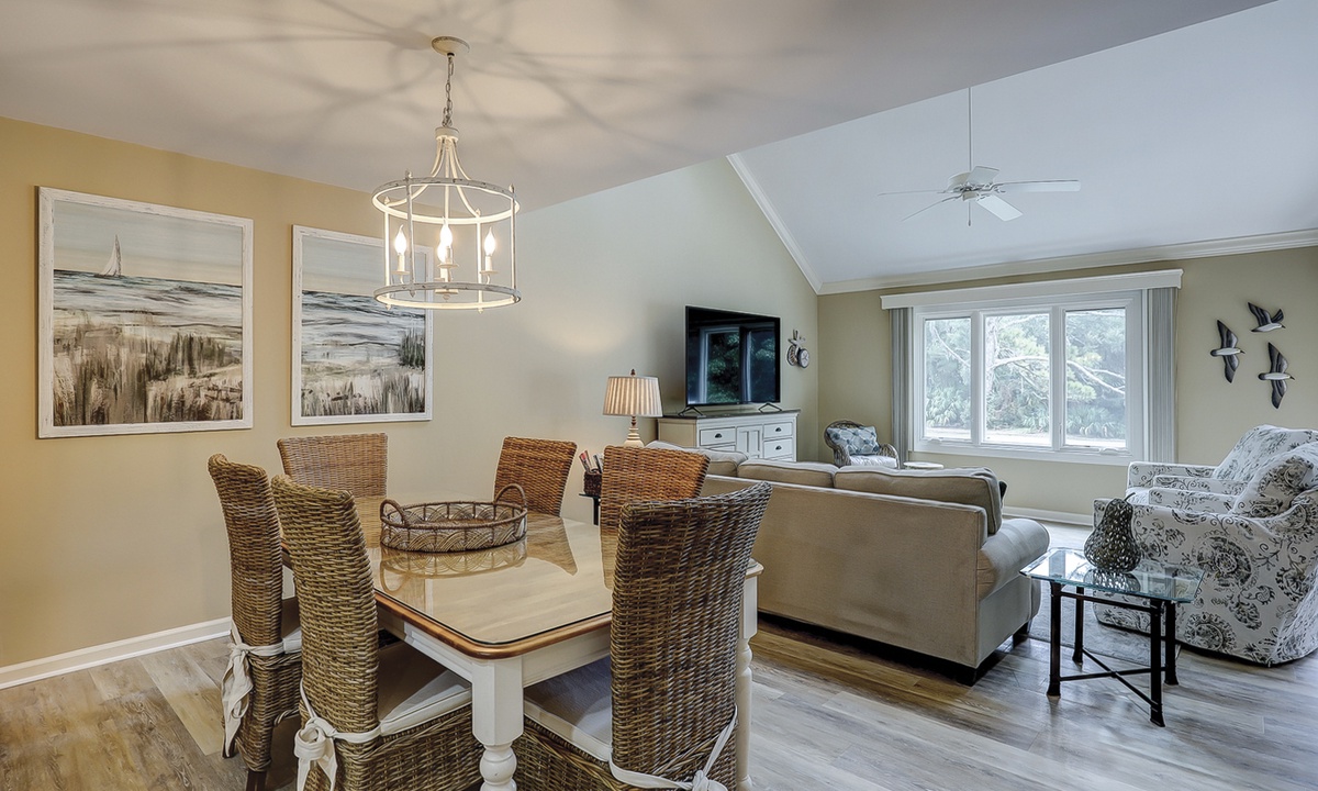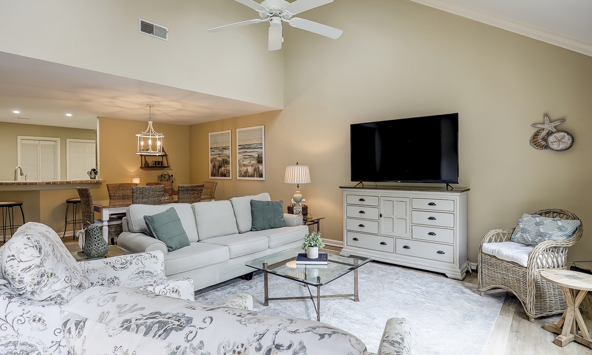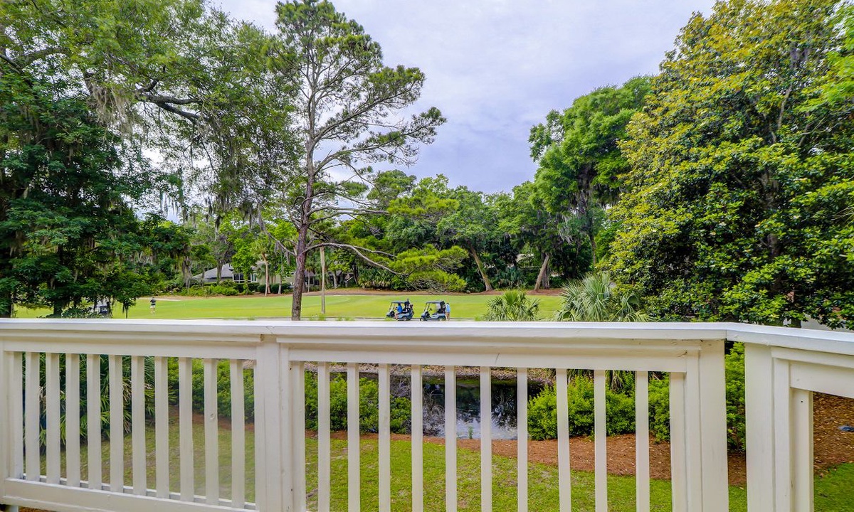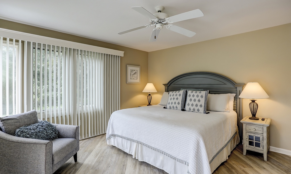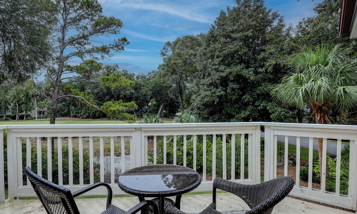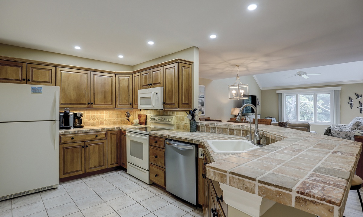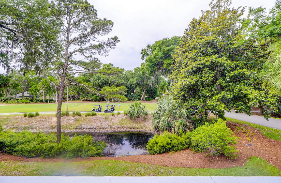 The beautifully outfitted living area features comfortable furniture, a Smart TV and access to the private balcony overlooking the golf course and lagoon. Enjoy your morning coffee while being surrounded by the low country wildlife and golfers teeing off.