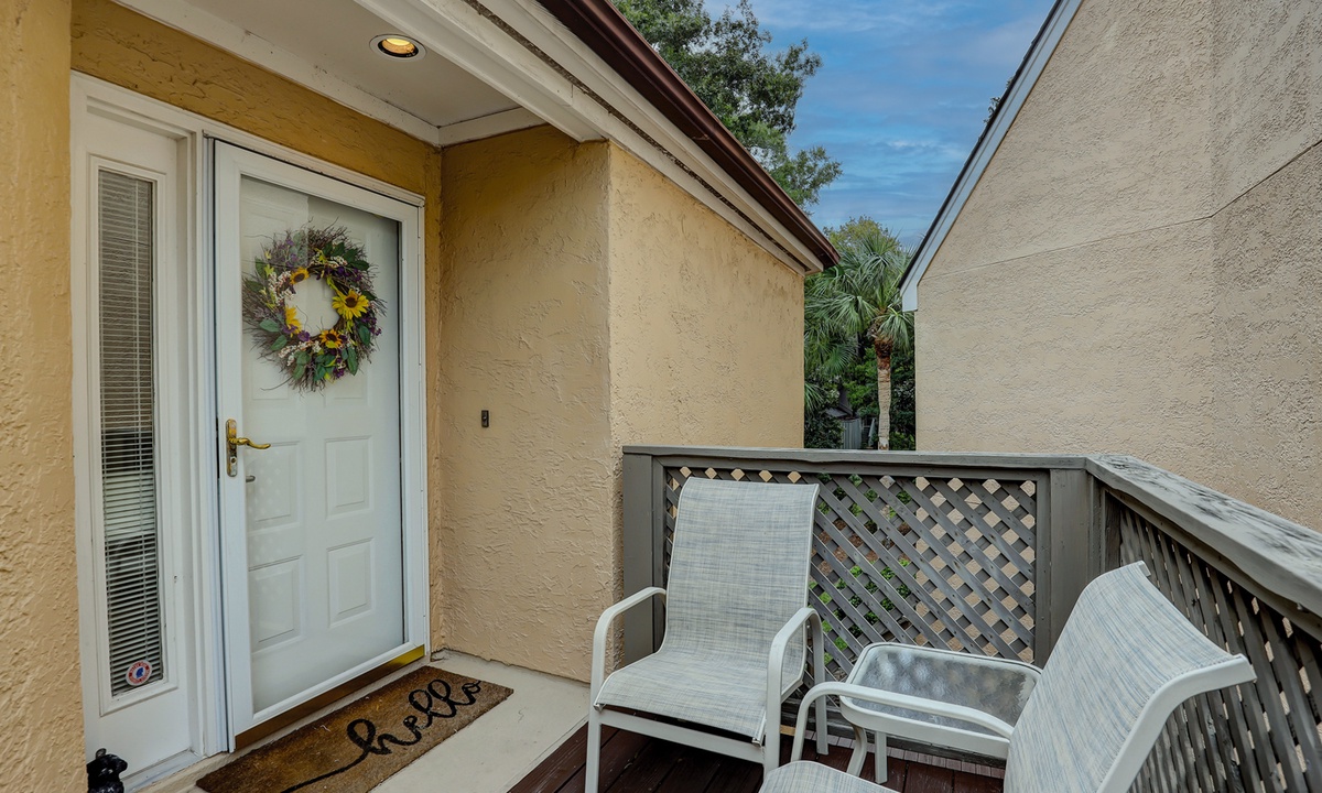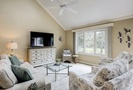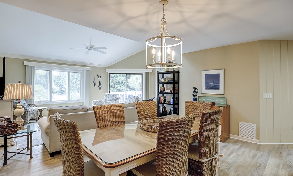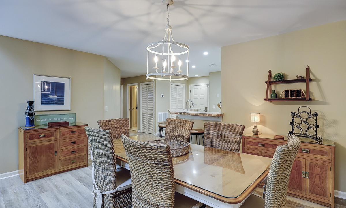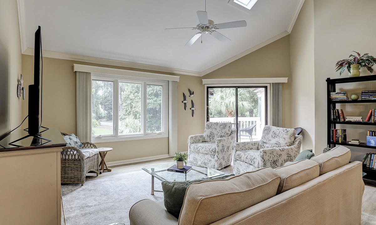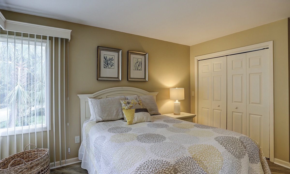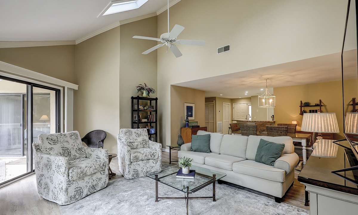 The beautifully outfitted living area features comfortable furniture, a Smart TV and access to the private balcony overlooking the golf course and lagoon. Enjoy your morning coffee while being surrounded by the low country wildlife and golfers teeing off.