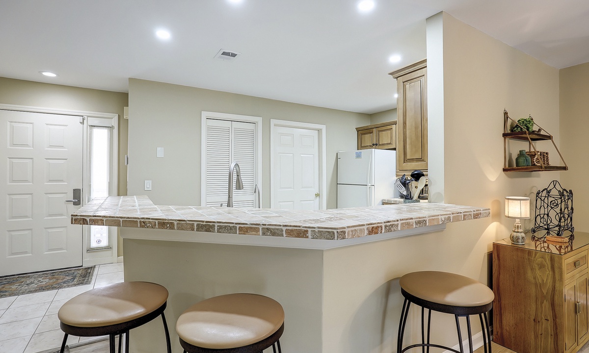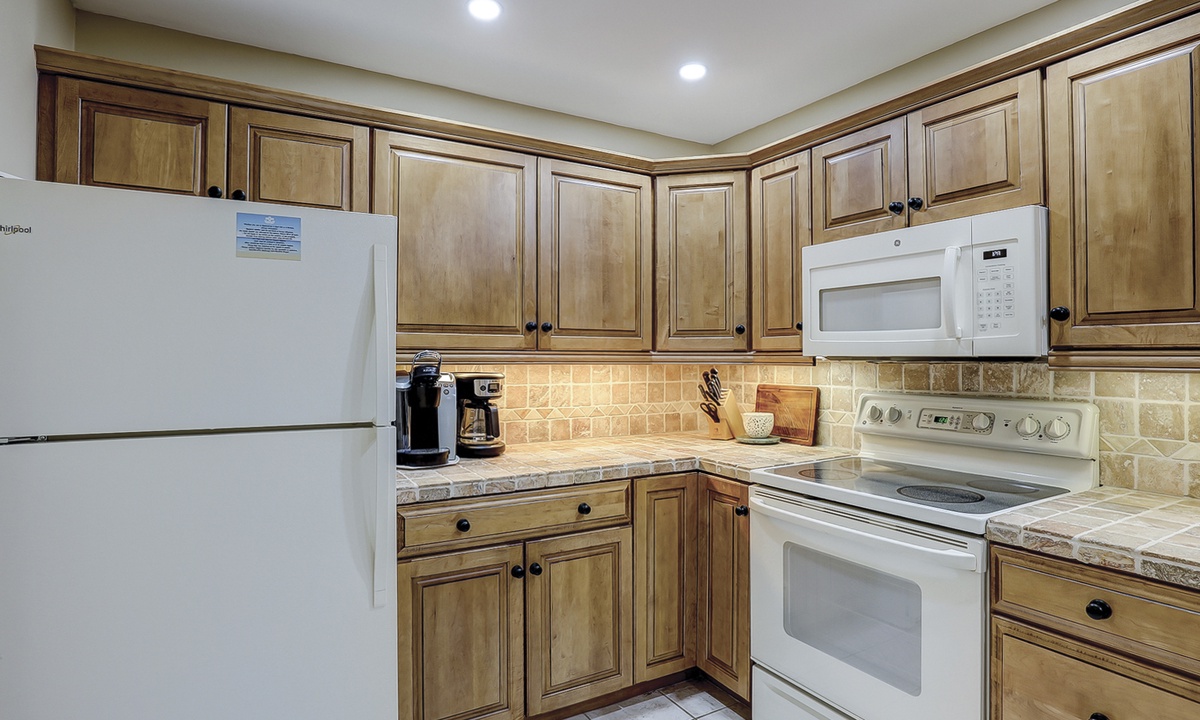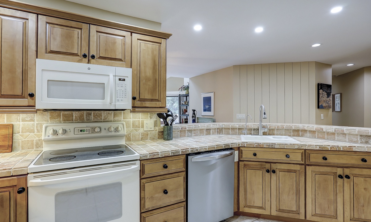 Just off the living area is the dining space with seating for 6. Beyond you'll find the updated kitchen with solid maple and oak cabinets, tiled counters and a Keurig coffee maker.