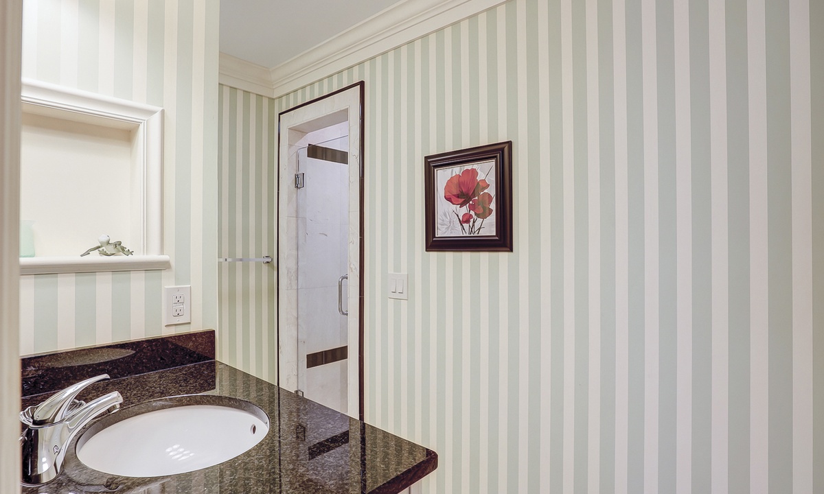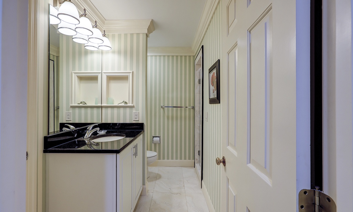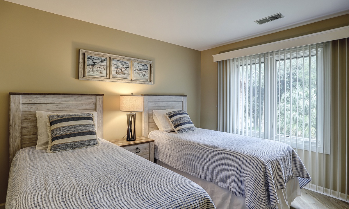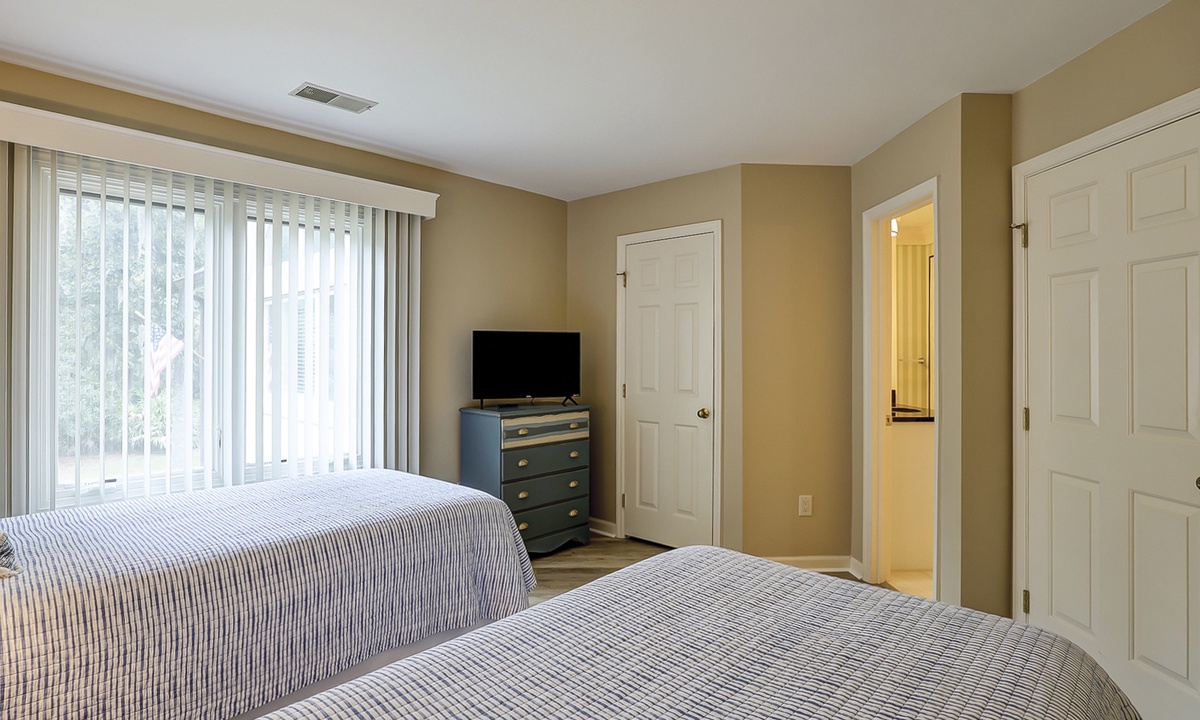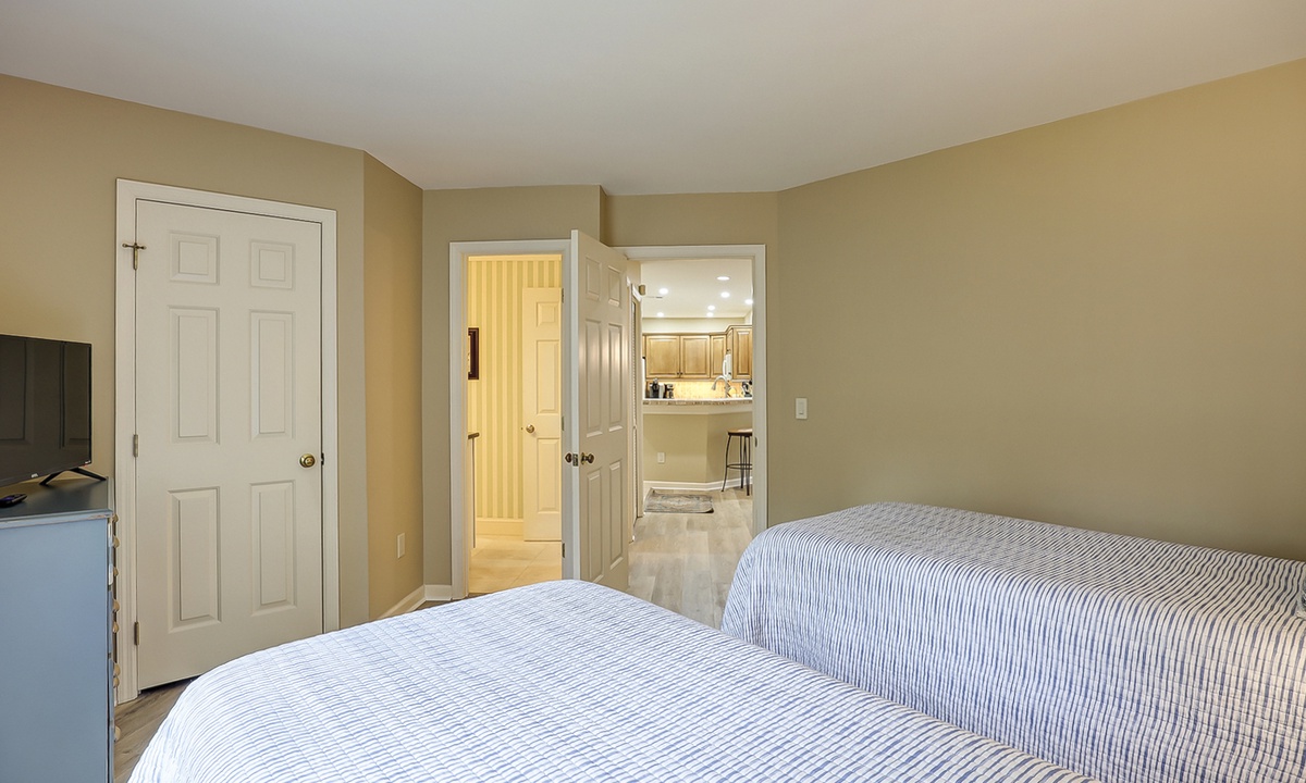 Down the hall you'll find the first of three bedrooms. The first bedroom has 2 twin beds, a Smart TV and a bathroom with a tiled walk-in shower.
