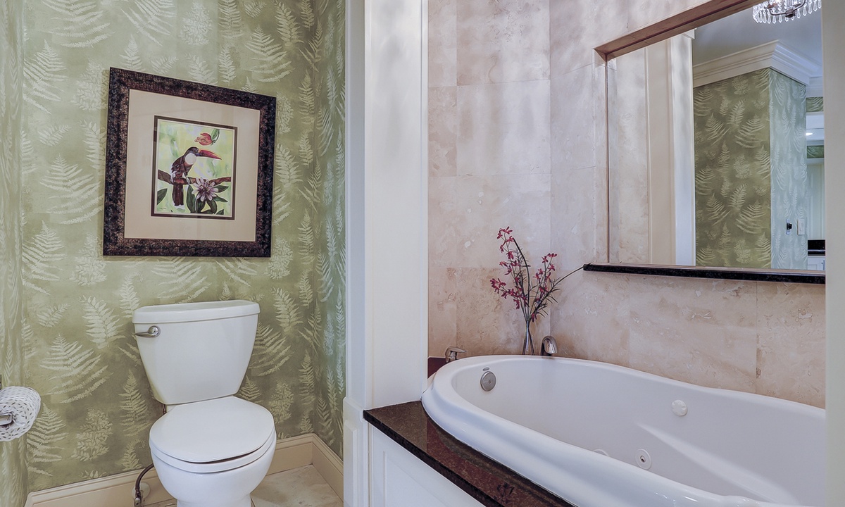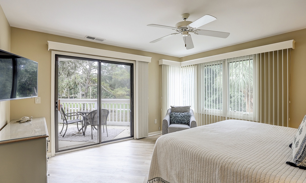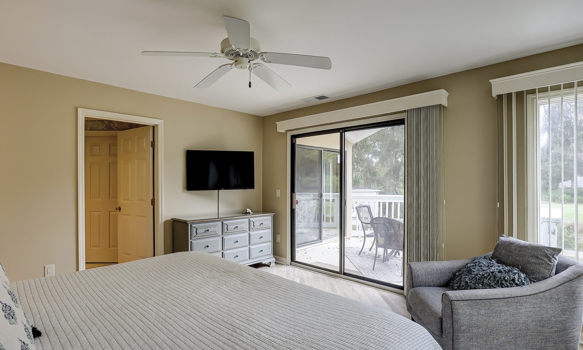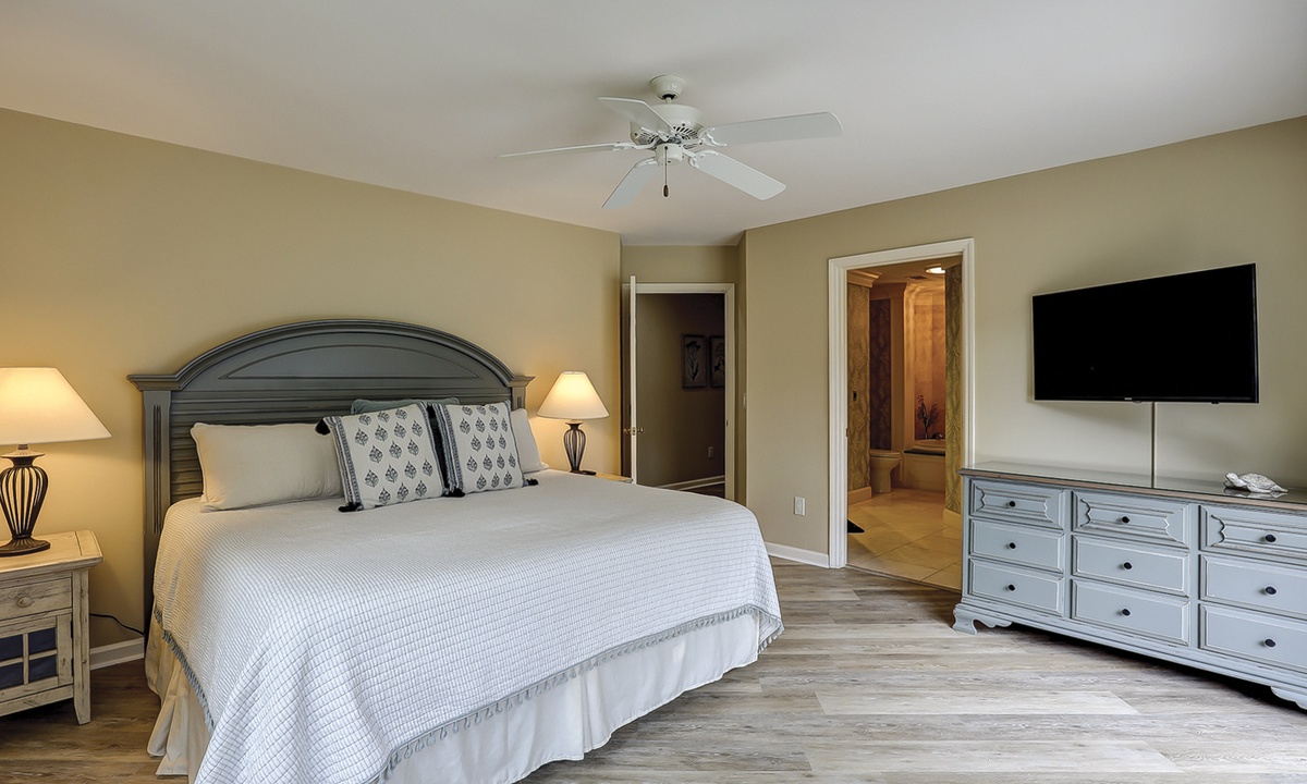The main bedroom offers a king bed, Smart TV and a luxurious bathroom with a jacuzzi tub and walk-in shower. This room also has amazing golf course views and access to the private balcony patio.