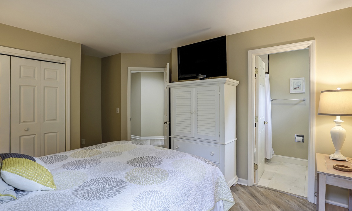 The second bedroom features a queen bed, Smart TV and a private bathroom with tiled tub/shower combination.