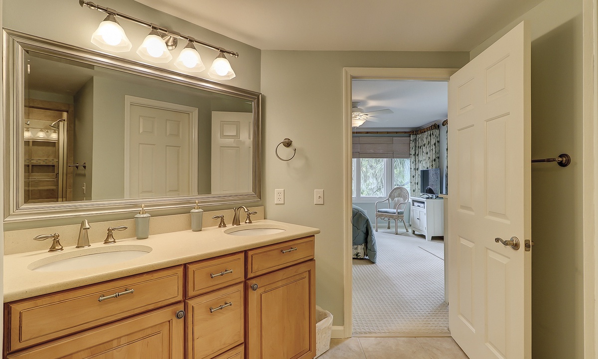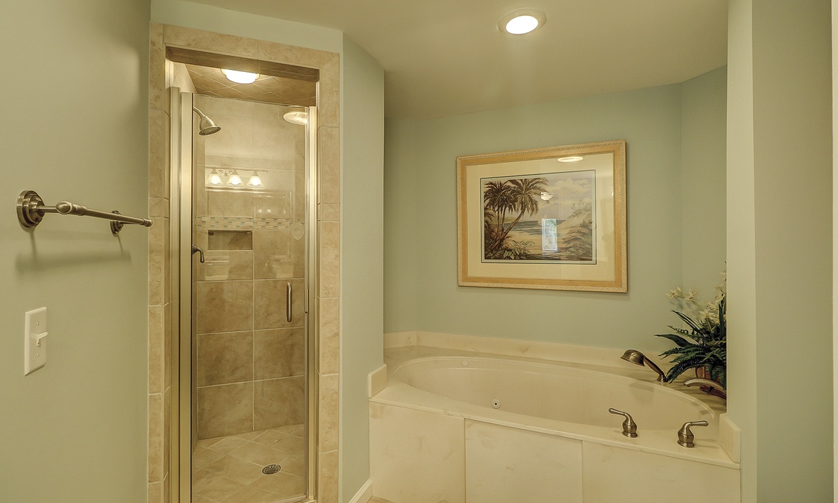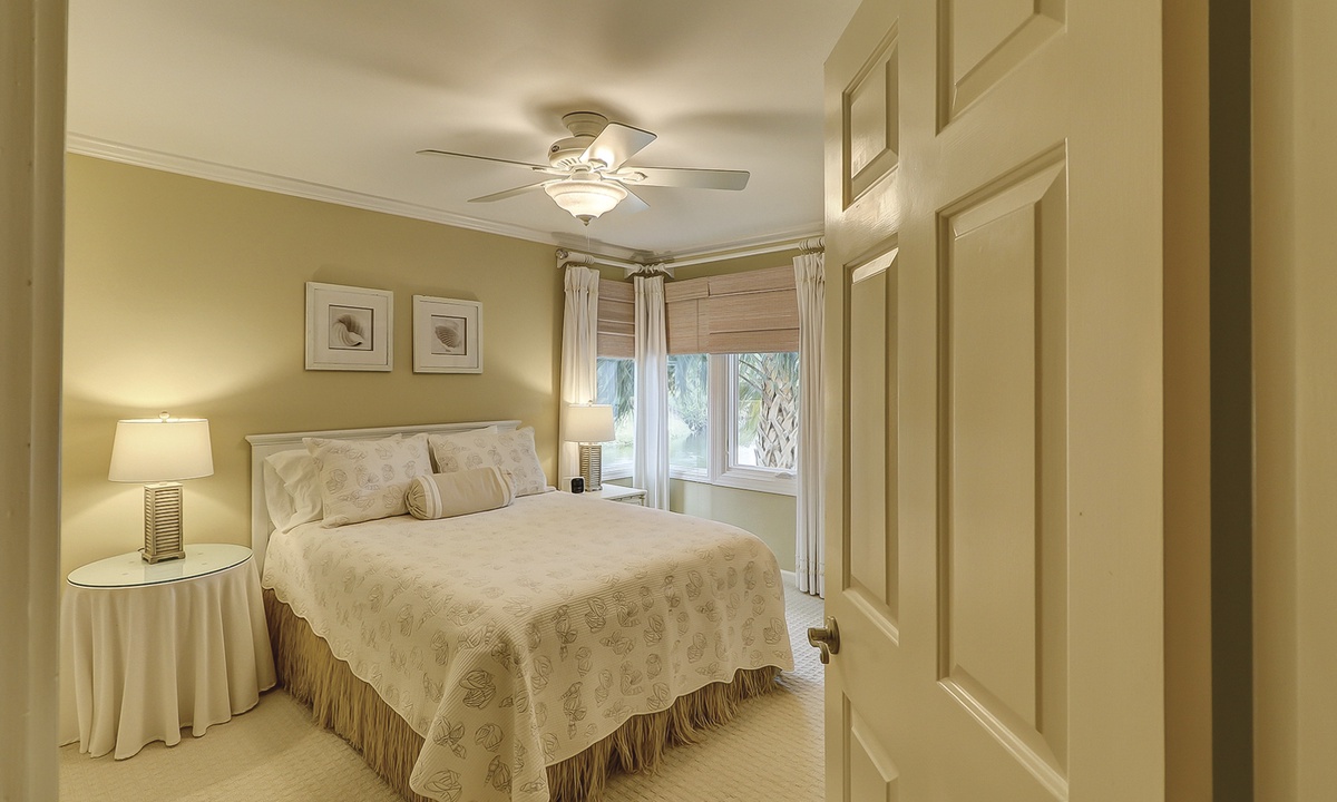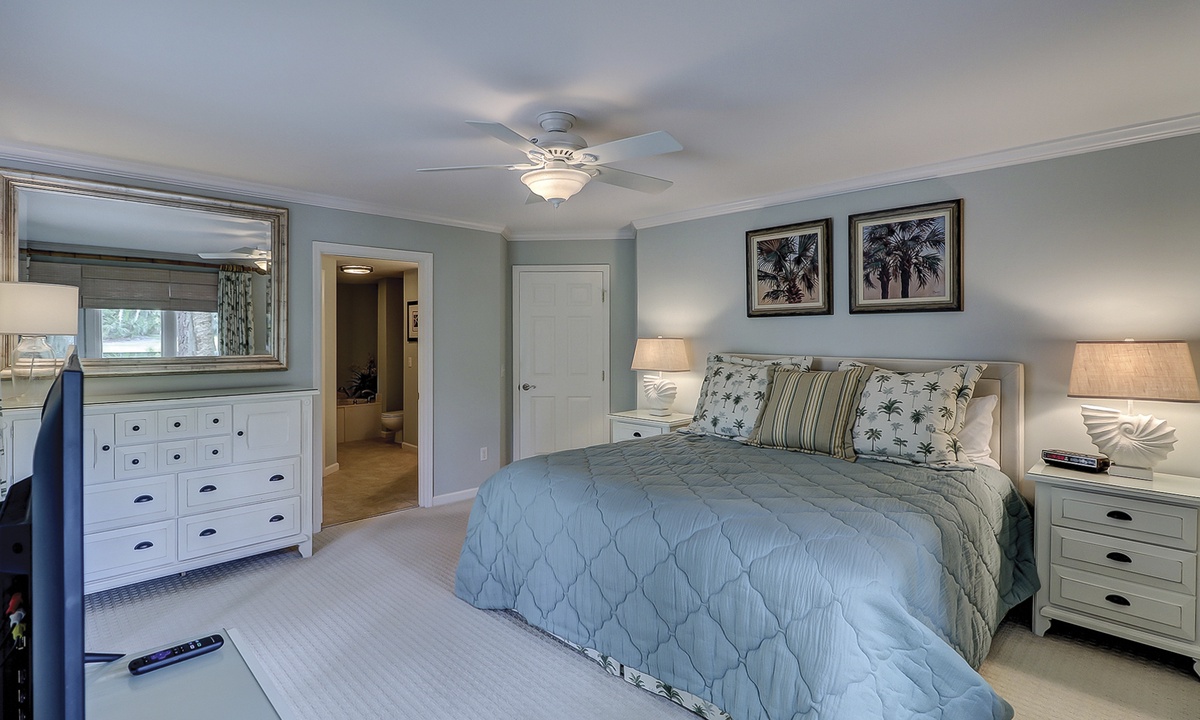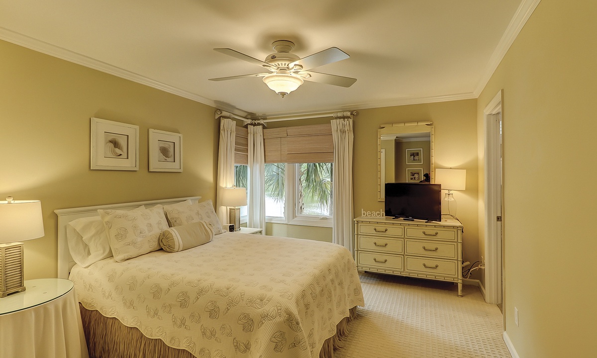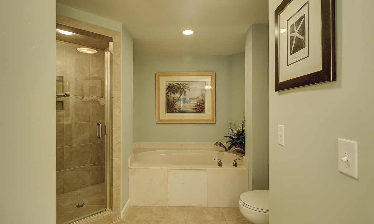 The main bedroom offers the same beautiful views of the golf course and lagoon, while providing guests with a king bed, patio access and a private bathroom with double sinks, a garden tub and a tiled walk-in shower.