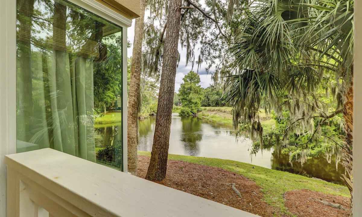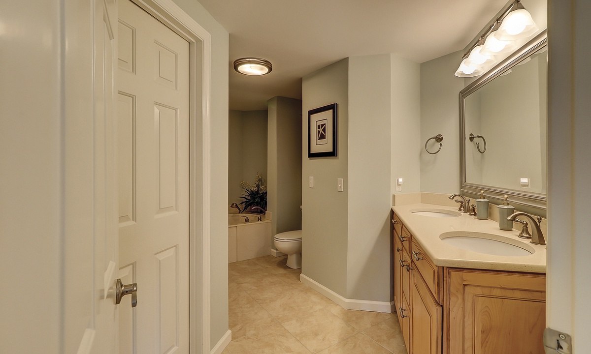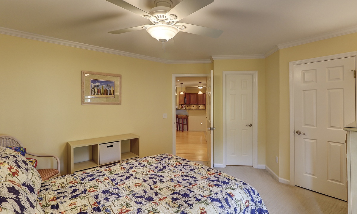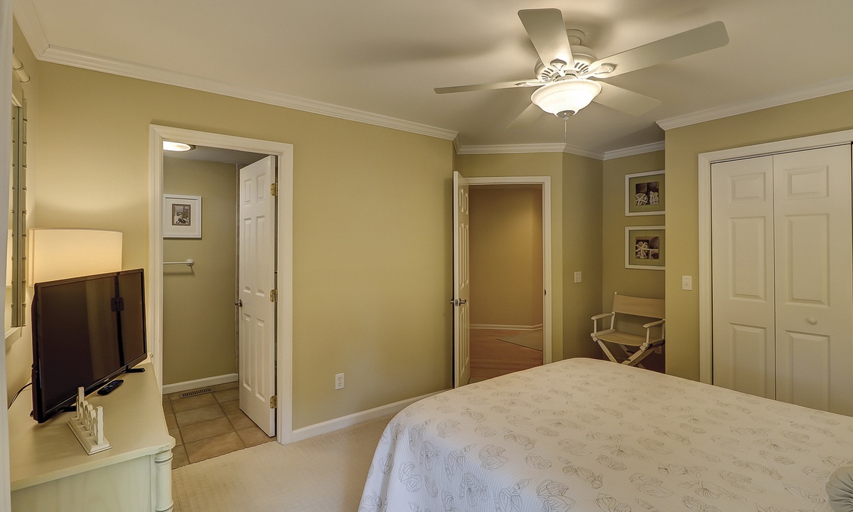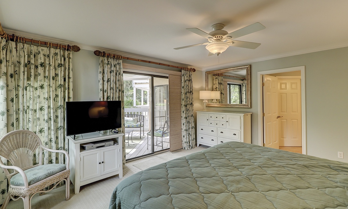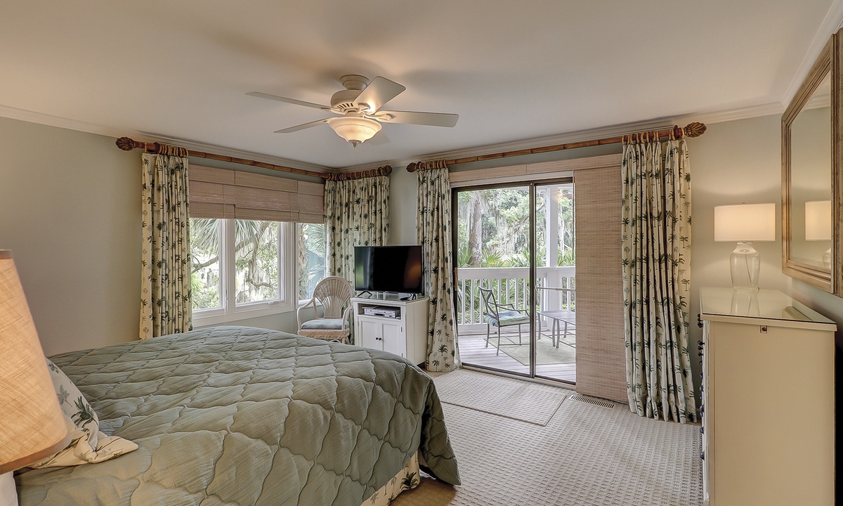 The main bedroom offers the same beautiful views of the golf course and lagoon, while providing guests with a king bed, patio access and a private bathroom with double sinks, a garden tub and a tiled walk-in shower.